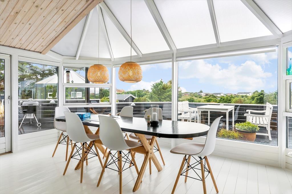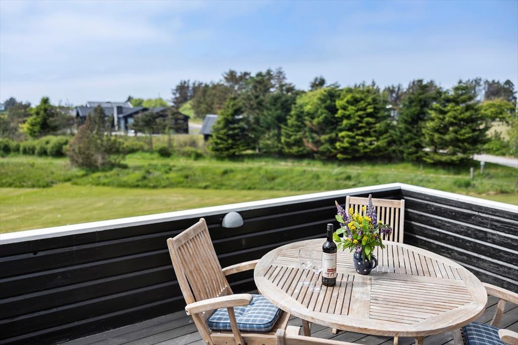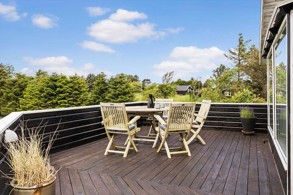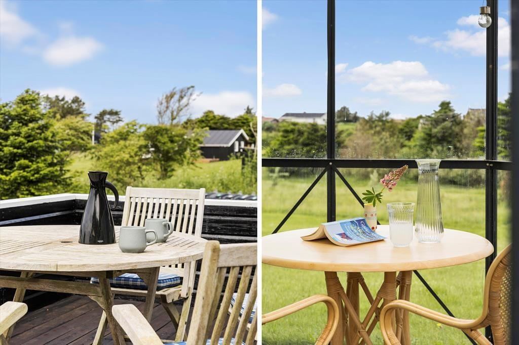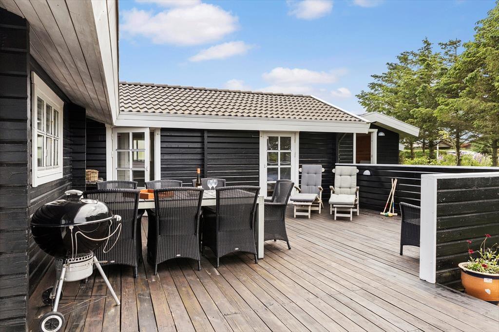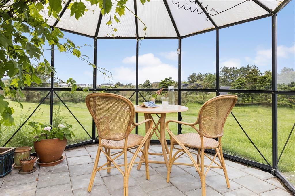Der er flere udgange fra huset til den store terrasse mod sydvest, hvor der både kan findes sol og skygge dagen igennem og helt til solen går ned. Og skøn terrasse mod sydøst, hvor morgenkaffen kan nydes. På en vindblæst dag kan der hygges i havepavillonen med udsigt over landskabet. I rummet forenden af garagen er der havespil til hygge og sjov på græsplænen. Vær obs på at grunden skråner. Der hører naturligvis en grill til huset, så flere af feriens måltider også kan tilberedes udendørs. Det er muligt at lukke terrassen af for mindre hunde.