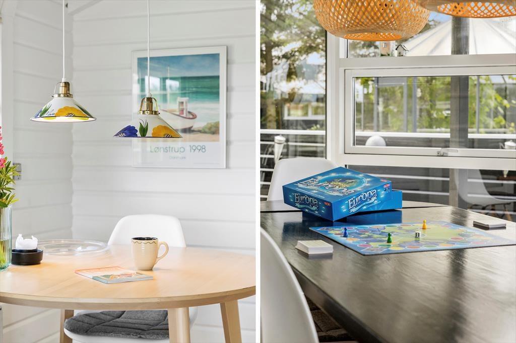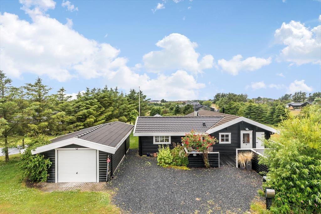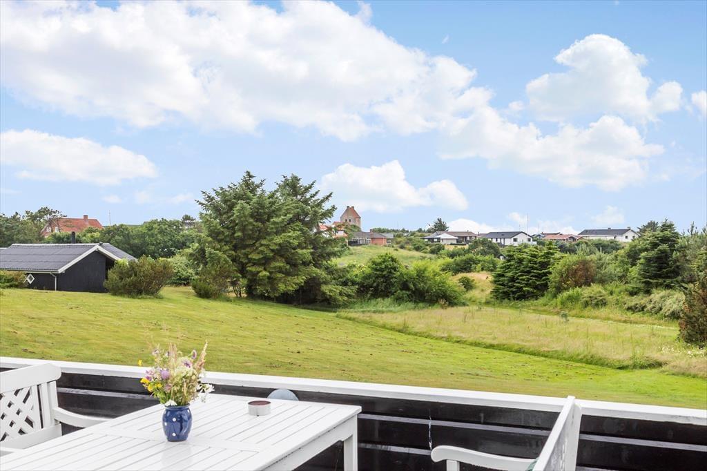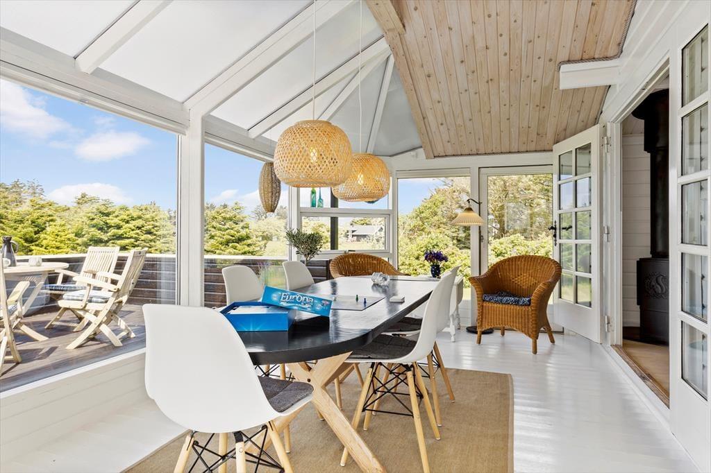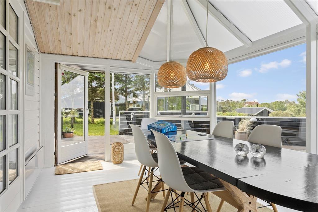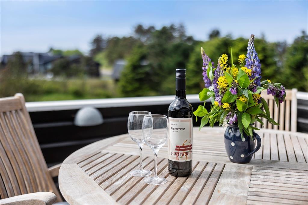 Der er flere udgange fra huset til den store terrasse mod sydvest, hvor der både kan findes sol og skygge dagen igennem og helt til solen går ned. Og skøn terrasse mod sydøst, hvor morgenkaffen kan nydes. På en vindblæst dag kan der hygges i havepavillonen med udsigt over landskabet. I rummet forenden af garagen er der havespil til hygge og sjov på græsplænen. Vær obs på at grunden skråner. Der hører naturligvis en grill til huset, så flere af feriens måltider også kan tilberedes udendørs. Det er muligt at lukke terrassen af for mindre hunde.