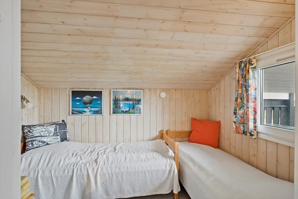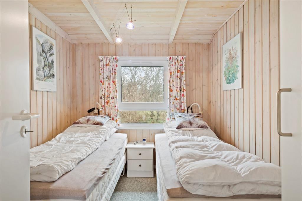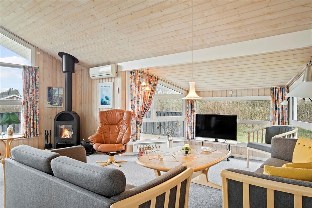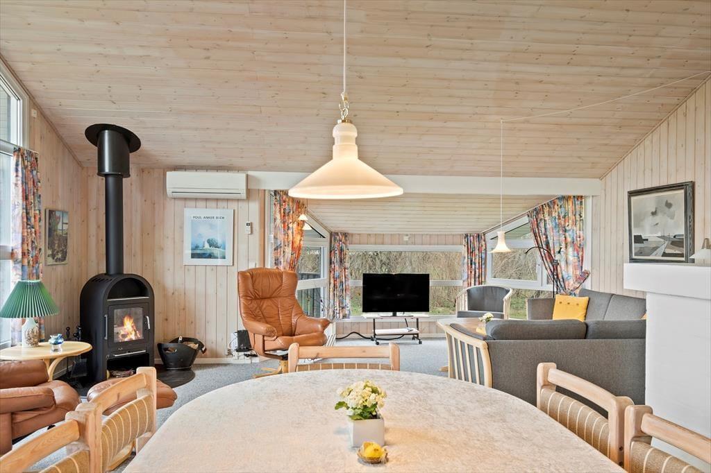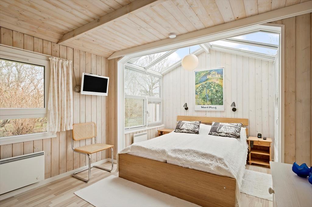 Sommerhuset har en fornuftig planløsning, der gør det muligt at samles op til seks personer inden døre. Hvis du er så heldig at skulle bo på det største af de tre soveværelser, er der god grund til at gå tidligt i seng, for dobbeltsengen er placeret under et ovenlysvindue, så du kan ligge og kigge på stjerner, inden du falder i søvn. I løbet af dagen er det skønt at slappe af i stuen – eventuelt med ild i brændeovnen og duften fra en nybagt kage i det åbne køkken – og du har også mulighed for at forkæle dig selv med et varmt spabad på det rummelige badeværelse.