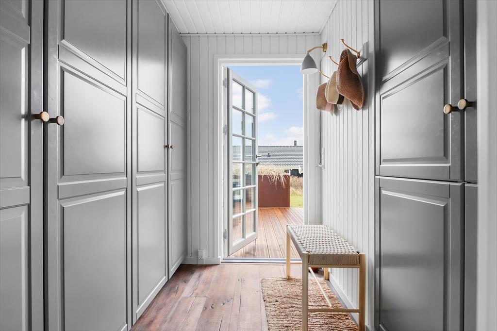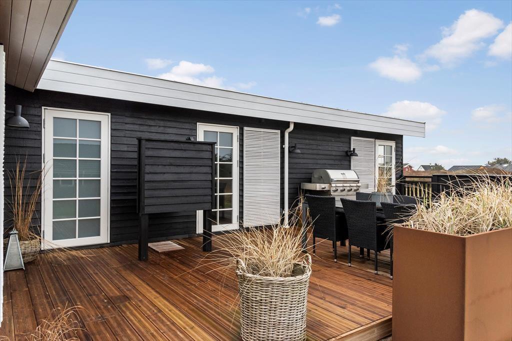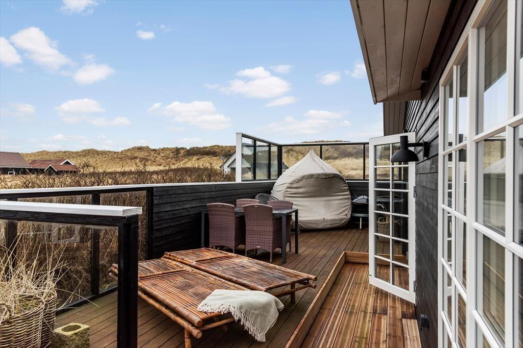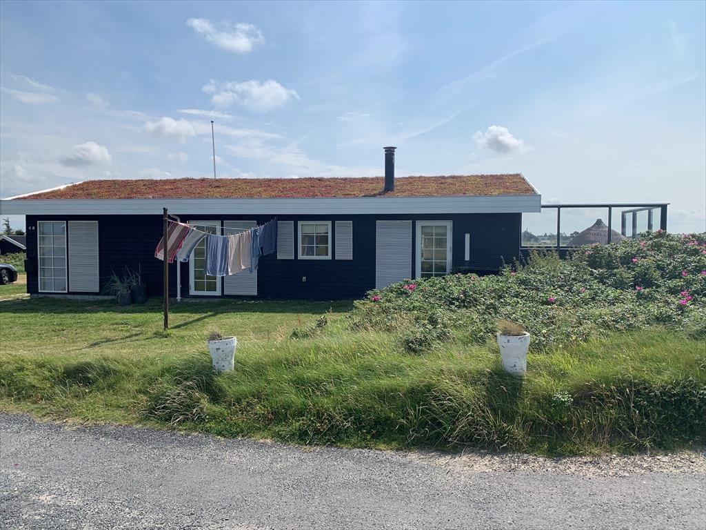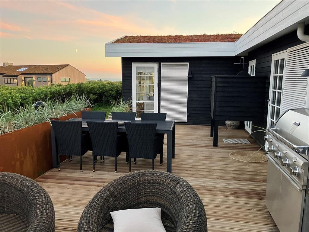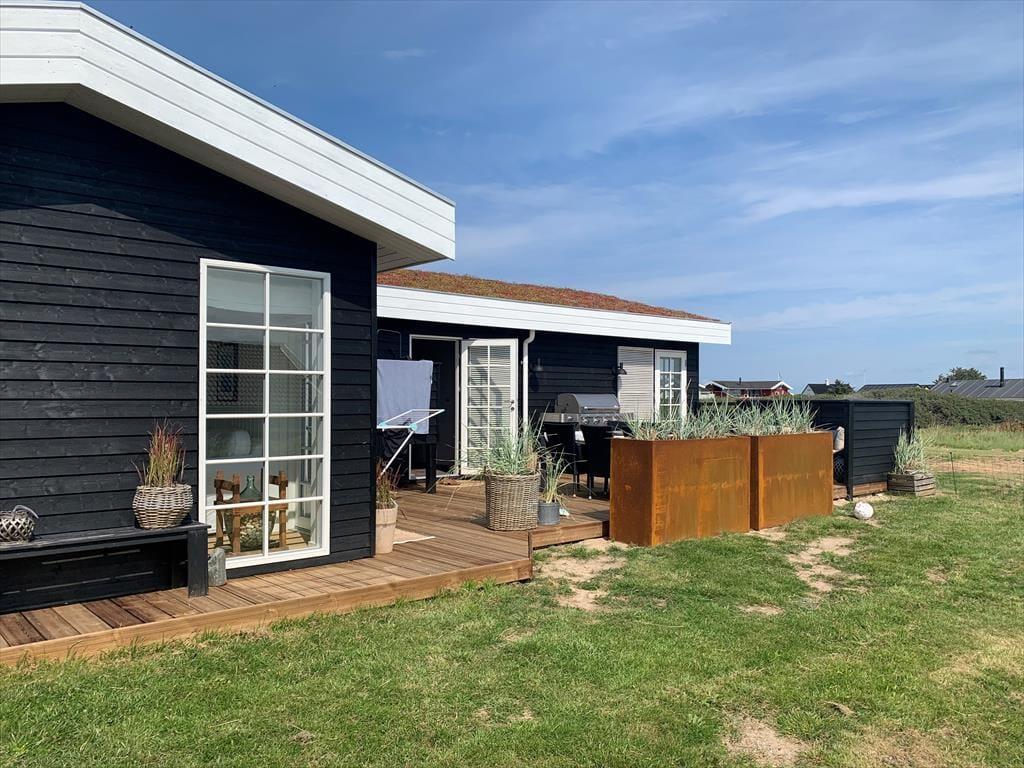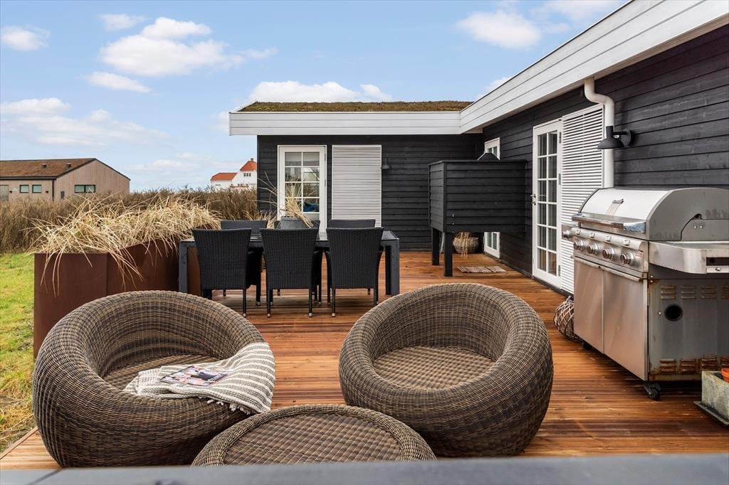 Det velanlagte udemiljø giver masser af muligheder for at nyde de lange feriedage under åben himmel. Den læ fyldte terrasse er et sandt fristed, hvor du kan nyde dagens første kop kaffe, mærke solen varme eller samles til en stemningsfuld middag i aftensolen. Udsigten over havet skaber en beroligende kulisse, mens du slapper af i de komfortable loungemøbler. Haven indbyder til leg og afslapning, og du er kun en kort gåtur fra stranden, hvor du kan dyppe tæerne i det friske vesterhav eller tage en forfriskende dukkert.