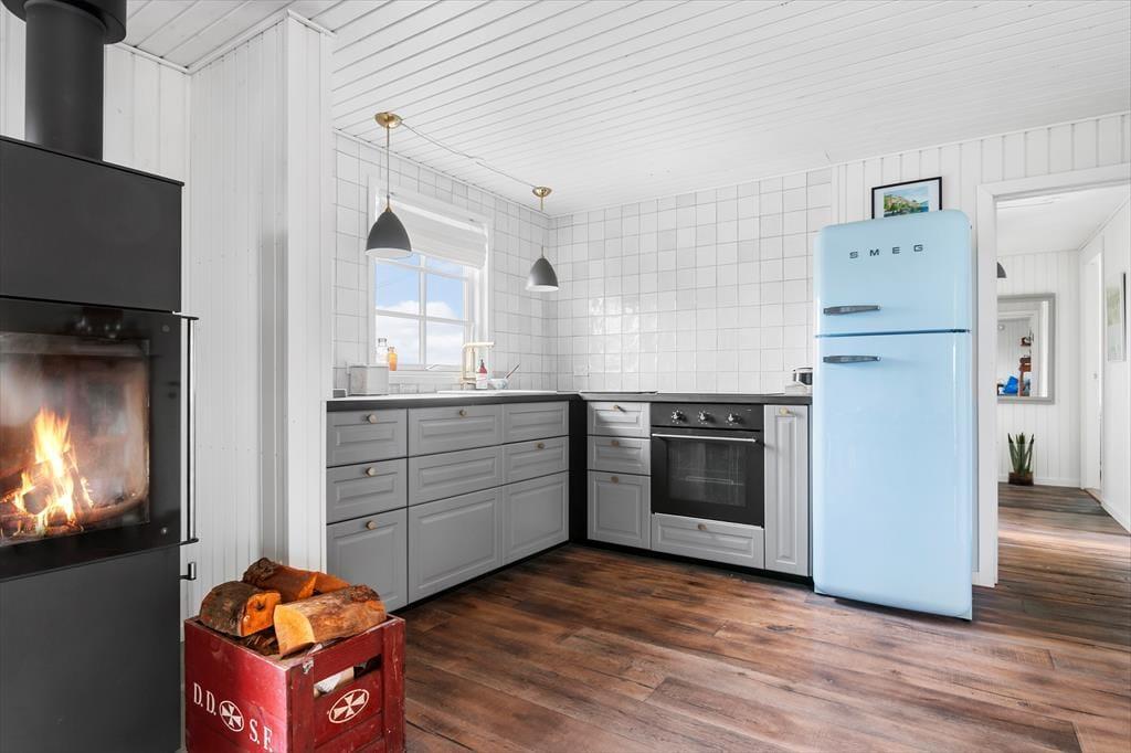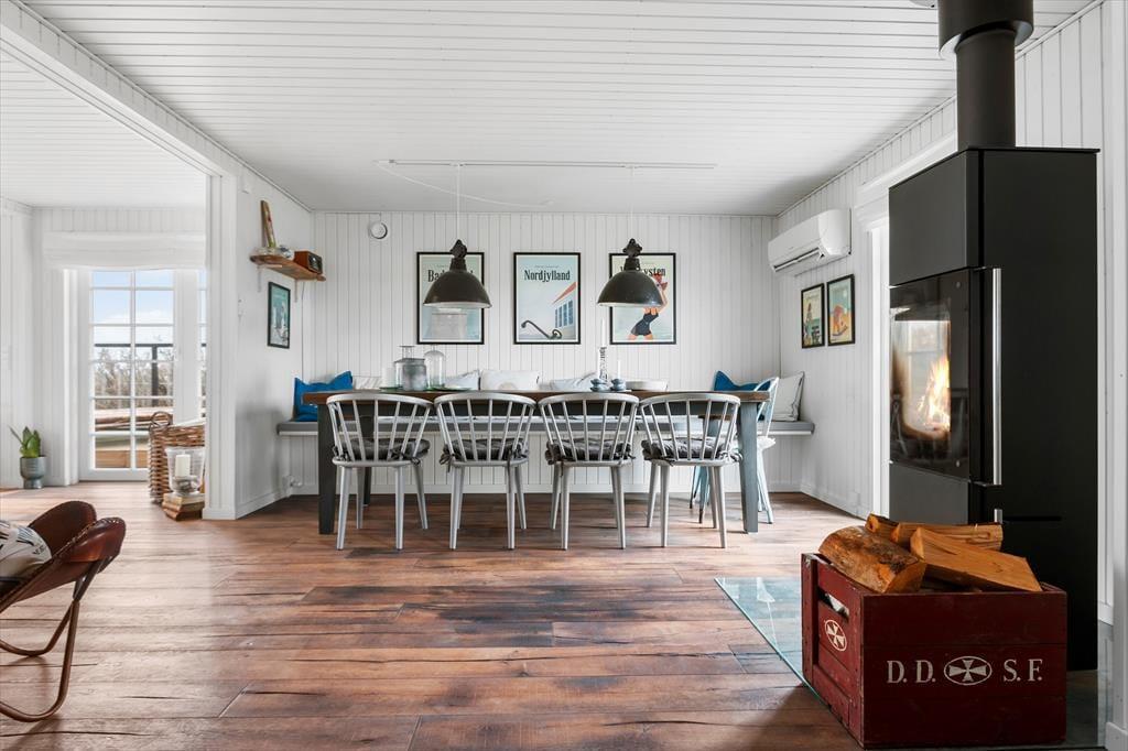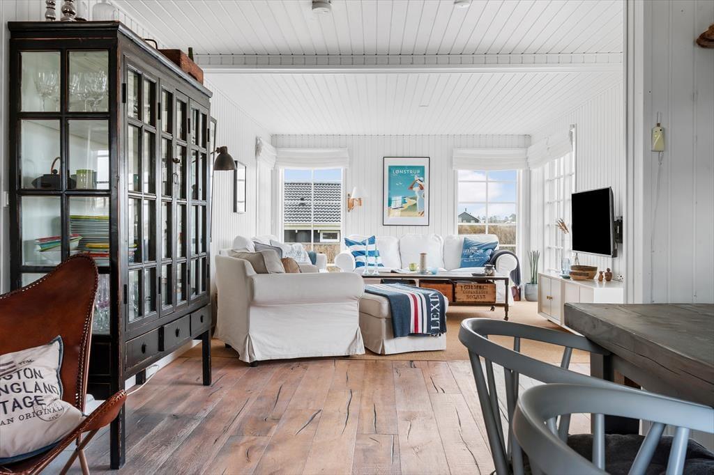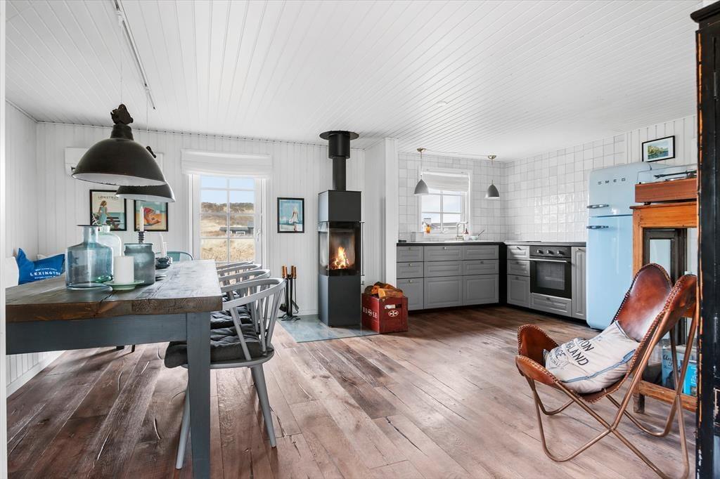 Sommerhuset imponerer fra første skridt ind ad døren med sin unikke kombination af badehus-stil og industrielle New Englænder-detaljer. Vinduespartier lukker lyset ind og giver en betagende udsigt til havet og de charmerende gamle sommerhuse. De stilrene møbler tilfører en lækker, moderne afslappende atmosfære. Stuen er rummelig og indbyder til hyggelige aftener foran brændeovnen, mens det åbne køkken gør det let at være sammen om madlavningen. Her er skabt en perfekt balance mellem komfort og stil, så du kan slappe af i smukke omgivelser.