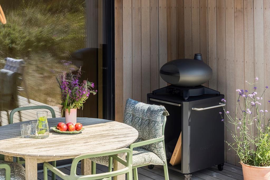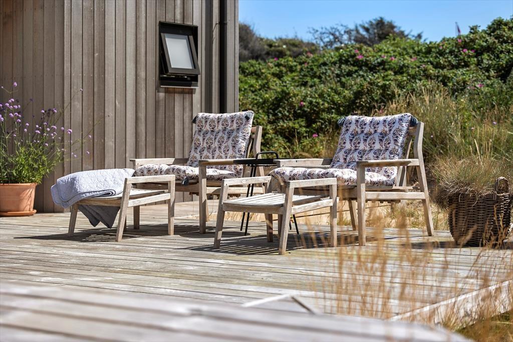 Sommerhusets placering er noget helt for sig selv, og de udendørs omgivelser er skabt til ren afslapning. Fra terrassen kan du nyde det smukke havblik, mens du sidder behageligt i eksklusive loungemøbler. Den korte afstand til stranden gør det let at tage en morgendukkert eller en aftentur langs vandet, mens solen går ned i horisonten. Træd ud i den friske luft, nyd en kop kaffe i morgensolen eller tænd op i grillen til en hyggelig middag med familien. Her får du mulighed for at opleve det bedste af Vesterhavets skiftende stemninger og finde ro i de naturskønne omgivelser.
