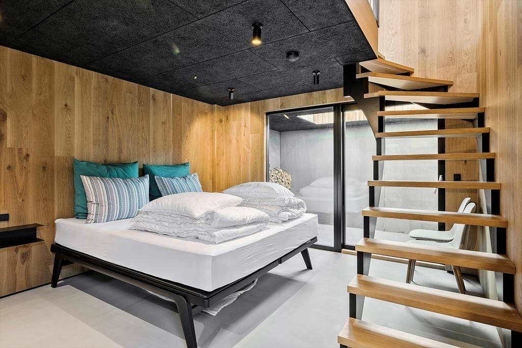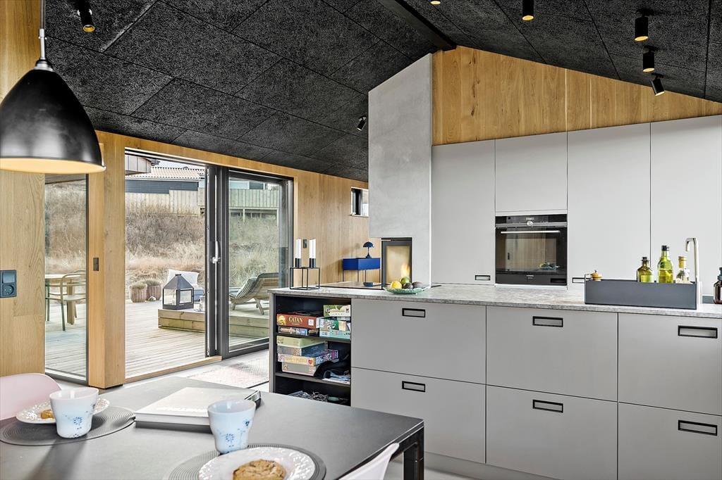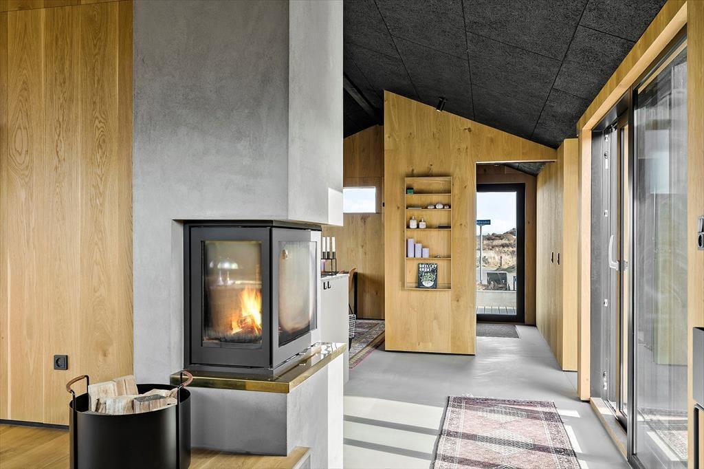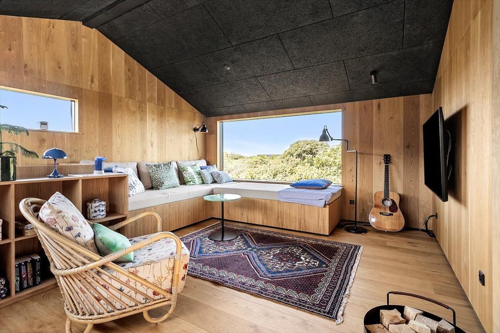 Indretningen af sommerhuset er gennemført med materialer af højeste kvalitet og en stil, der emmer af luksus og elegance. De store vinduer lader havblikket være en konstant del af opholdsrummet, og det stilrene interiør skaber en harmonisk atmosfære. Huset er indrettet i flere niveauer, hvilket giver en dynamisk og rummelig følelse. I den åbne opholdsafdeling forenes stue, spisestue og køkken i et indbydende rum, hvor brændeovnen tilføjer ekstra hygge. Køkkenet er designet til madelskeren med moderne faciliteter, der gør det til en fornøjelse at tilberede friske råvarer fra lokale producenter. De smukke soveværelser byder på komfortable senge og en rolig atmosfære, så du kan vågne veludhvilet op til lyden af Vesterhavets brusen.