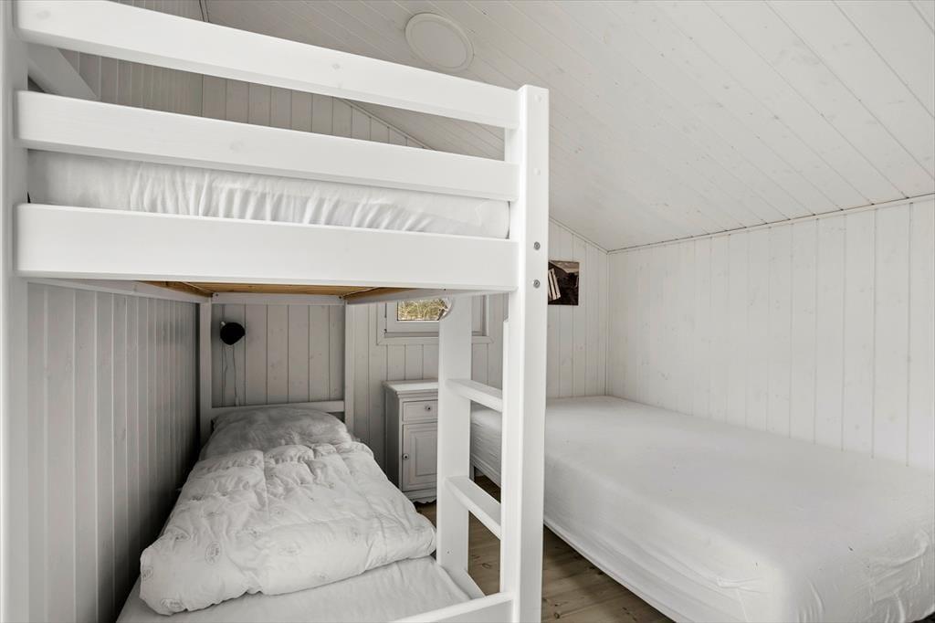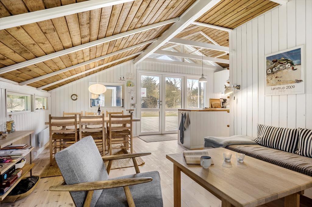 Inden døre bliver du budt velkommen af en hyggelig og hjemlig sommerhusstemning. Her er der loft til kip, træbeklædte vægge og et indbydende opholdsrum, hvor stue og køkken ligger i åben forbindelse. Brændeovnen skaber en dejlig varme på de køligere dage, og de store vinduer lukker masser af naturligt lys ind, så du får en fornemmelse af at have naturen helt tæt på. De bløde sofaer indbyder til afslapning, mens spisebordet samler familien til hyggelige måltider og lange samtaler. Sommerhuset har flere gode soveværelser, så alle kan finde sig godt til rette efter en dag med feriesysler.