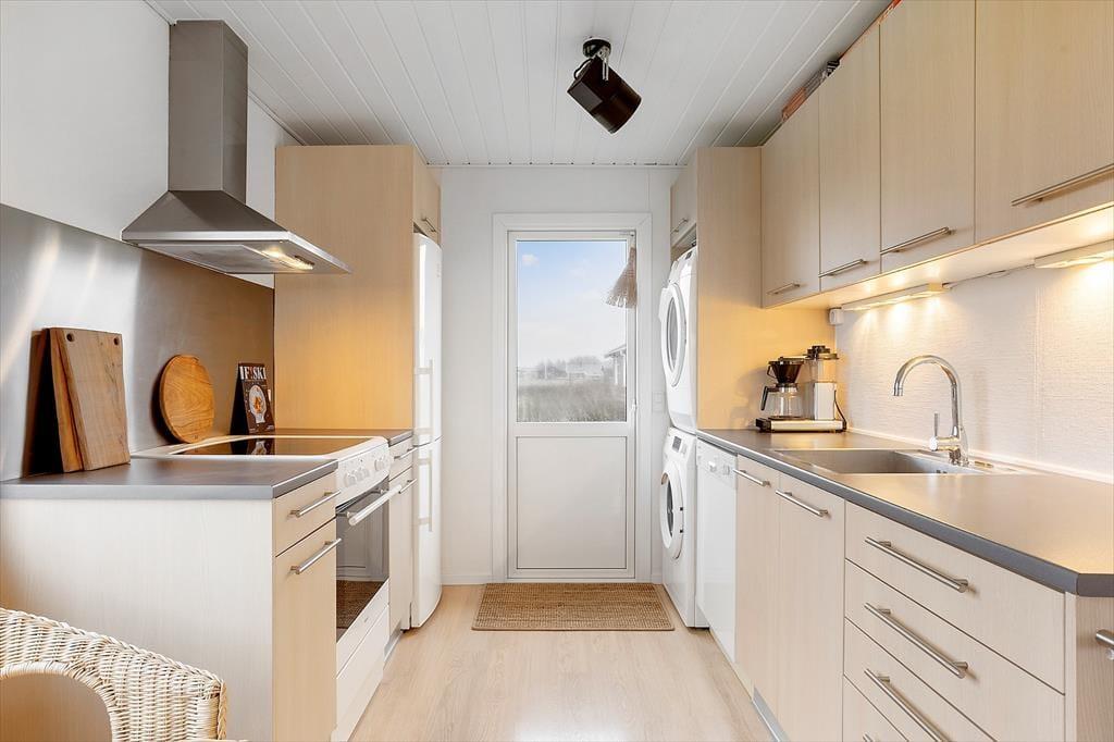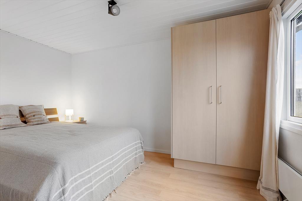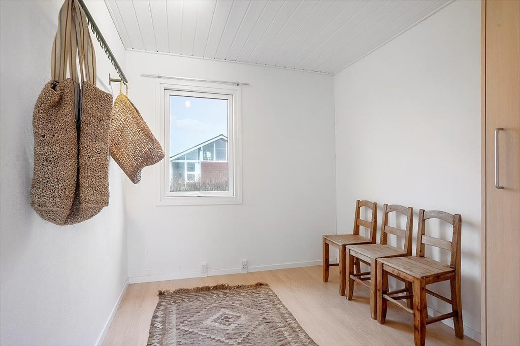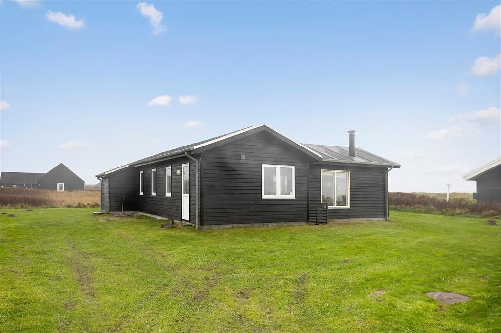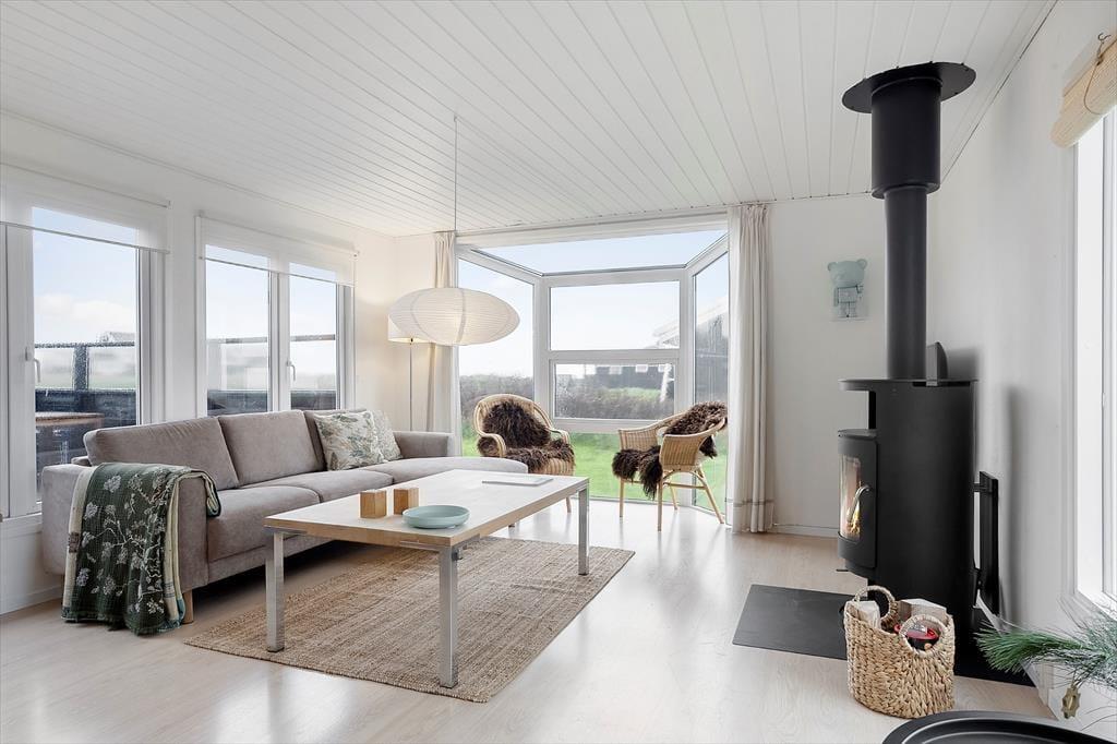 Sommerhusets terrasse inviterer til mange timer under åben himmel, uanset om dagen begynder med en stille kop kaffe eller slutter med et glas vin i den milde aftensol. Her kan du mærke den friske Vesterhavsluft, høre mågerne kalde og indimellem fange glimt af havet ved klinten. Kun 200 meter fra huset finder du trappen ned til stranden – og du kan næsten fornemme sandet mellem tæerne allerede, når du står på terrassen og kan høre bølgerne rulle ind over kysten. Herfra er turen ned til vandet en naturlig del af dagen, uanset om du er til morgendukkert, strandture i blæsevejr eller en gåtur i aftenskumringen. Når solen står højt, er terrassen et oplagt sted at læne sig tilbage i en solstråle, og på de lune dage kan du nyde måltiderne udendørs, mens du lader feriefreden sænke sig.