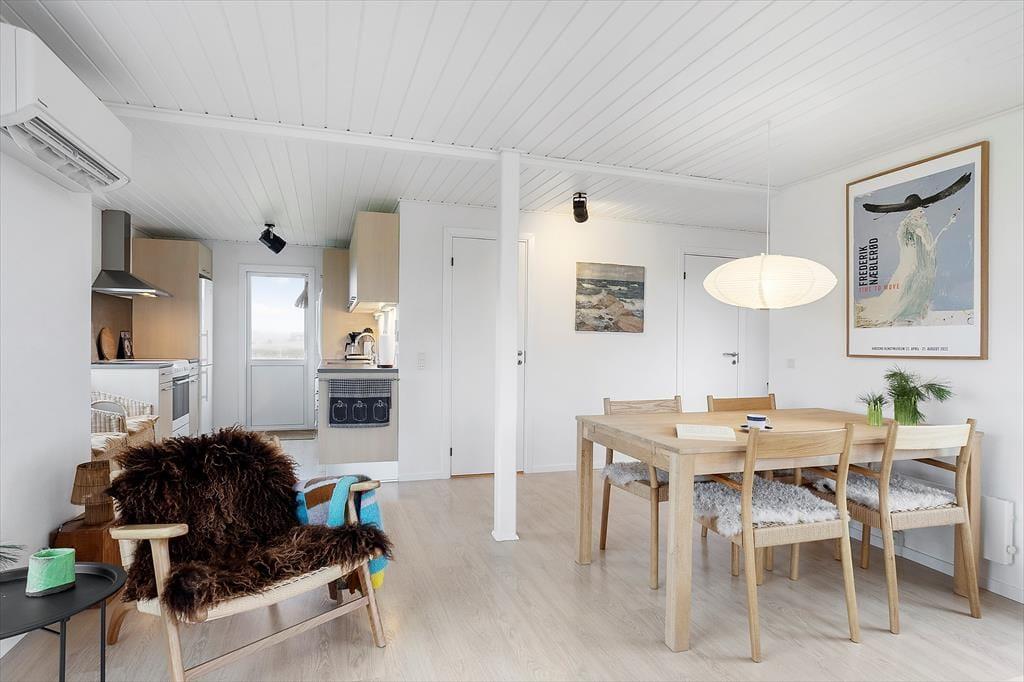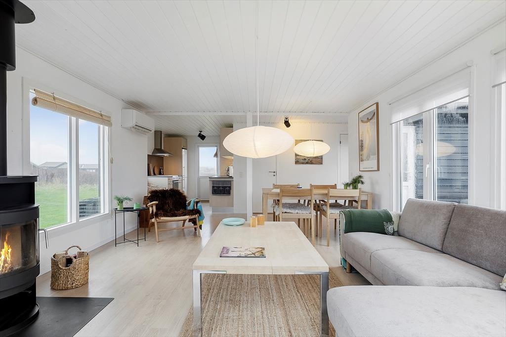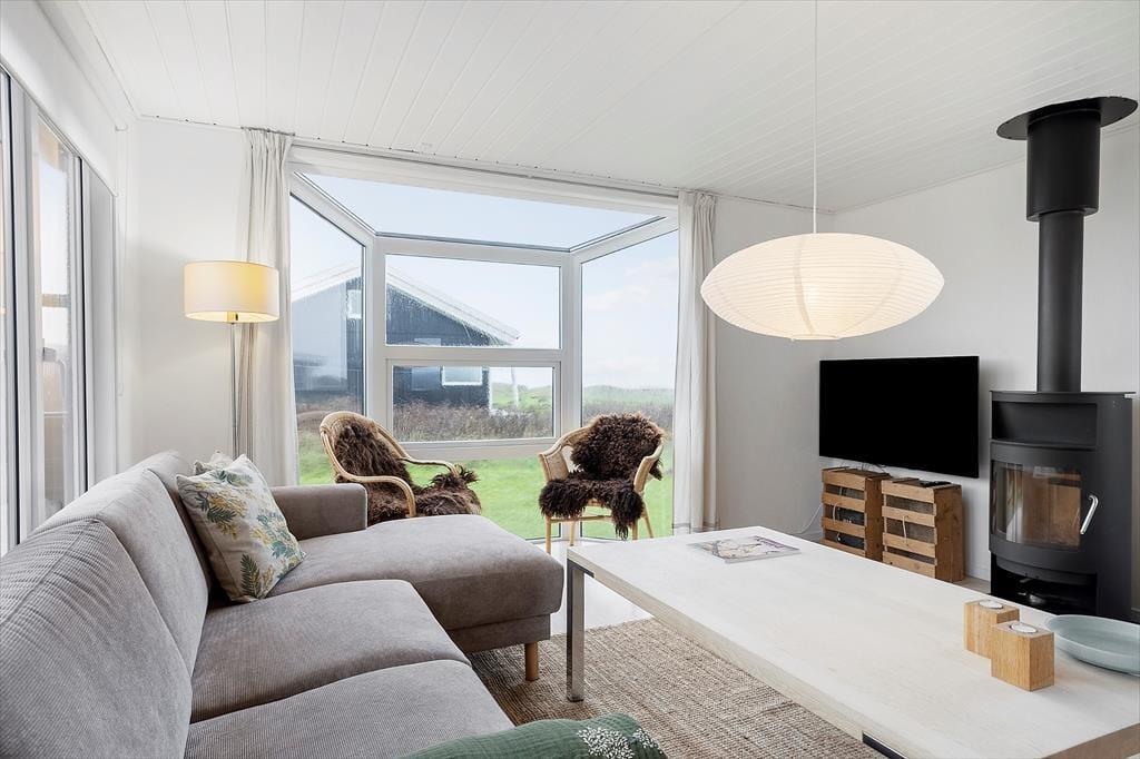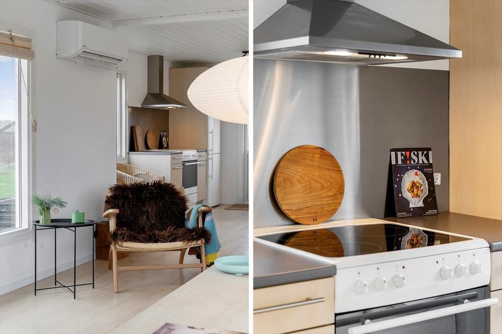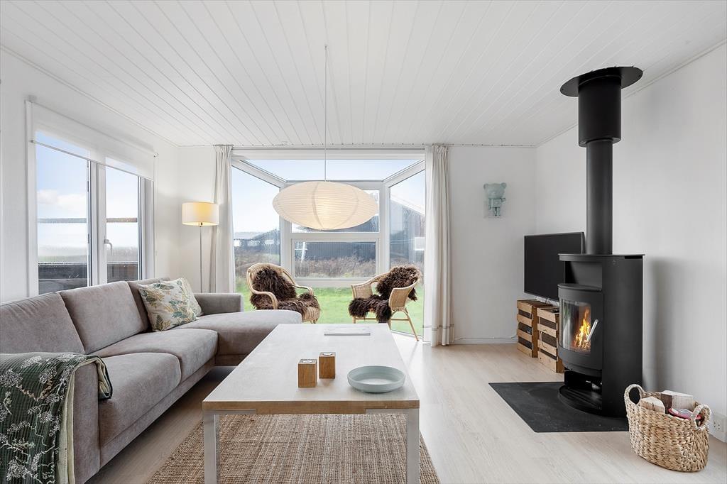 Indenfor bliver du mødt af en varm og indbydende atmosfære, hvor den enkle indretning og lysindfaldet tilsammen skaber den helt rigtige feriestemning. Stuen er husets naturlige samlingspunkt med sin hyggelige indretning, og når flammerne i brændeovnen knitrer, er det tid til at sænke skulderne og mærke roen. Flere steder fra huset kan du lade blikket glide ud mod havet, og på stille dage kan du måske endda ane det karakteristiske blå skær helt inde fra sofaen. Køkkenet ligger i naturlig forlængelse af opholdsrummet, så du nemt kan vende dagens oplevelser med hinanden, mens du forbereder et godt måltid baseret på lokale råvarer. Uanset om du læser en bog, lytter til havets sagte brusen eller bare nyder roen, er rammerne her inden døre skabt til afslapning i et tempo, hvor feriesindet hurtigt falder på plads.