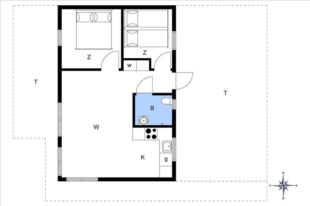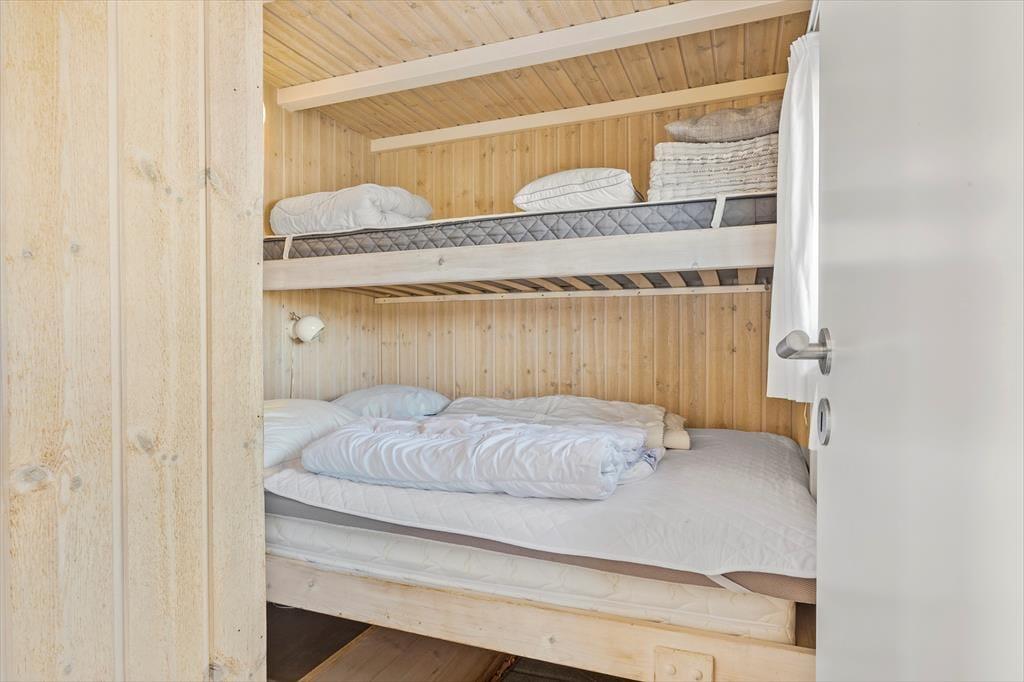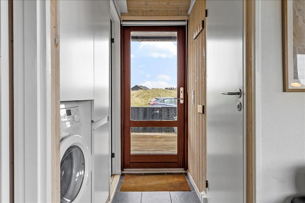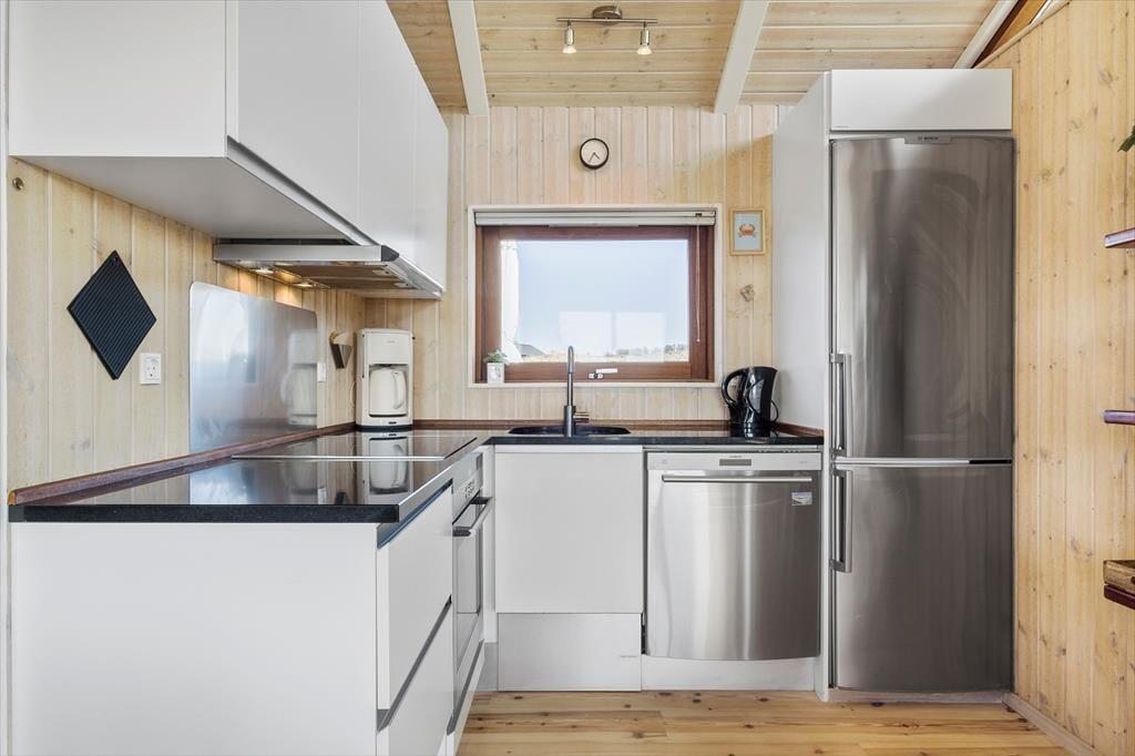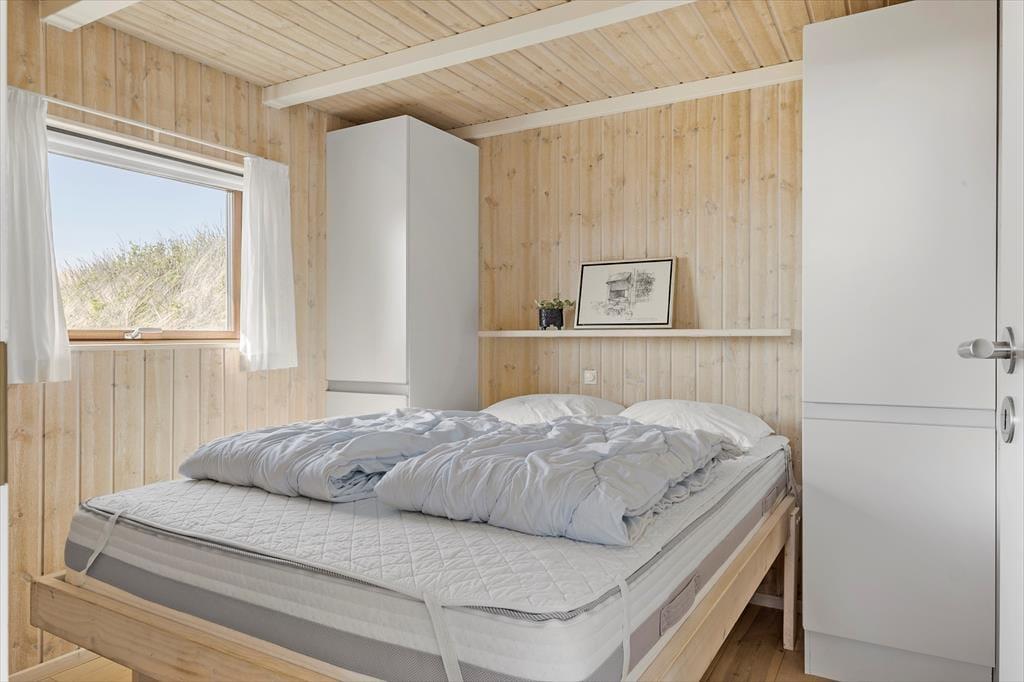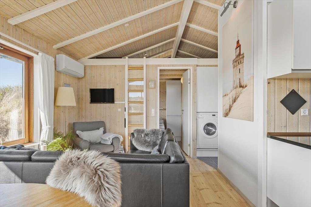 Dette sommerhus er beviset på, at småt å absolut kan være godt! I de 42m2 kan I være sikre på at få en god og afslappende ferie, uanset om I er en lille familie eller et par, som bare gerne vil være sig selv og være tæt på både stranden og byen. Til højre for entreen ligger to værelser med hhv. en dobbeltseng og en dobbeltseng med en køje over, og til venstre finder I badeværelset med bruser og gulvvarme. Om hjørnet er det åbne og sammenhængende køkken-opholdsrum med store vinduer og en dejlig udsigt over klitterne og kig til det blå Vesterhav. Takket være den gode udnyttelse og moderne indretning af alle m2 er her blevet plads til både vaskemaskine, tørretumbler og opvaskemaskine, så I ikke skal bruge længere tid end normalt på de praktiske gøremål. Endelig er sommerhuset tilkoblet fællesantenne, så I har adgang til mange danske, skandinaviske og tyske tv-programmer, og medbringer i pc eller tablet hjemmefra, har i fri adgang til det trådløse internet. Et skønt sommerhus med en god kombination af hygge, funktionalitet og afslappende stemning!