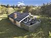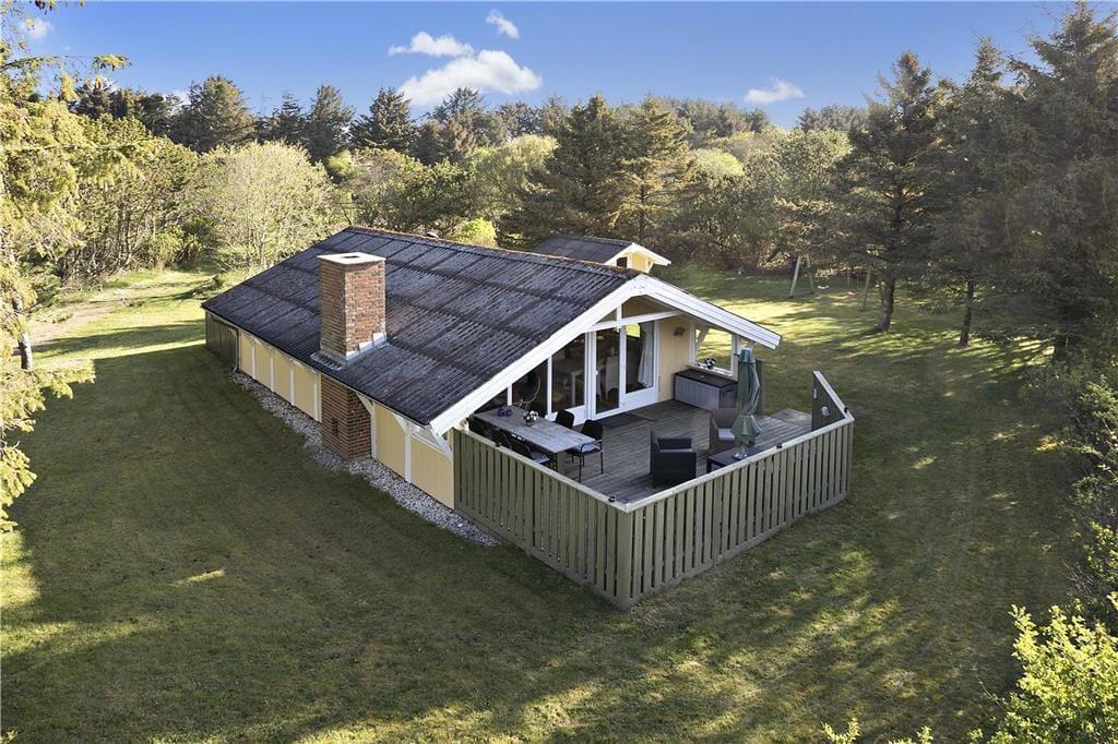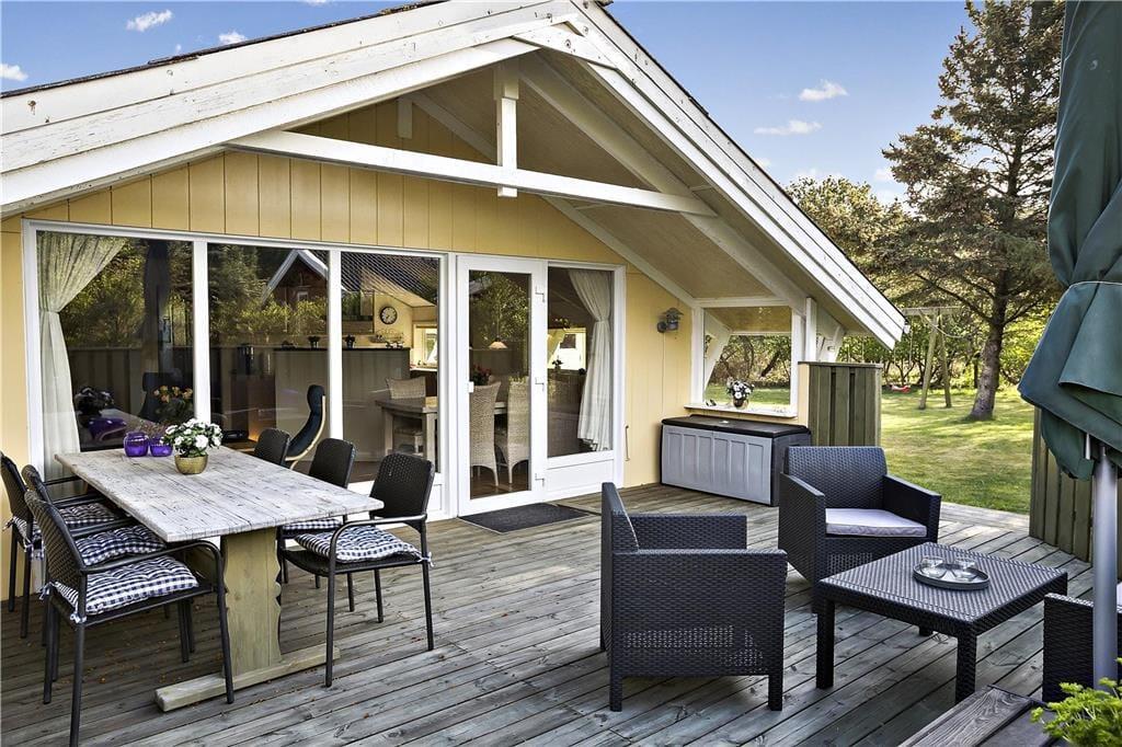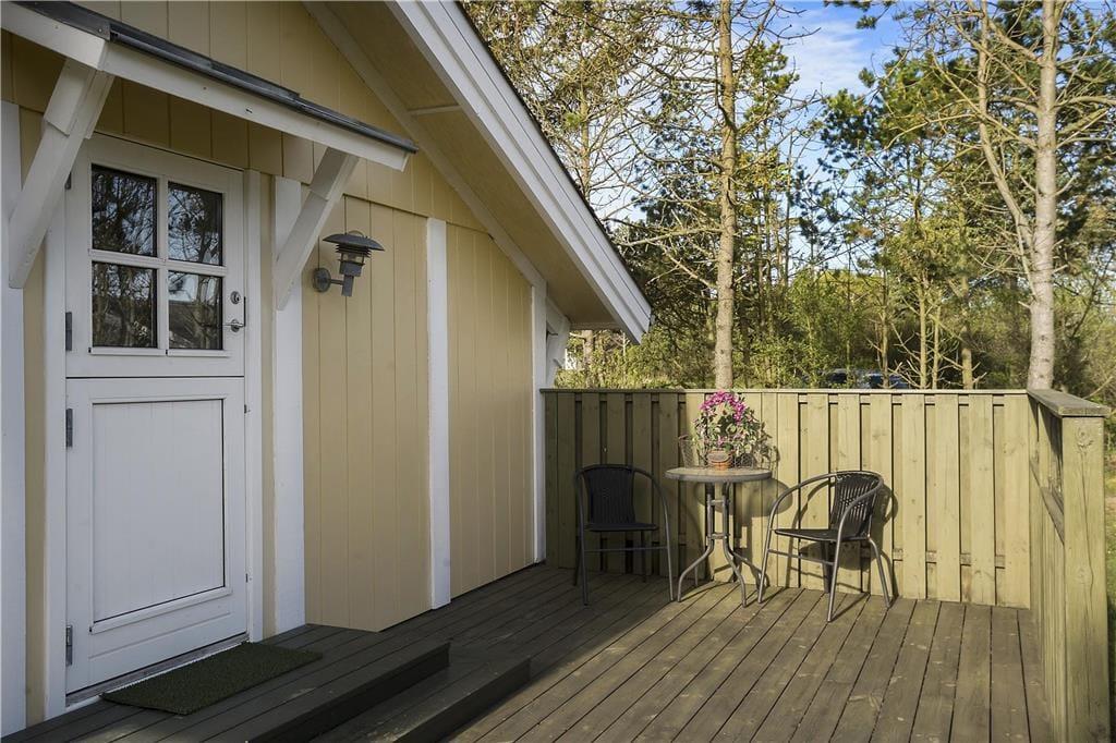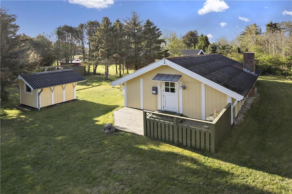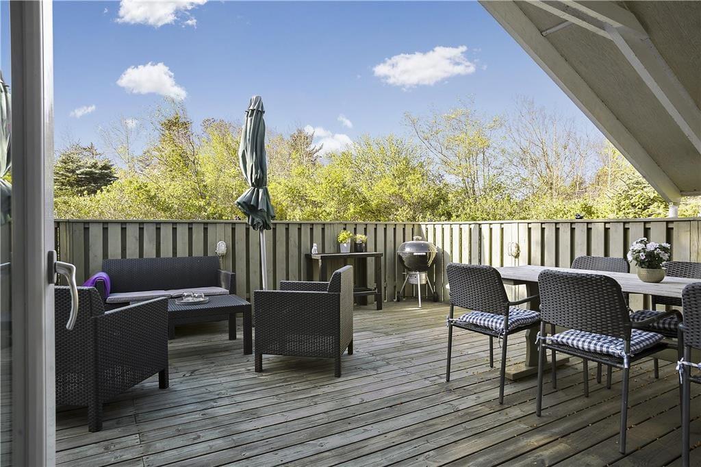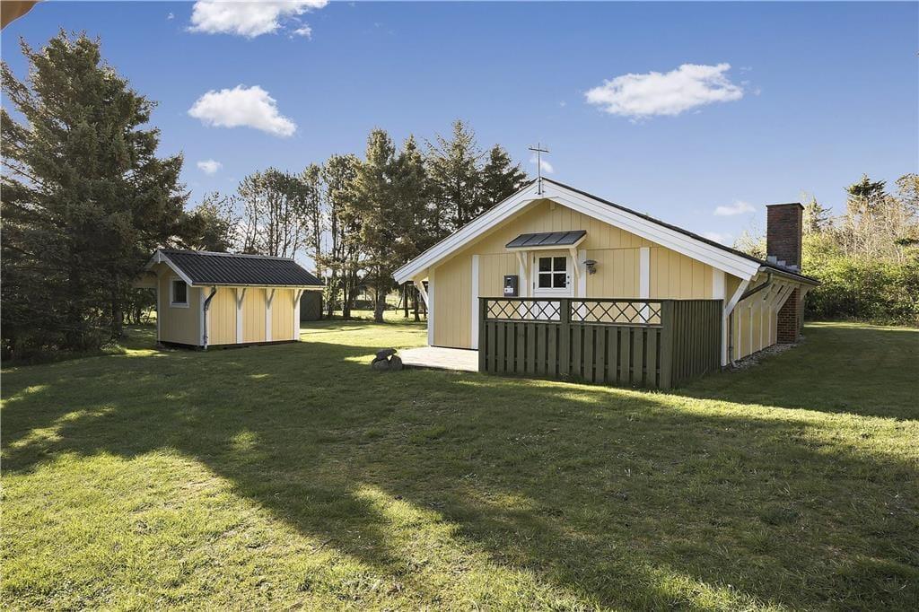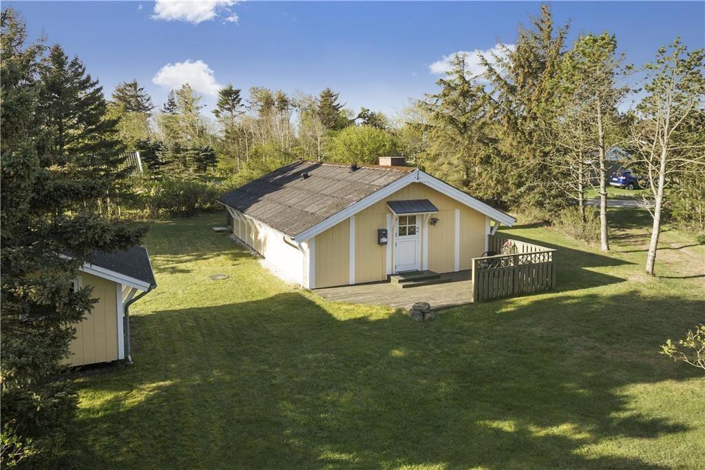 Sommerhuset ligger på en rolig havegrund med plæne og godt afskærmet af høje træer. Til børnene er her gyngestativ, mens de voksne kan tage en dyst eller to på petanquebanen. Mod vest og med udgang fra stuen ligger en dejlig terrasse med en overdækket del; her er lagt op til mange hyggelige stunder, både i løbet af dagen og på de lange, lune aftener.
