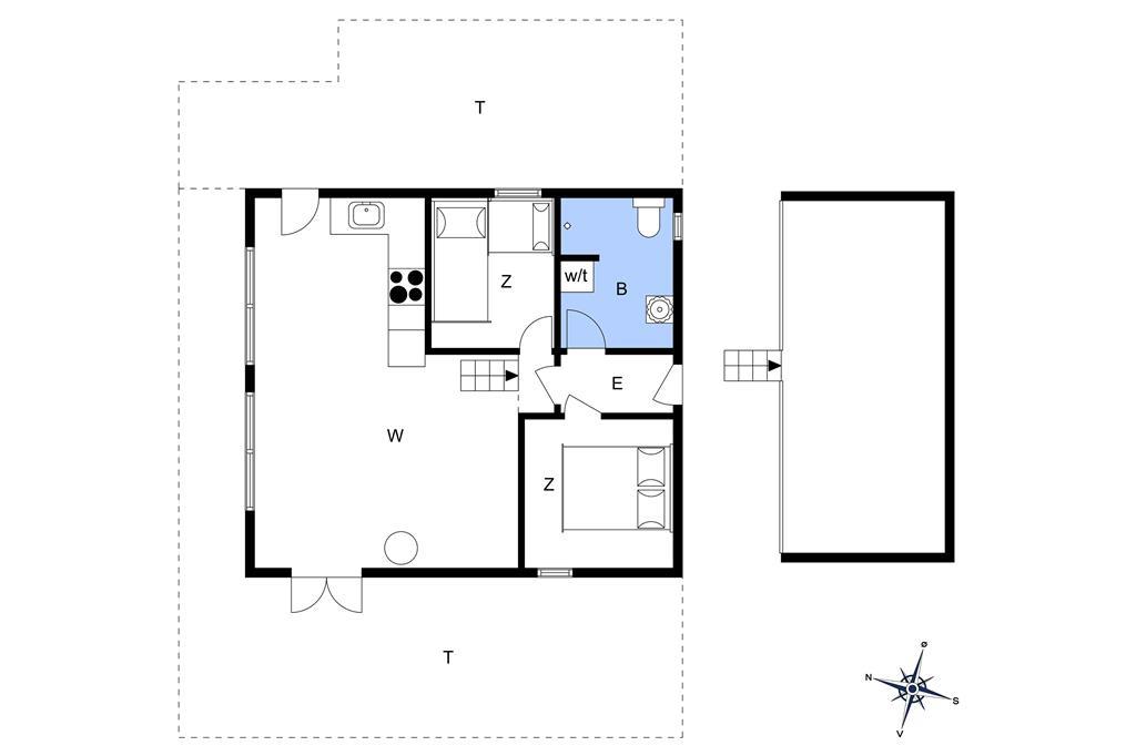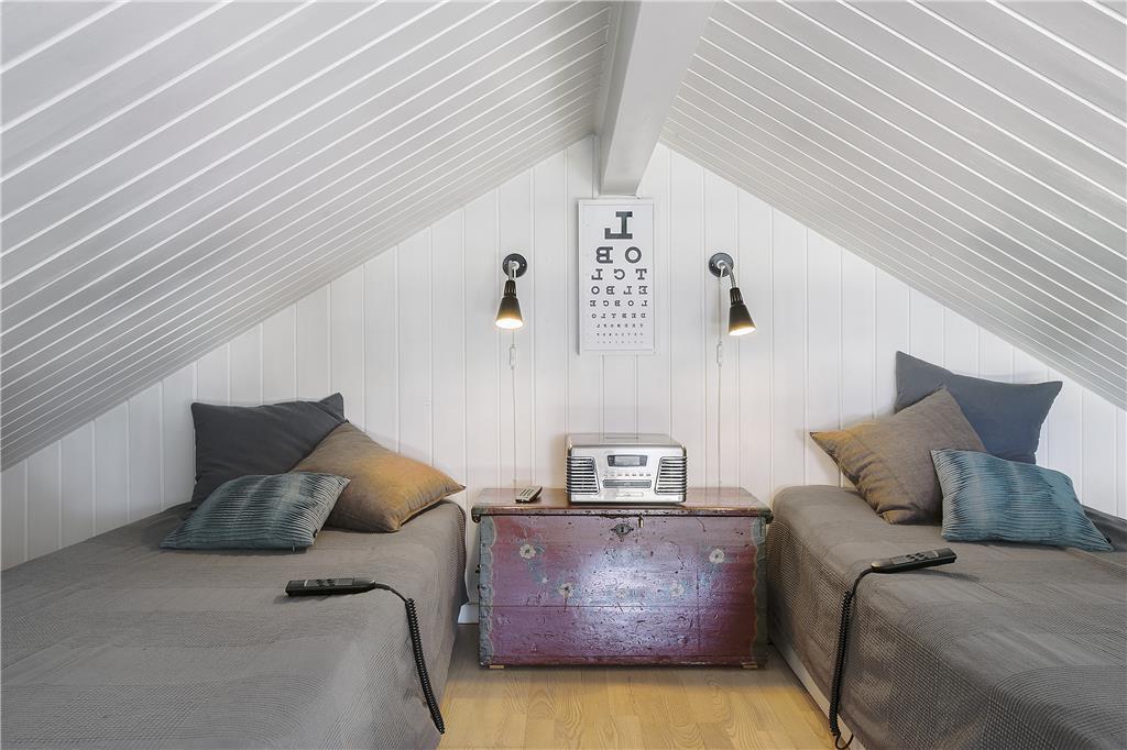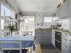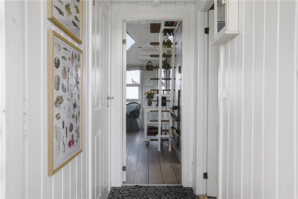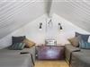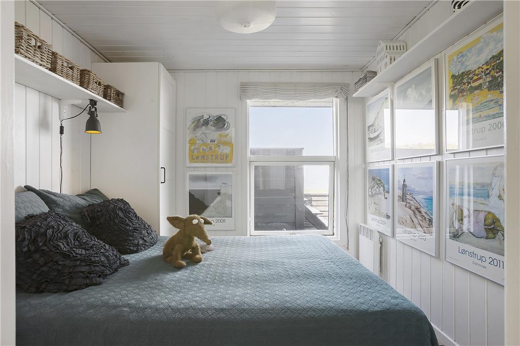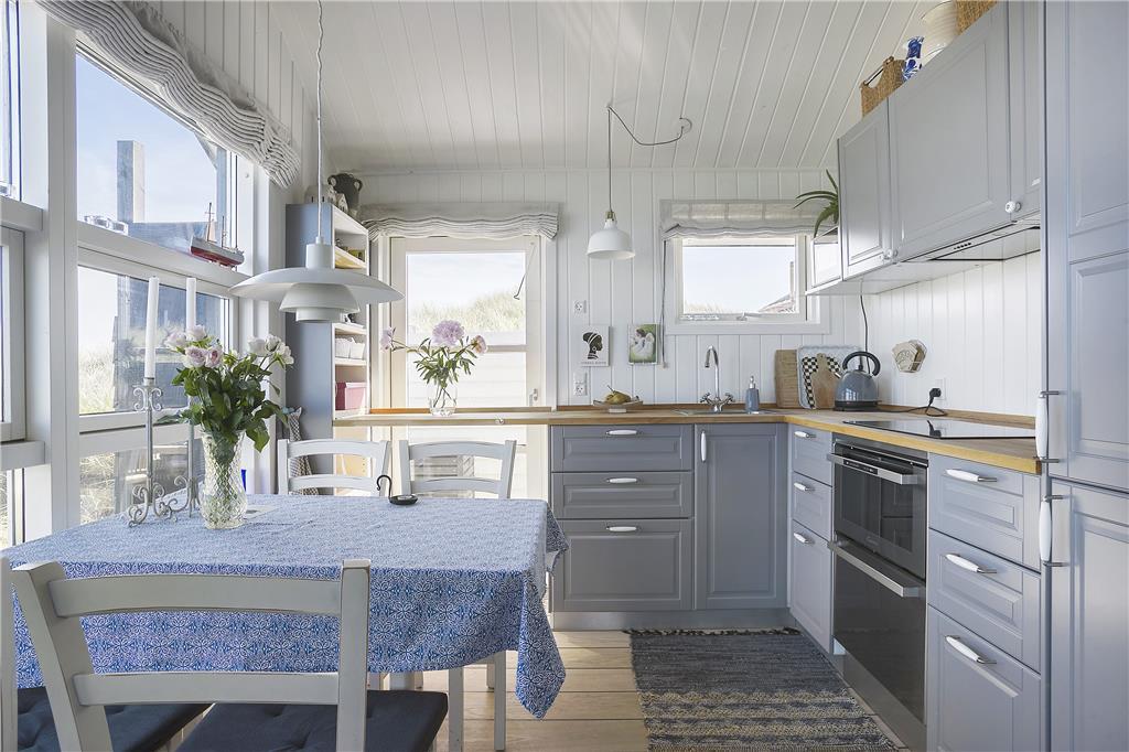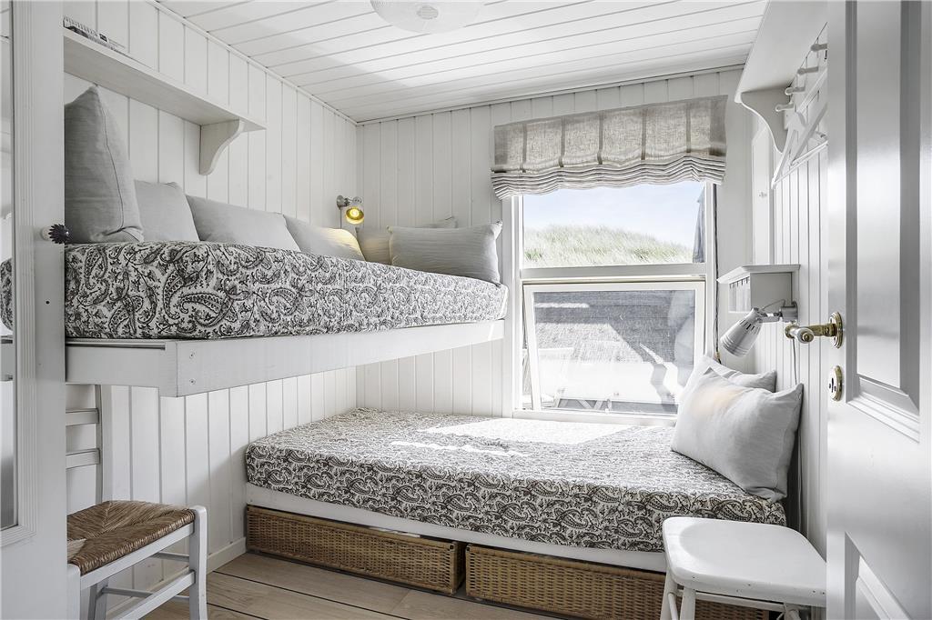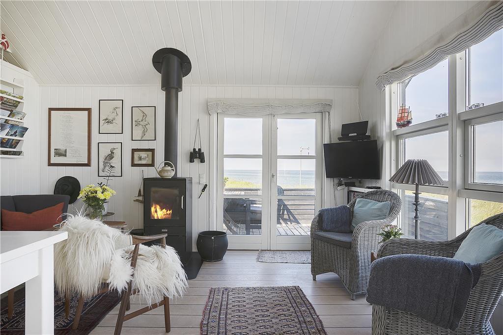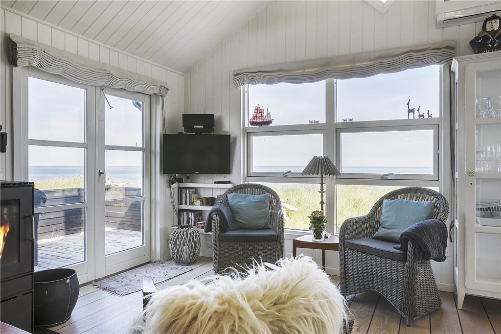 Sommerhusets køkken er kombineret med stuen. Overalt er et skønt lysindfald fra de store panoramavinduer og den smukkeste udsigt man kan forestille sig. Stuen er lyst og moderne indrettet i en afslappet vestkyst stil. Her er brændeovn som giver en hyggelig stemning og en god varme til kølige dage. Der er to soverum i stueplan. Et med dobbeltseng og et med en enkeltseng med en køje over. Over stuen er en hyggelig hems med to enkeltsenge. Badeværelset er lyst og har både vaskemaskine og tørretumbler.