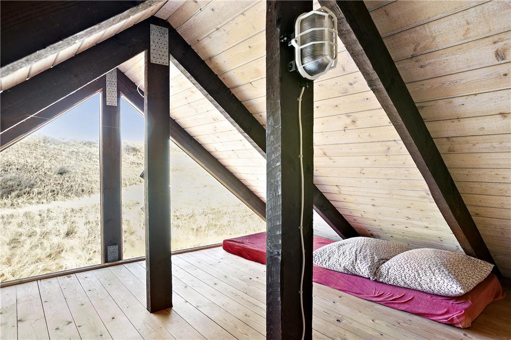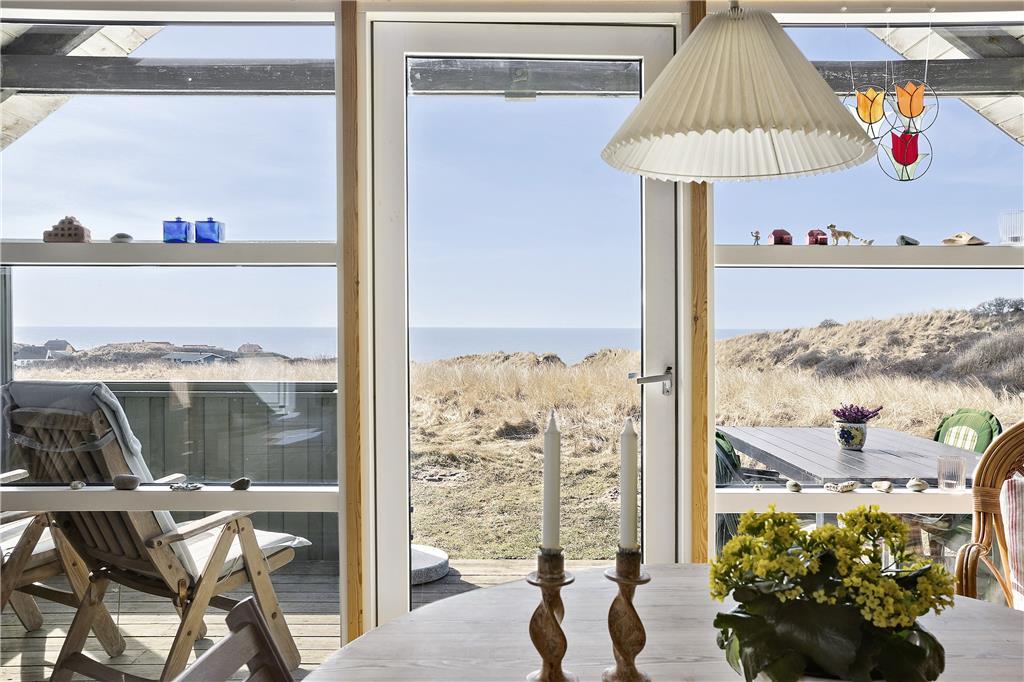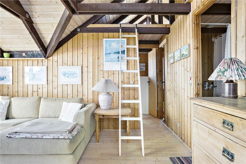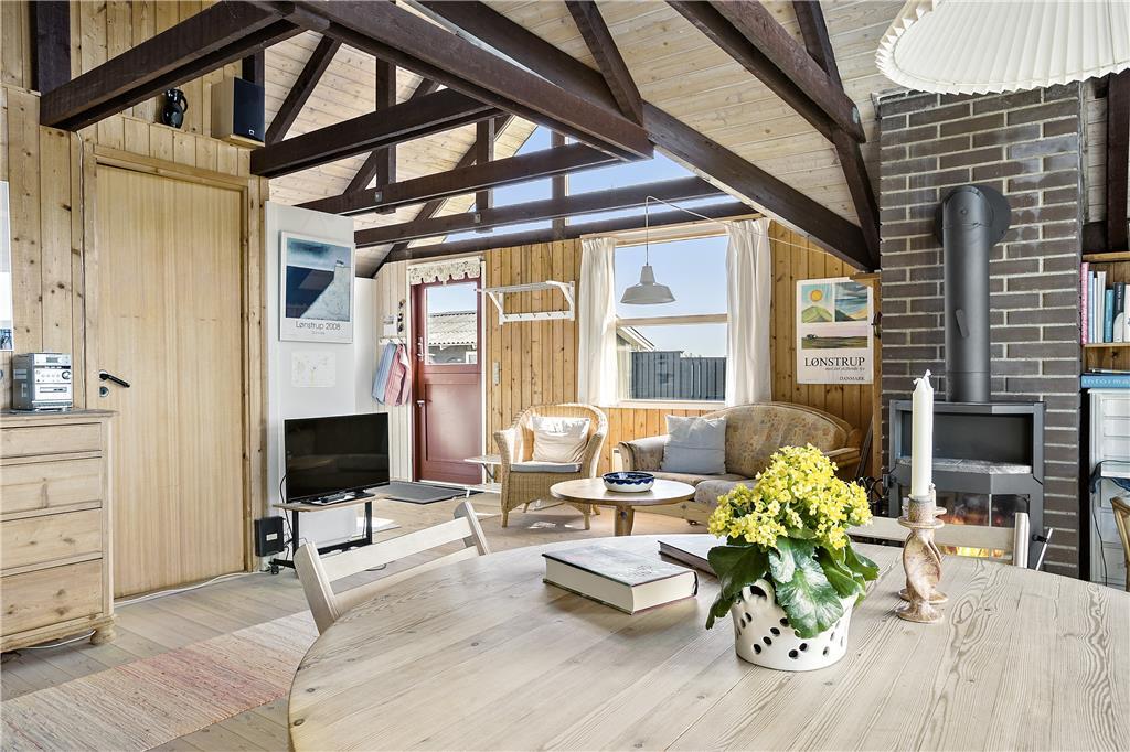 Man træder ind i sommerhusets lyse køkken som ligger i åben forbindelse til den hyggelige stue som er holdt i træ med loft til kip og fritlagte bjælker. Der er store vinduer ud mod havet, som giver et dejligt lysindfald og en fantastisk udsigt over havet, Rubjerg Knude og de små fiskerhuse i Lønstrup by. Brændeovnen fuldender den gode sommerhusstemning.