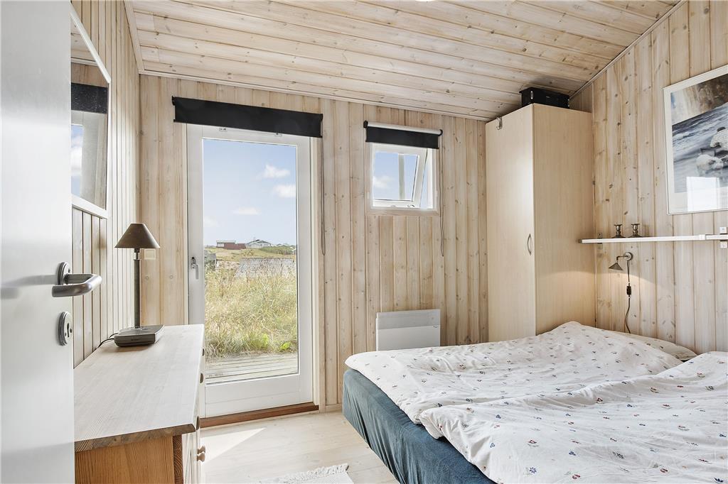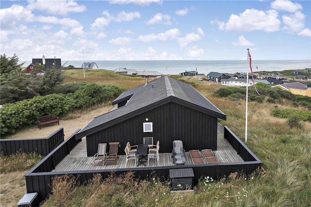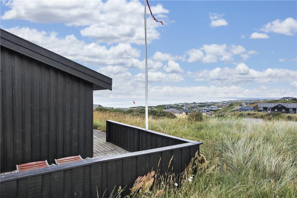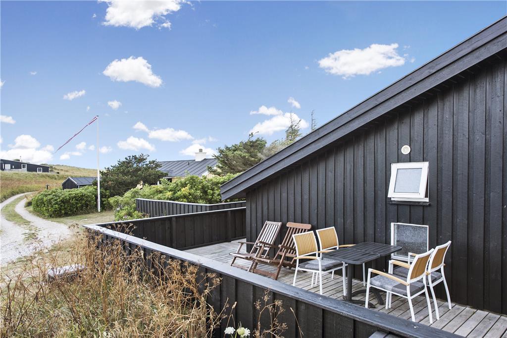 Sommerhuset har terrasse hele vejen rundt, og en del er overdækket samt med læhegn, så det er nemt at finde solskin og læ. Sommerhuset ligger højt hævet, og fra flere sider er der en skøn udsigt. Grill og havemøbler gør det oplagt at nyde flere af feriens måltider udendørs – hvem vil ikke gerne nyde et lækkert måltid med familien og udsigt over Vesterhavet?
