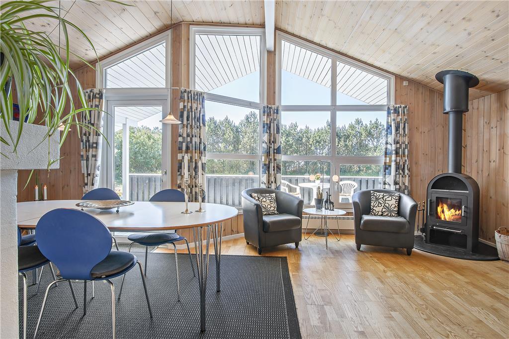 Huset har åbent køkken til både spisestue og opholdsstue, og alt er indrettet med gode møbler, hvor farverne er smagfuldt afstemt. Brændeovnen i hjørnet kan på kølige aftener bidrage til en behagelig temperatur, så der rigtig kan hygges igennem. Der er tre smagfuldt indrettede soverum med hhv. dobbeltseng samt to med to enkeltsenge. Der er to badeværelser i huset, hvoraf det ene er udstyret med en dejlig hjørnespa samt sauna.
