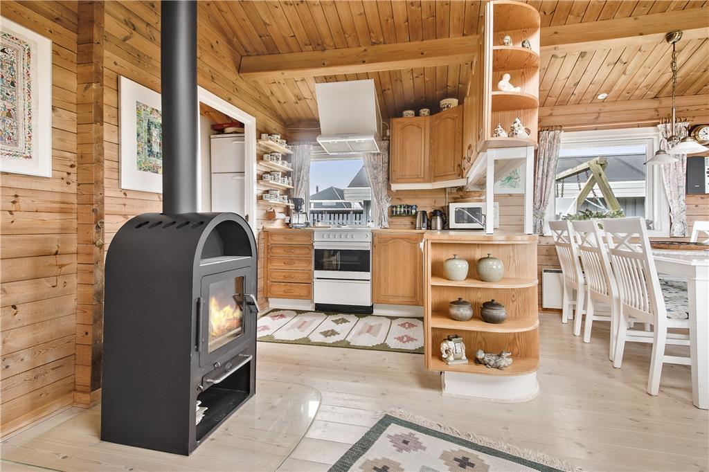 Huset indeholder en lille fordelingsgang med udgang til renoveret badeværelse, et soveværelse med 3/4 seng samt til stuen. Fra stuen er der adgang til to soveværelser, et med to enkeltsenge, og et med køjesenge. Stuen er kombineret køkken/alrum, således man kan være sammen om aktiviteter i huset. Hertil kommer en fantastisk udestue med panoramaudsigt over havet og fyret. Huset er personligt og hyggelig indrettet og meget velholdt. Der er installeret varmepumpe, som har meget positiv betydning for elforbruget. Der er desuden hobbyrum til havemøbler, hynder, cykler mm.