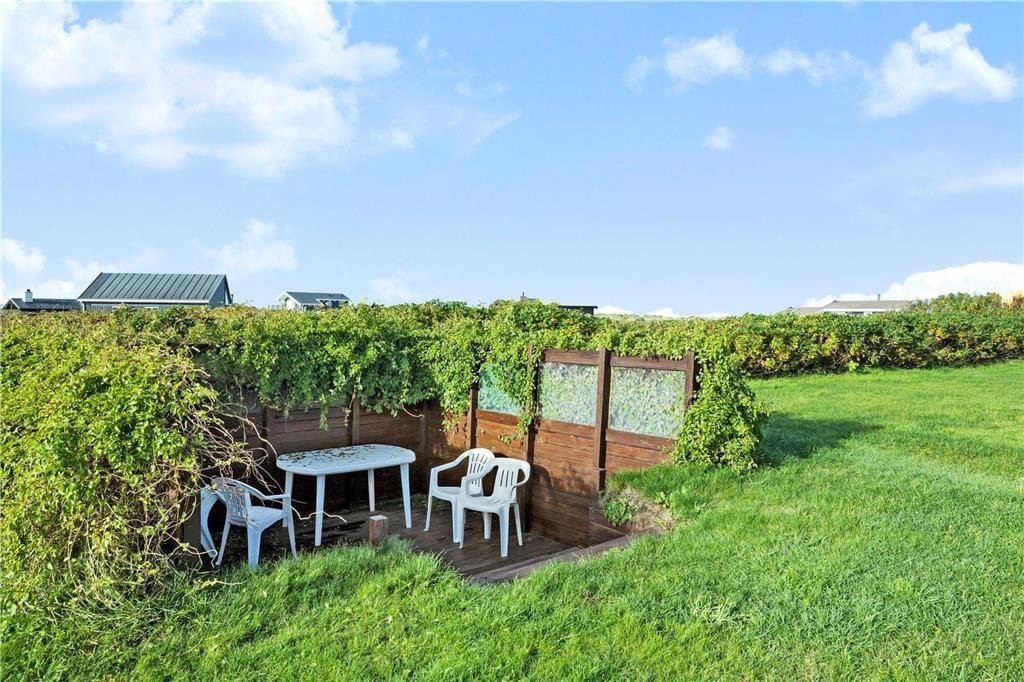 Haven er stor og med plads til gode aktiviteter, desuden er der lavet en nedgravet læ og solterrasse, således man kan nyde solen helt i læ, trods den høje beliggenhed.