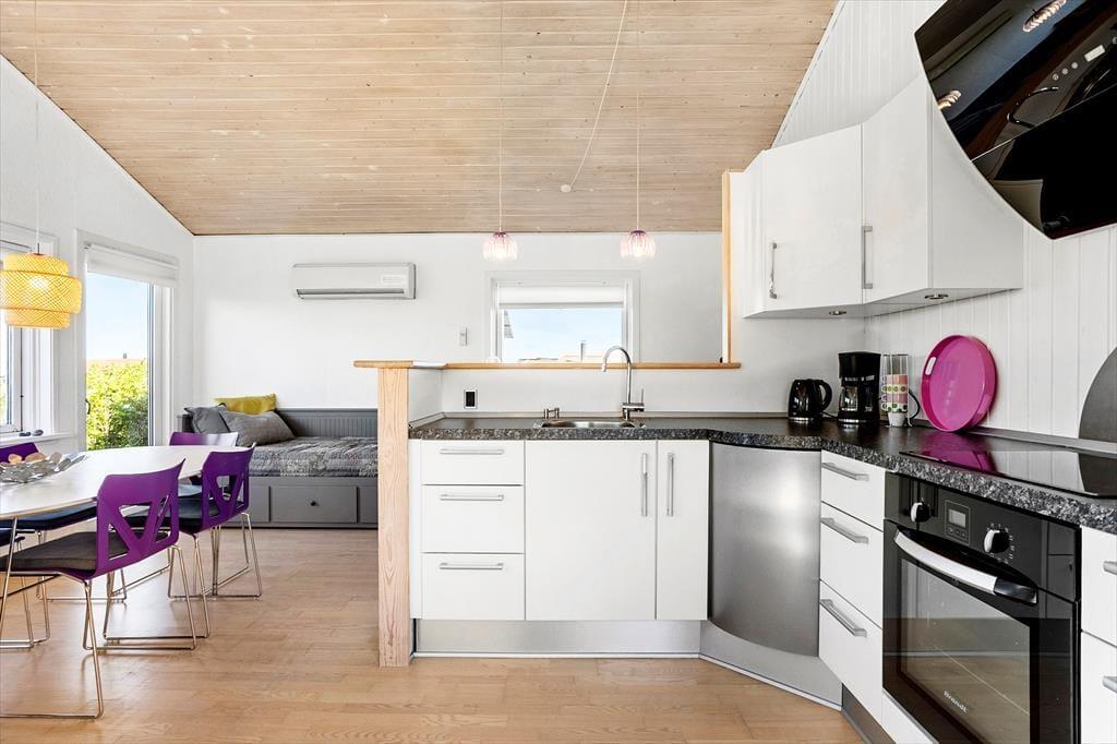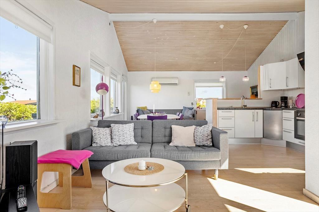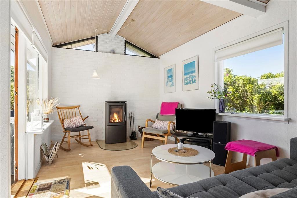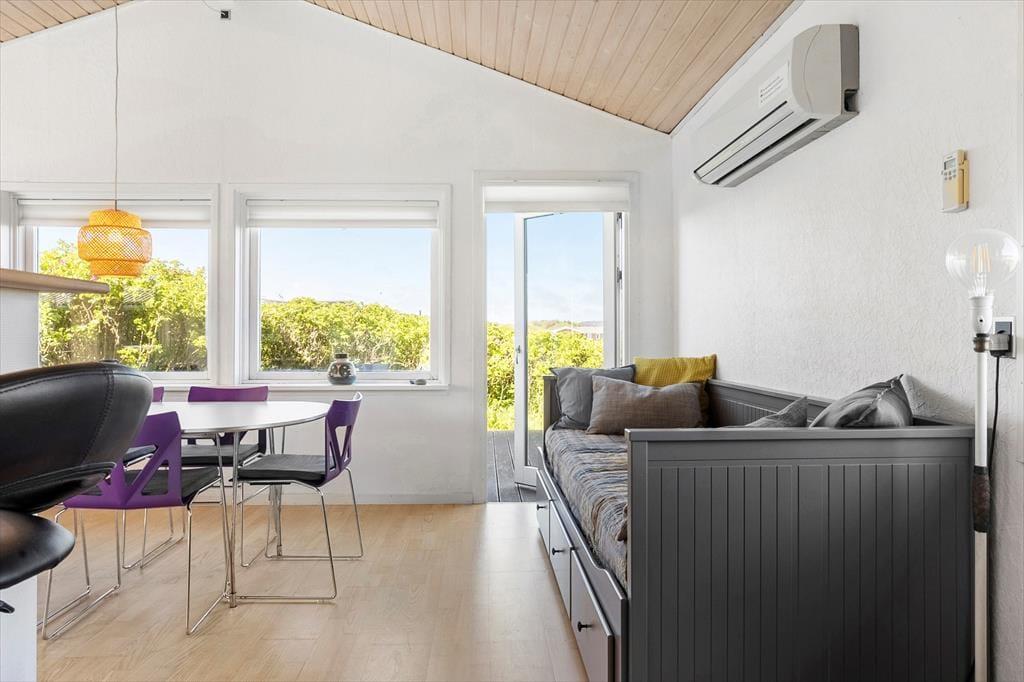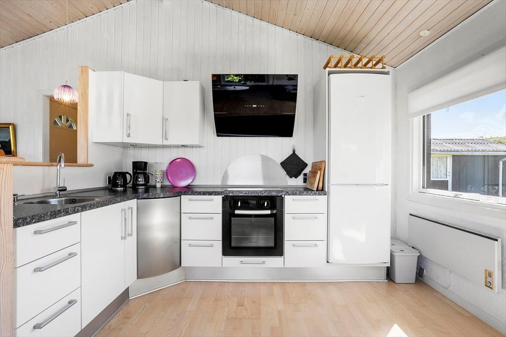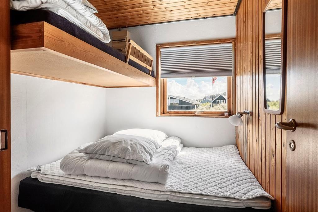 Det kombinerede køkken og opholdsrum er stedet, hvor hele familien kan samles. Her er lyst og mange pæne, personlige detaljer, som gør, at man føler sig hjemme og tilpas. Med brændeovn, fjernsyn og flere gode kroge til hygge samt et dejligt, nyere køkken er husets opholdsrum et dejligt rum, hvor man i ferien kan tilbringe mange gode timer. Sommerhuset har desuden to værelser, hvor der på begge er en dobbeltseng samt en hævet enkeltseng over (se eventuelt billederne). På badeværelset er der en bruseniche og i et skur står vaskemaskine og tørretumbler. Gode rammer for en hyggelig ferie meget tæt på Vesterhavet.