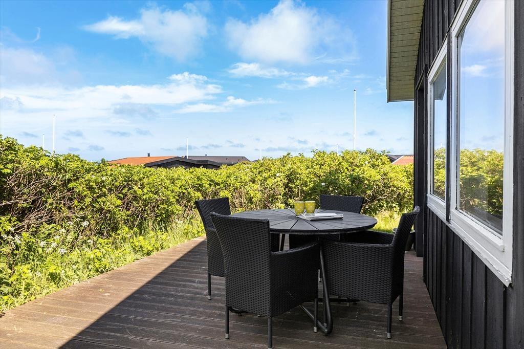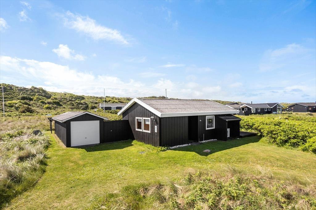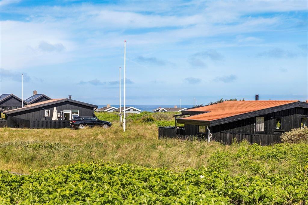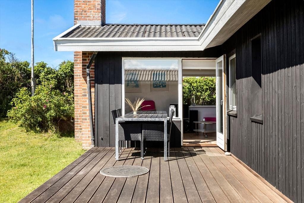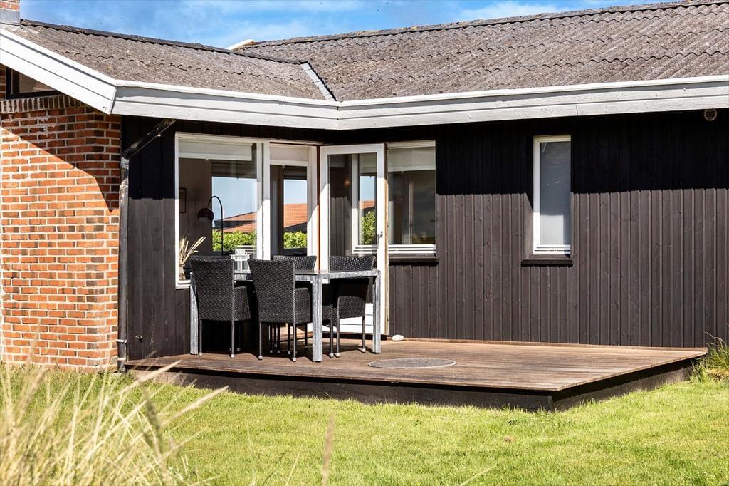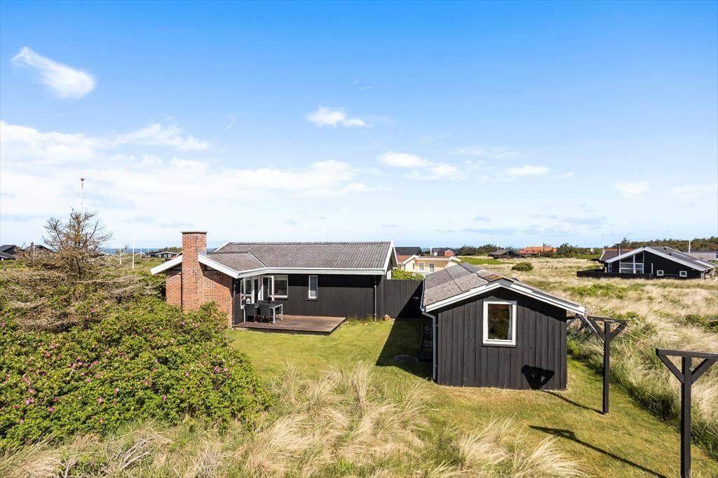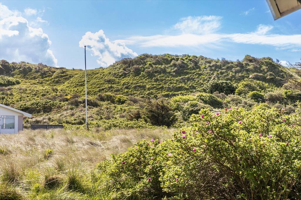 Fra grunden er der en skøn udsigt over området og også et lille glimt af Vesterhavet. Der er terrasser på to sider af huset, og udgang fra opholdsrummet til begge, så det er nemt at tage flere af feriens måltider med udendørs. Grill og havemøbler hører naturligvis også til huset, så det er med at nyde mest muligt af ferien udendørs.