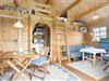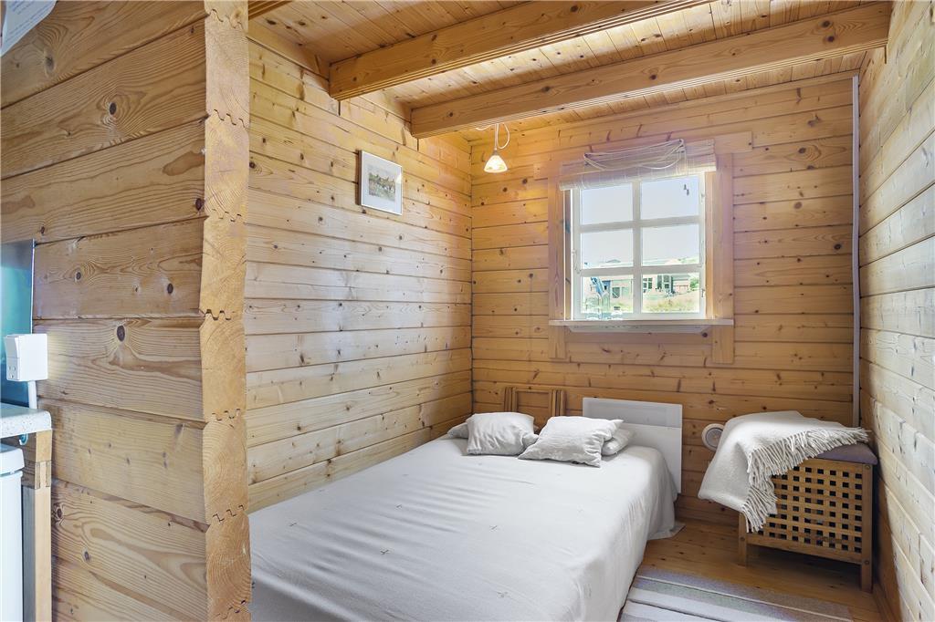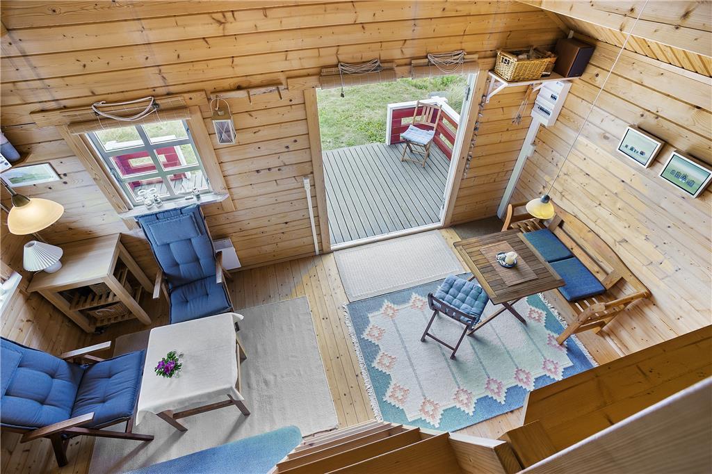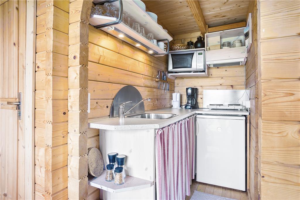 Man går direkte ind i stuen, som er indrettet med en sofa og minimalistiske møbler af hensyn til den lille plads. Men alt er virkelig hyggeligt og charmerende. Det lille men funktionelle køkken ligger i direkte forbindelse med stuen, så man kan både følge med i, hvad der sker i stuen og på terrassen, når der laves mad. På hemsen er der to madrasser, og her fra kan man skue ud over stuen, terrassen og det skønne klitlandskab, som omgiver huset. I værelset i stueplan er der en dobbelt sovesofa, ligesom sofaen i stuen også er egnet som soveplads, hvis man ikke har mod på at benytte hemsen. Der er et charmerende lille badeværelse med brusemulighed i feriehuset.