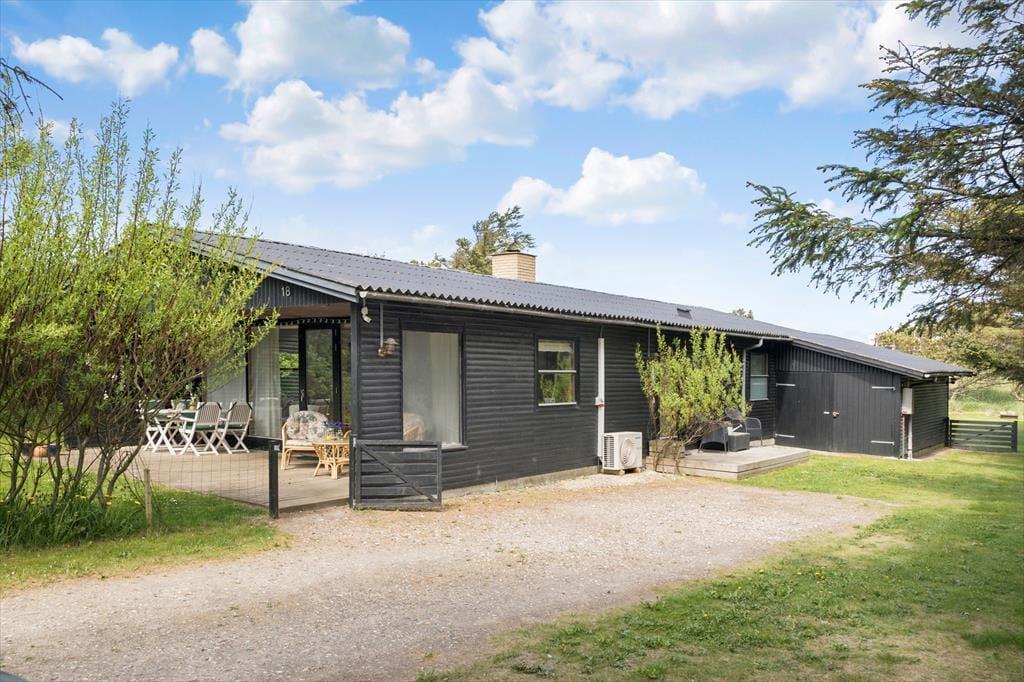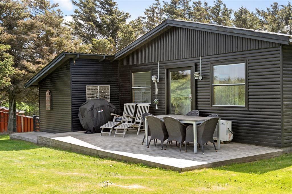 Sommerhuset ligger på en havegrund omkranset af nåletræer, som giver rigtig godt læ, og som gør, at man kan opholde sig udenfor ganske ugeneret. Der er masser af plads til leg og udfoldelse for den aktive familie. Der er flere gode terrasser at opholde sig på. Om aftenen er det hyggeligt at sidde på den overdækkede terrasse og nyde solens sidste stråler eller at tage en time på øjet i en liggestol på den store nord- vestvendte terrasse, mens man kan høre fuglene synge.