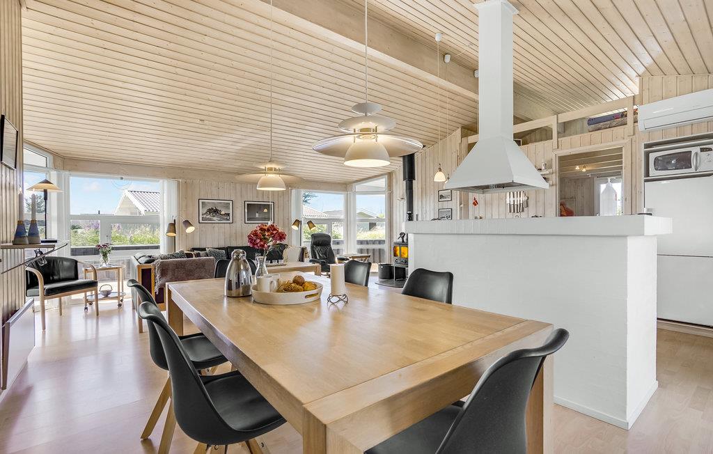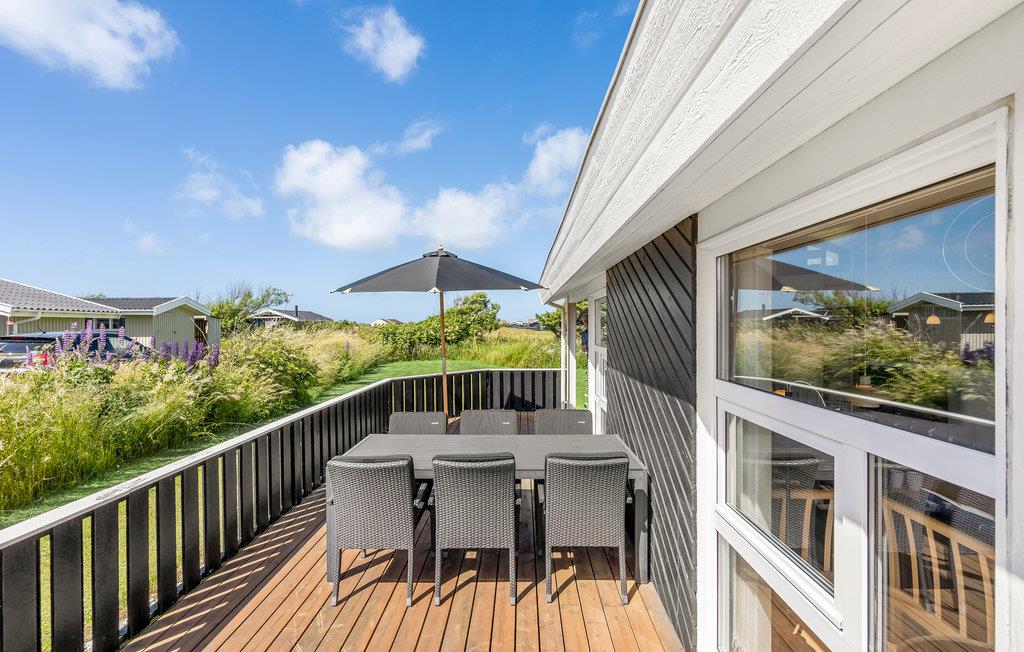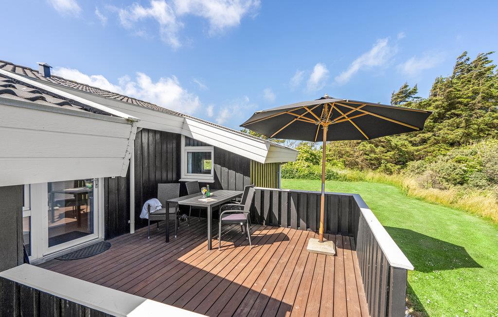 Ikke langt fra Lønstrup bymidte, på en stille sidevej, ligger det utroligt velholdte feriehus på en åben naturgrund. Fra den dejlige østvendte terrasse er der indgang til den kombinerede entré/køkken, som er flot og rummelig. Huset har loft til kip og det lyse trægulv i køkkenet giver en god kontrast til blandt andet det sorte læderarrangement og de sorte spisebordsstole. På væggene pynter flotte billeder, som giver huset et hyggeligt præg. Huset er indrettet med et stort og flot badeværelse med flotte klinkegulve og gulvvarme. Fra stuen har I udgang til den vestvendte terrasse, hvoraf en del er overdækket.