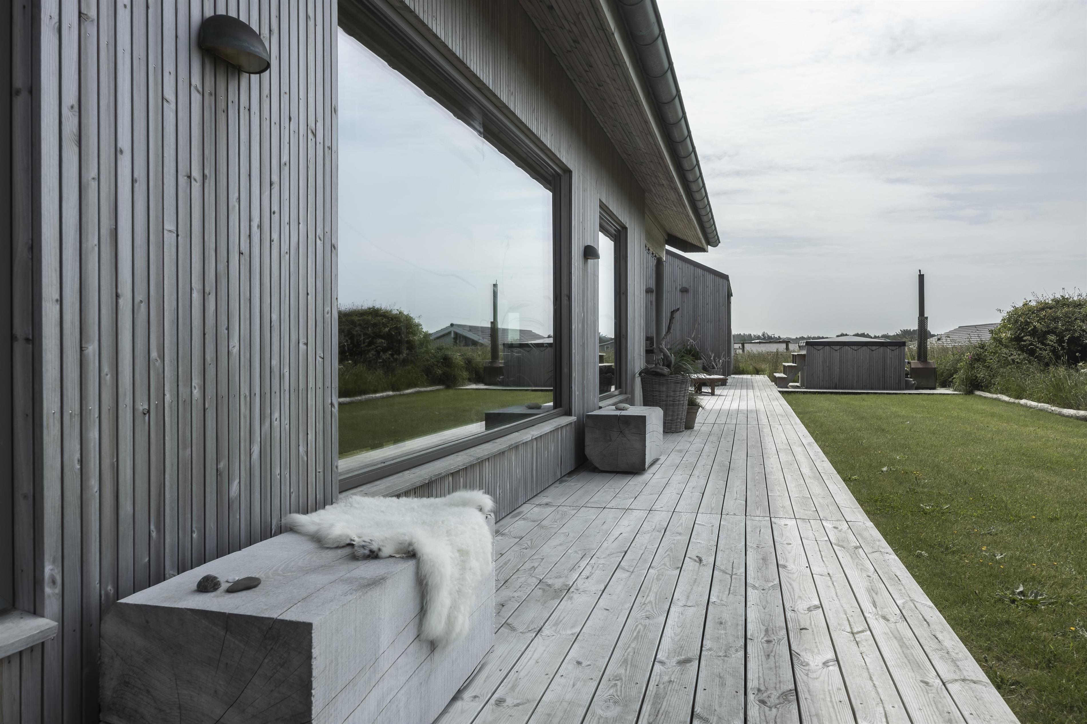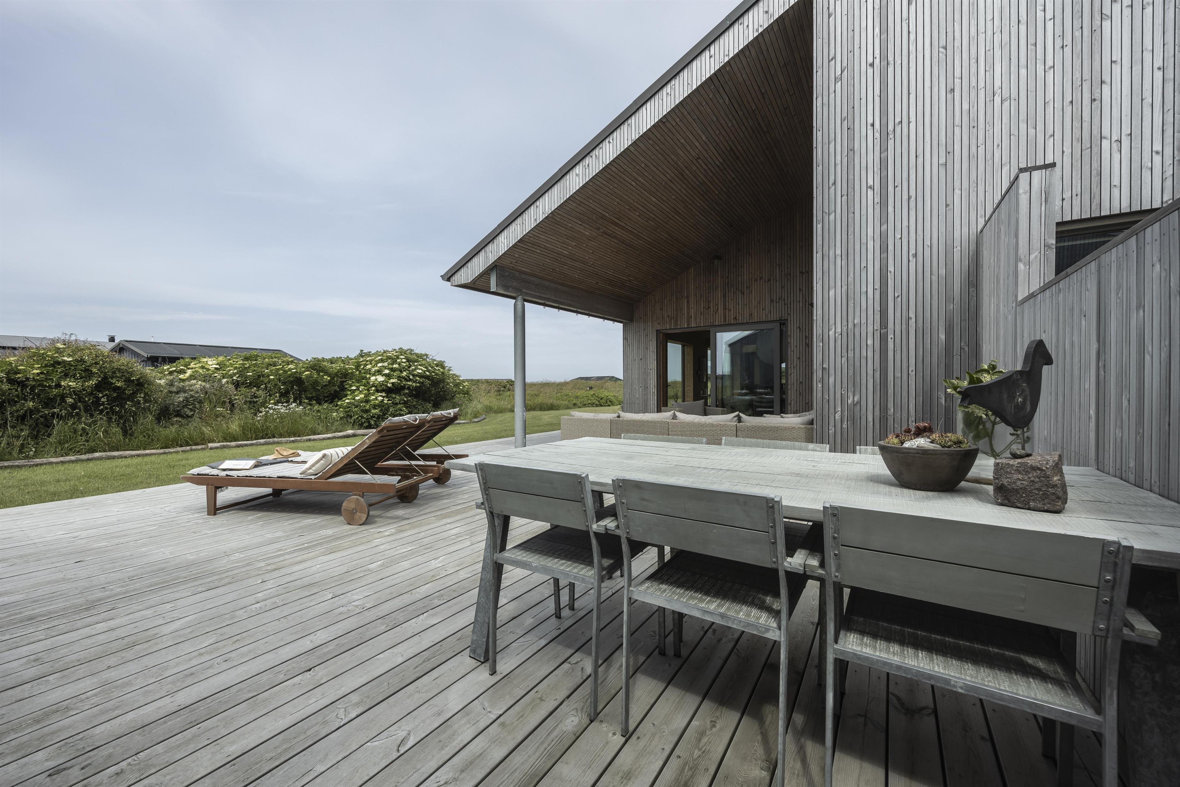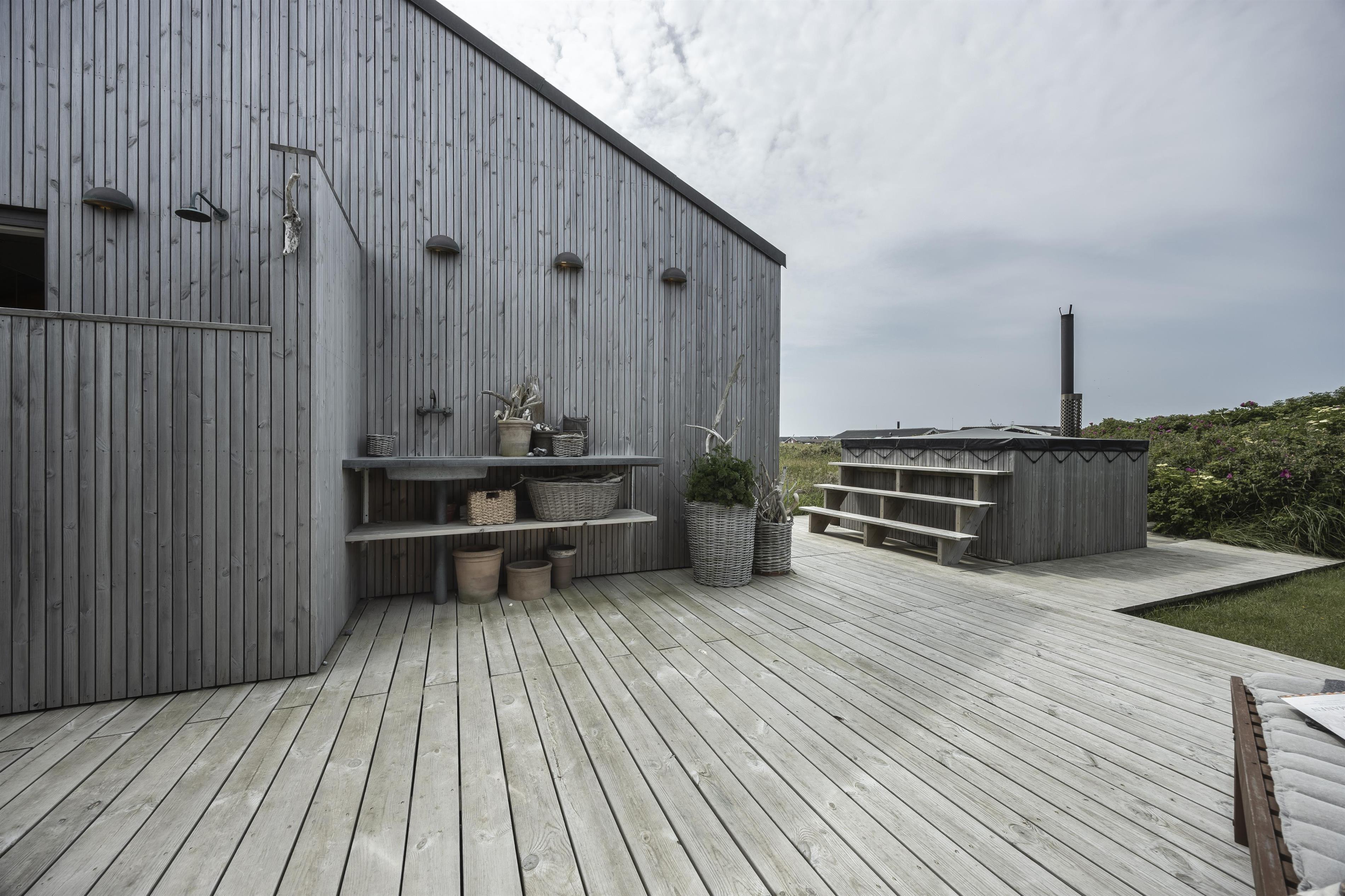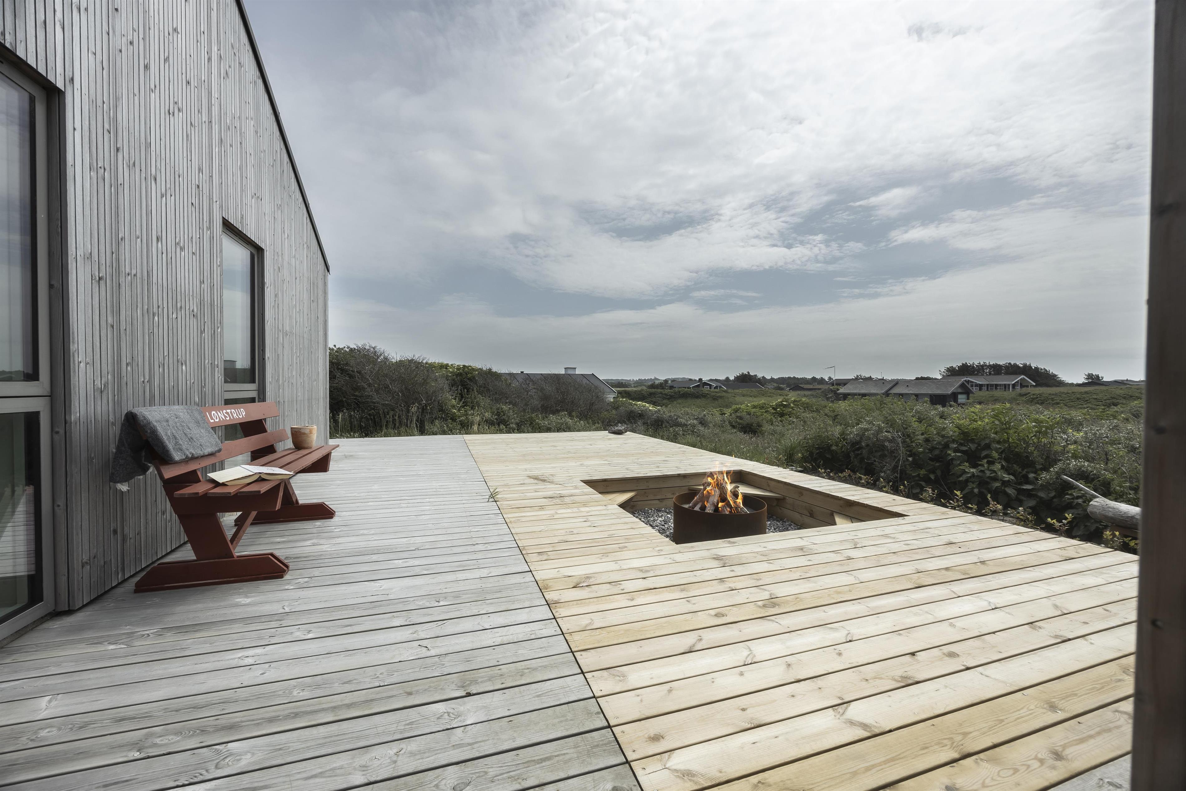 Udenfor er ferieoplevelsen mindst lige så gennemført. Huset er omgivet af store, indbydende terrasser – nogle overdækkede, andre i læ med sol det meste af dagen. Her er plads til både fælles måltider, stille læsestunder og hyggelige aftener med varme tæpper og terrassevarmere. Indretningen af de udendørs områder er inspireret af den omkringliggende natur og giver rig mulighed for både samvær og fordybelse. Lyt til bølgernes rytme og lad tankerne vandre. Tænd også gerne op i bålstedet bag feriehuset og grill skumfiduser, mens ilden knitrer i tusmørket.