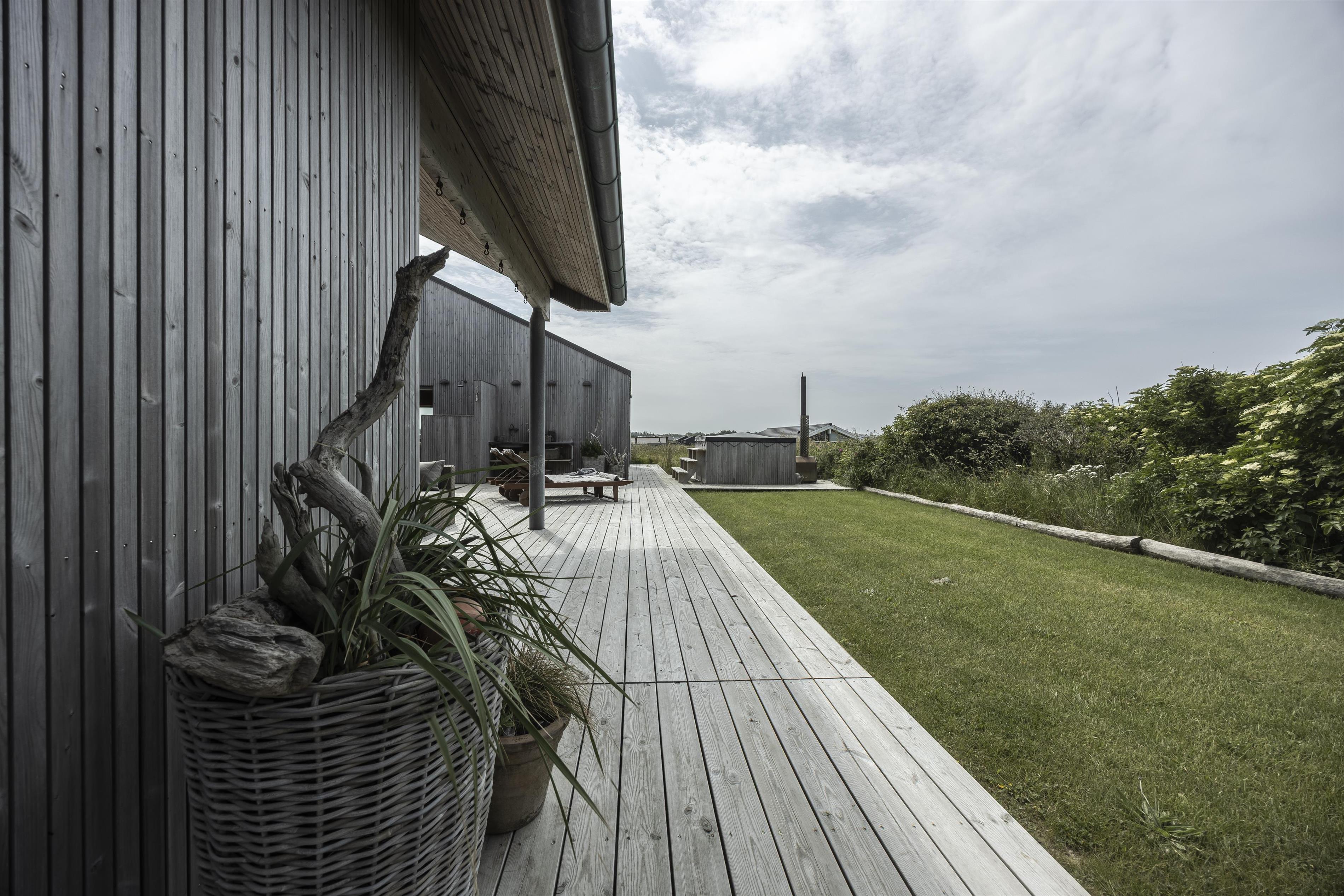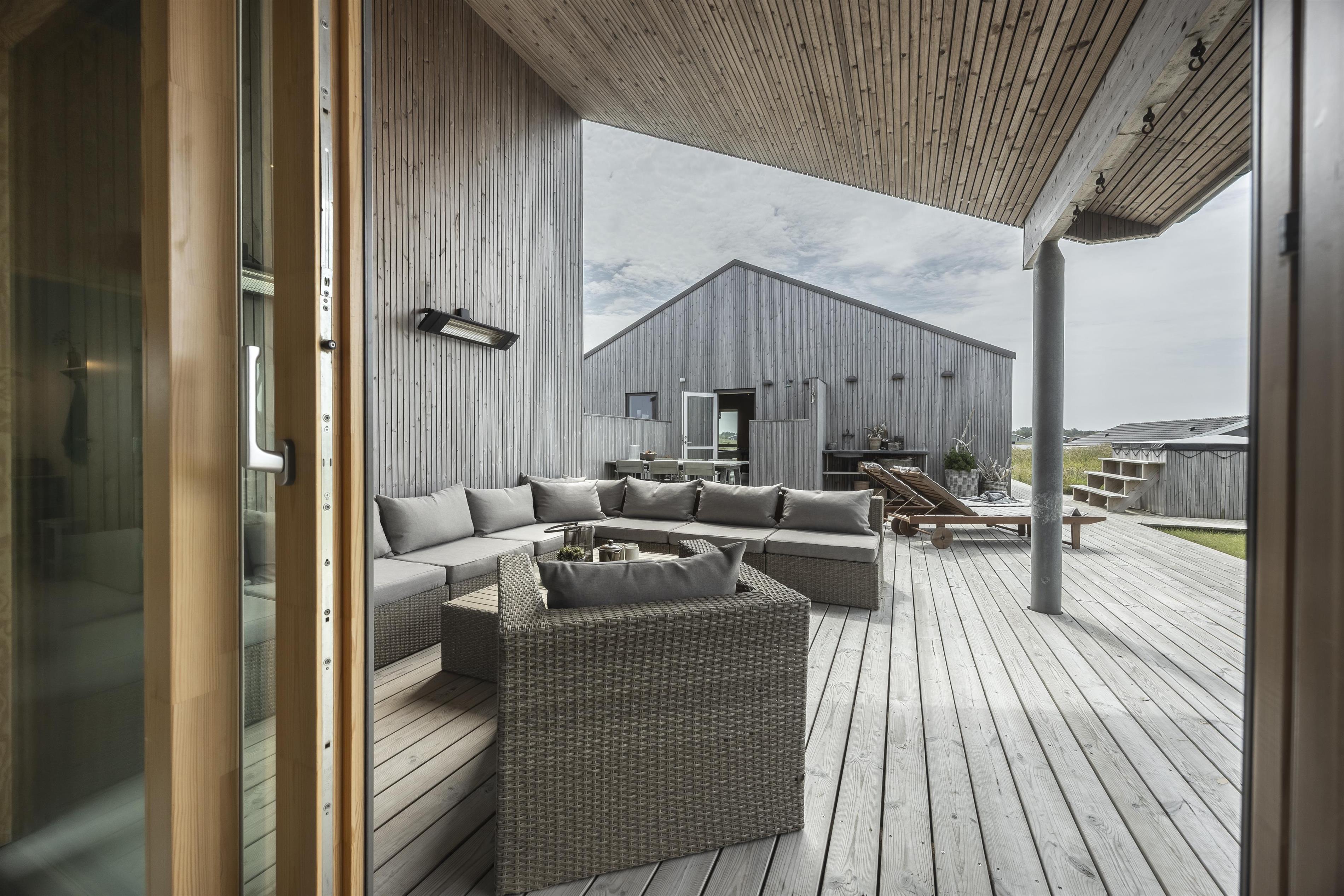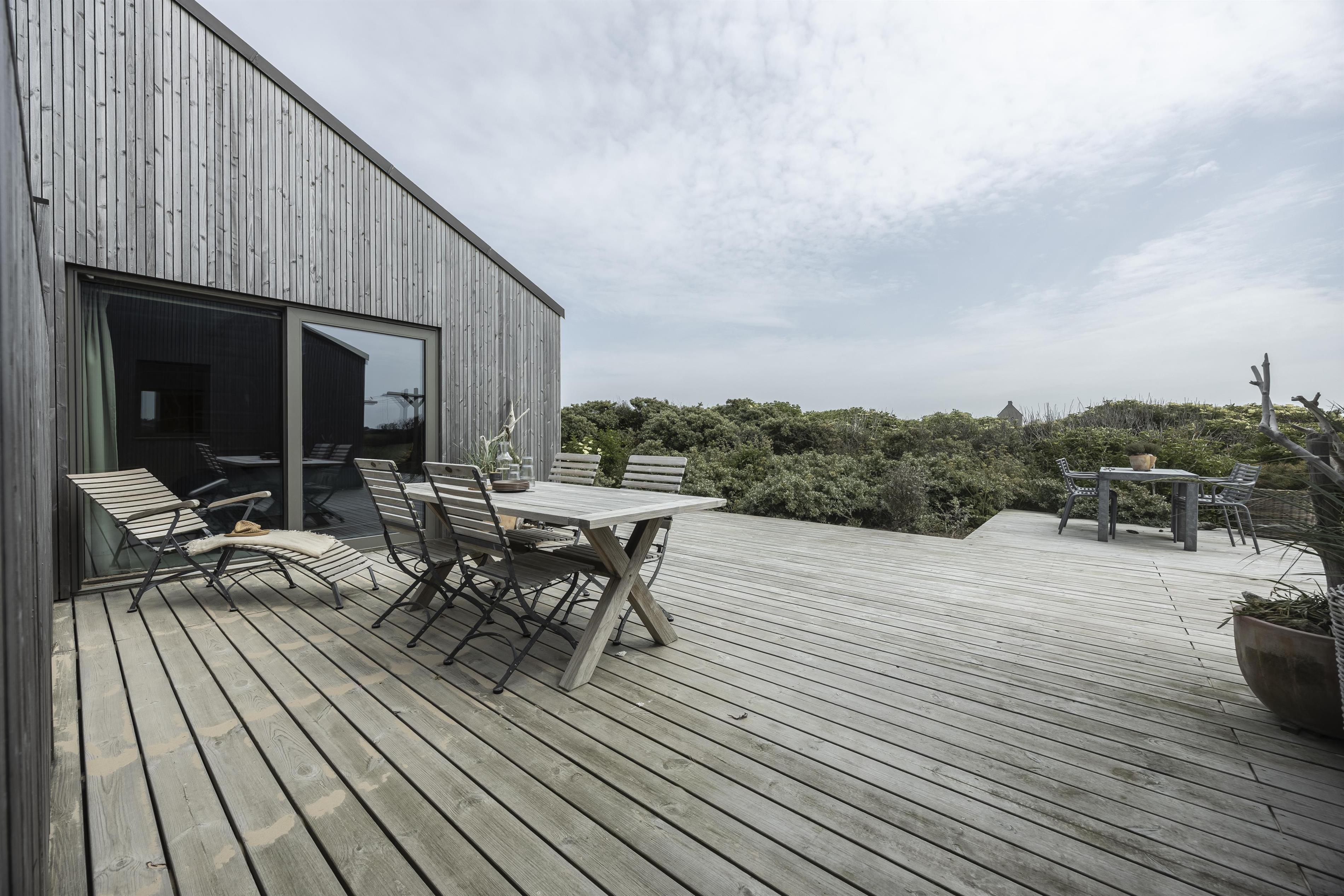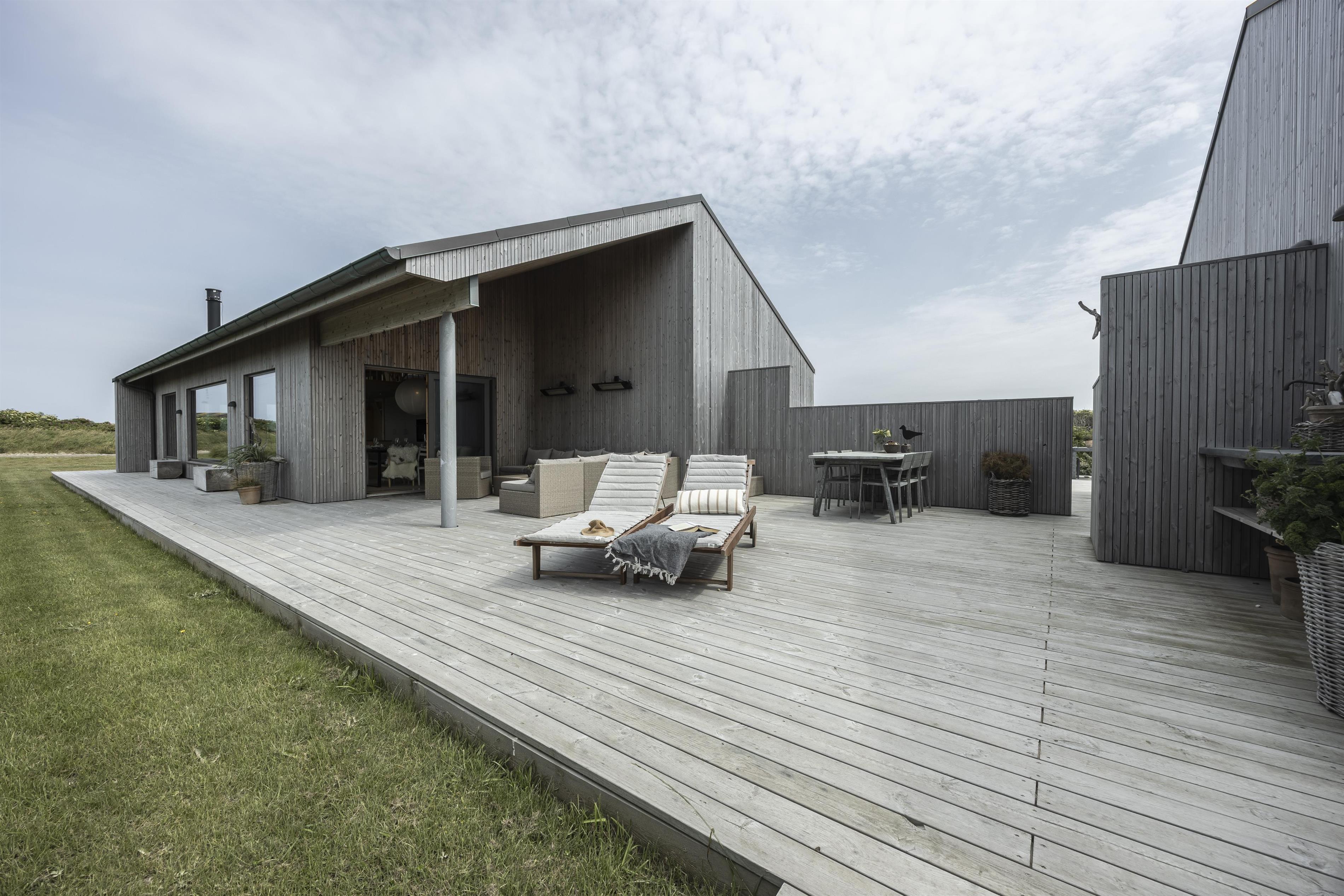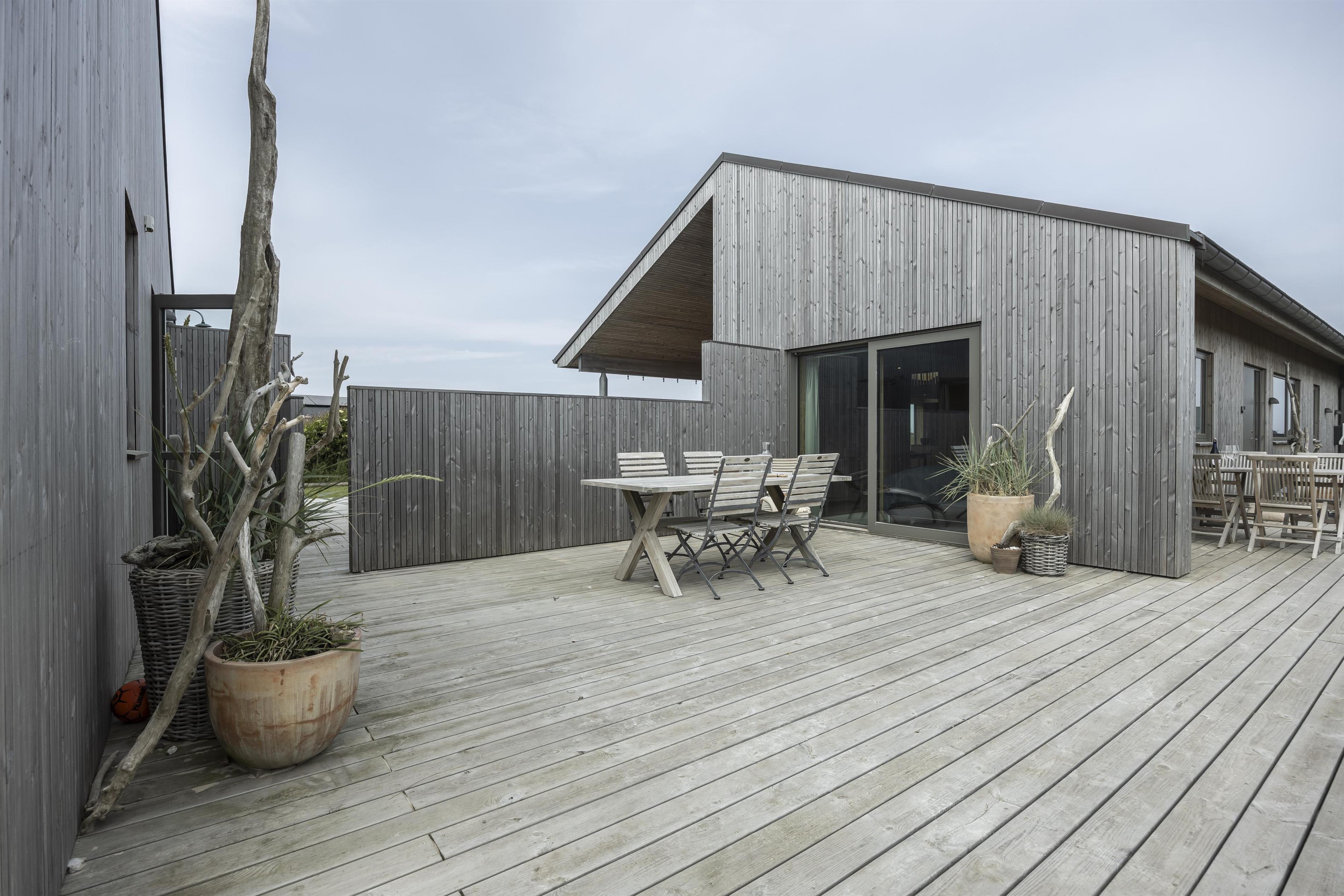 Udenfor er ferieoplevelsen mindst lige så gennemført. Huset er omgivet af store, indbydende terrasser – nogle overdækkede, andre i læ med sol det meste af dagen. Her er plads til både fælles måltider, stille læsestunder og hyggelige aftener med varme tæpper og terrassevarmere. Indretningen af de udendørs områder er inspireret af den omkringliggende natur og giver rig mulighed for både samvær og fordybelse. Lyt til bølgernes rytme og lad tankerne vandre. Tænd også gerne op i bålstedet bag feriehuset og grill skumfiduser, mens ilden knitrer i tusmørket.