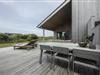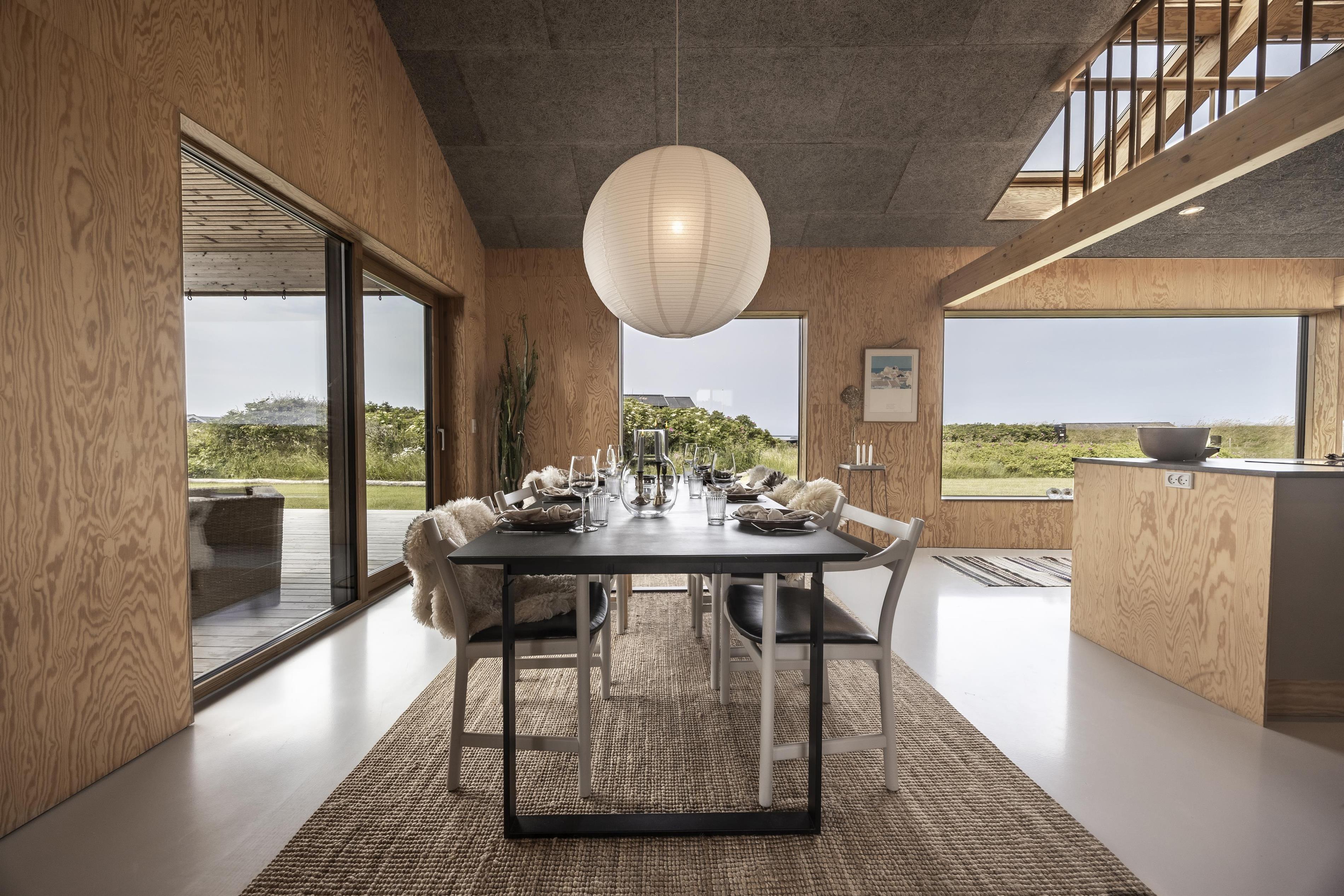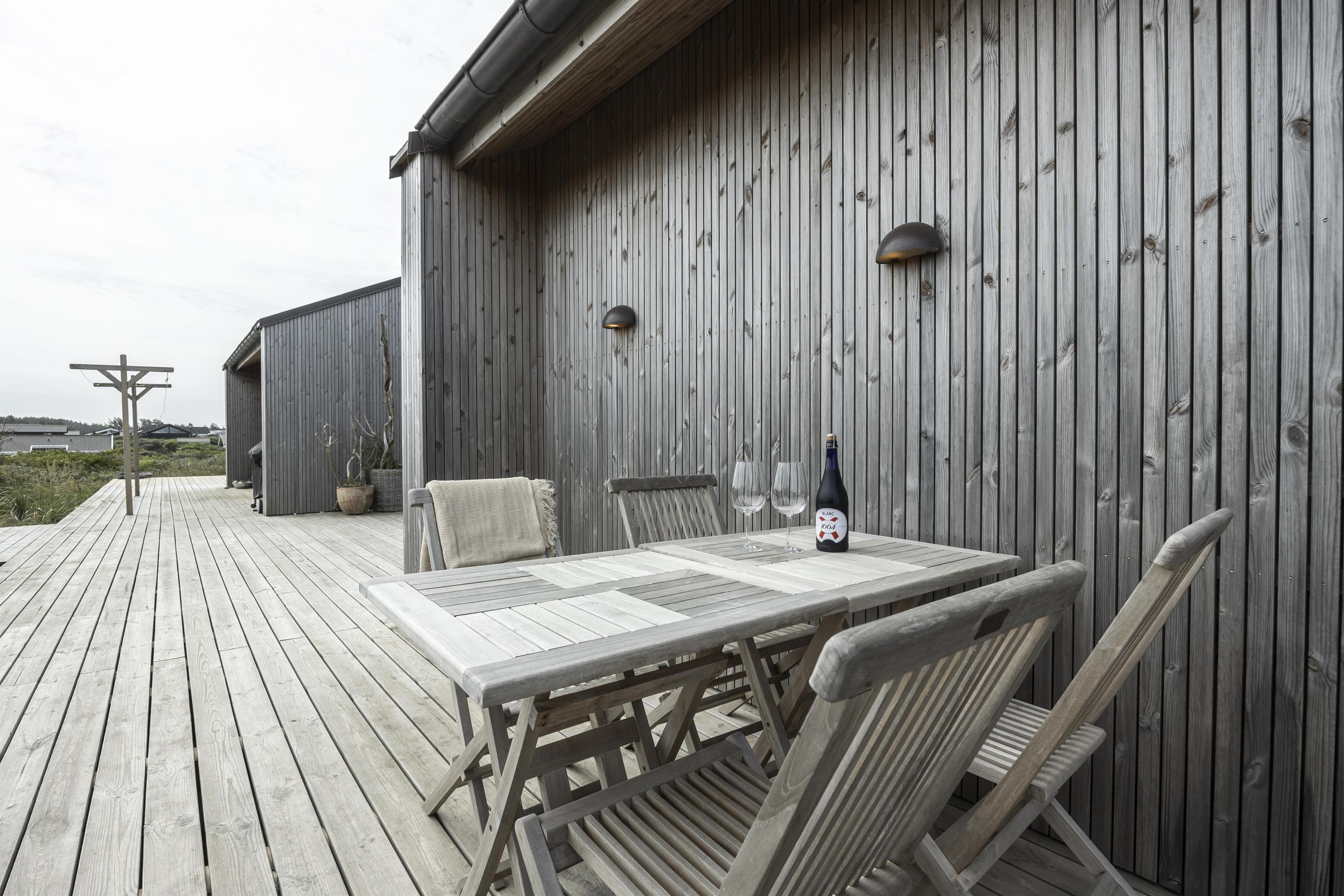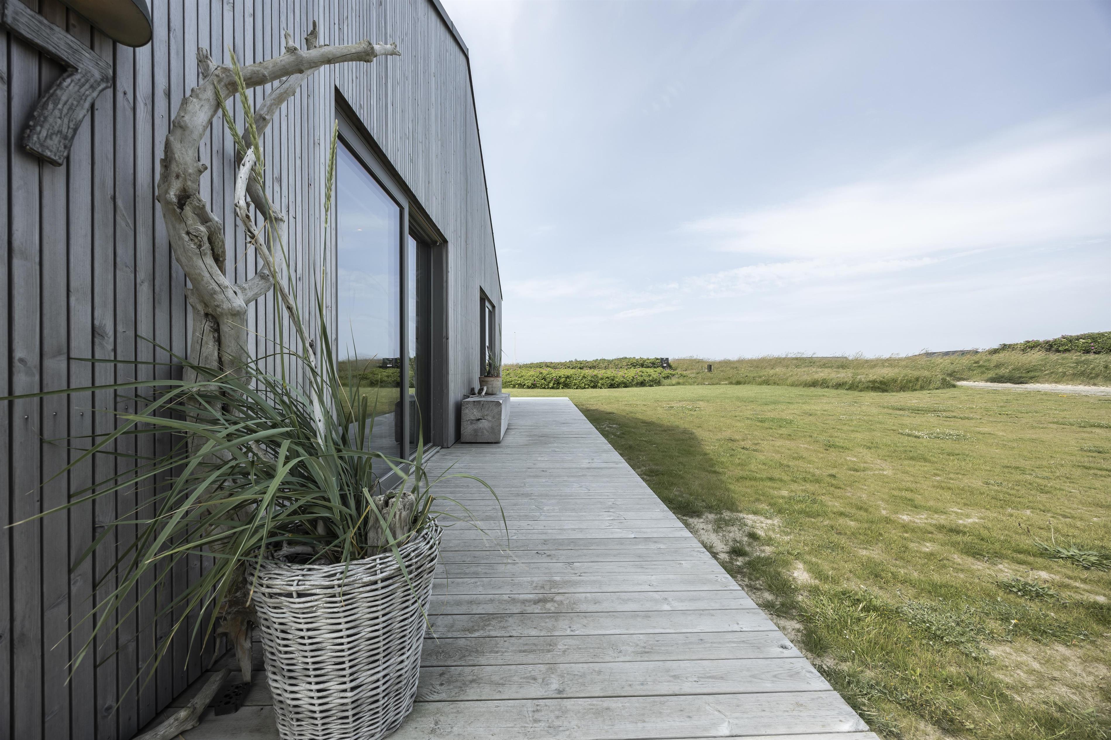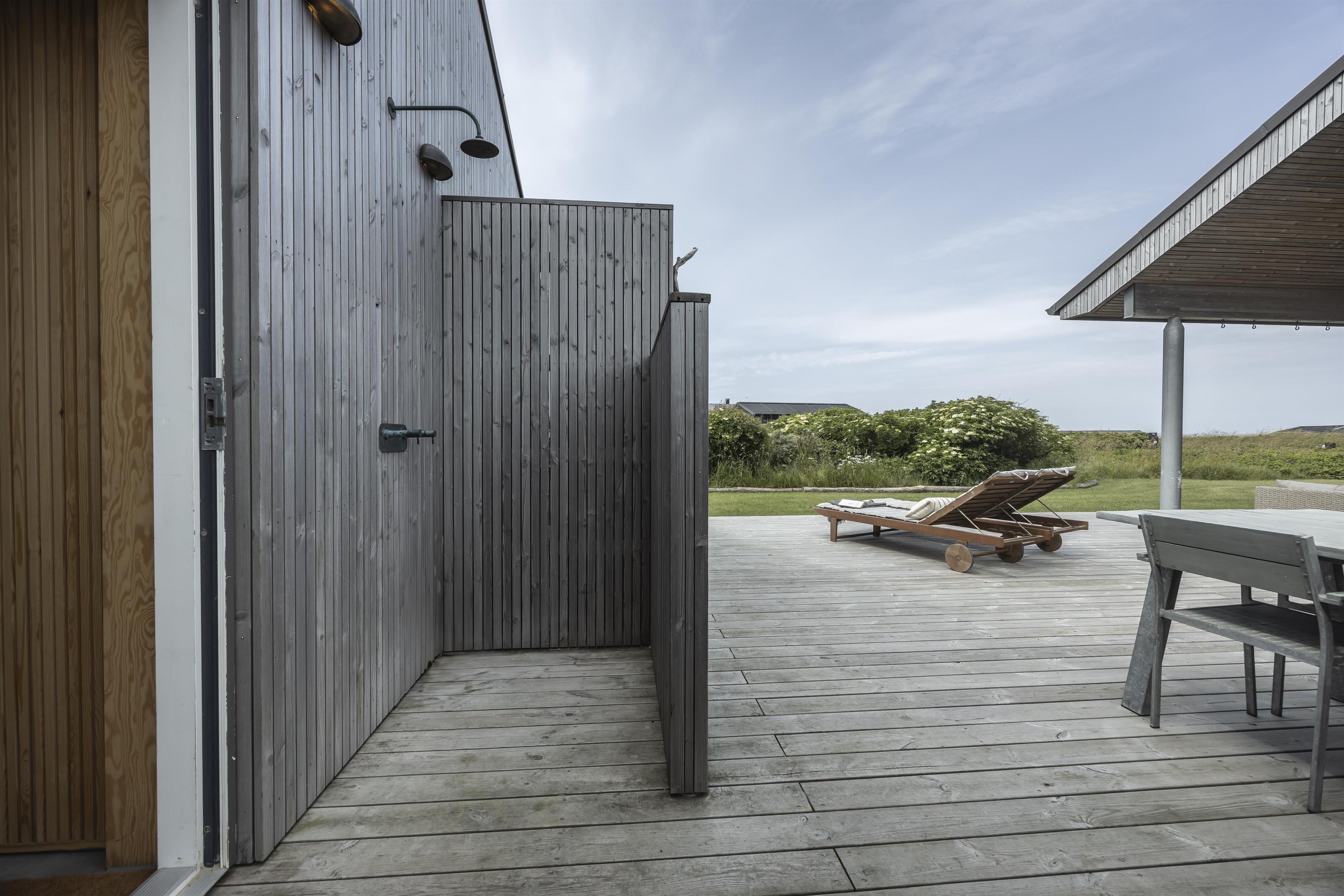 Udenfor er ferieoplevelsen mindst lige så gennemført. Huset er omgivet af store, indbydende terrasser – nogle overdækkede, andre i læ med sol det meste af dagen. Her er plads til både fælles måltider, stille læsestunder og hyggelige aftener med varme tæpper og terrassevarmere. Indretningen af de udendørs områder er inspireret af den omkringliggende natur og giver rig mulighed for både samvær og fordybelse. Lyt til bølgernes rytme og lad tankerne vandre. Tænd også gerne op i bålstedet bag feriehuset og grill skumfiduser, mens ilden knitrer i tusmørket.