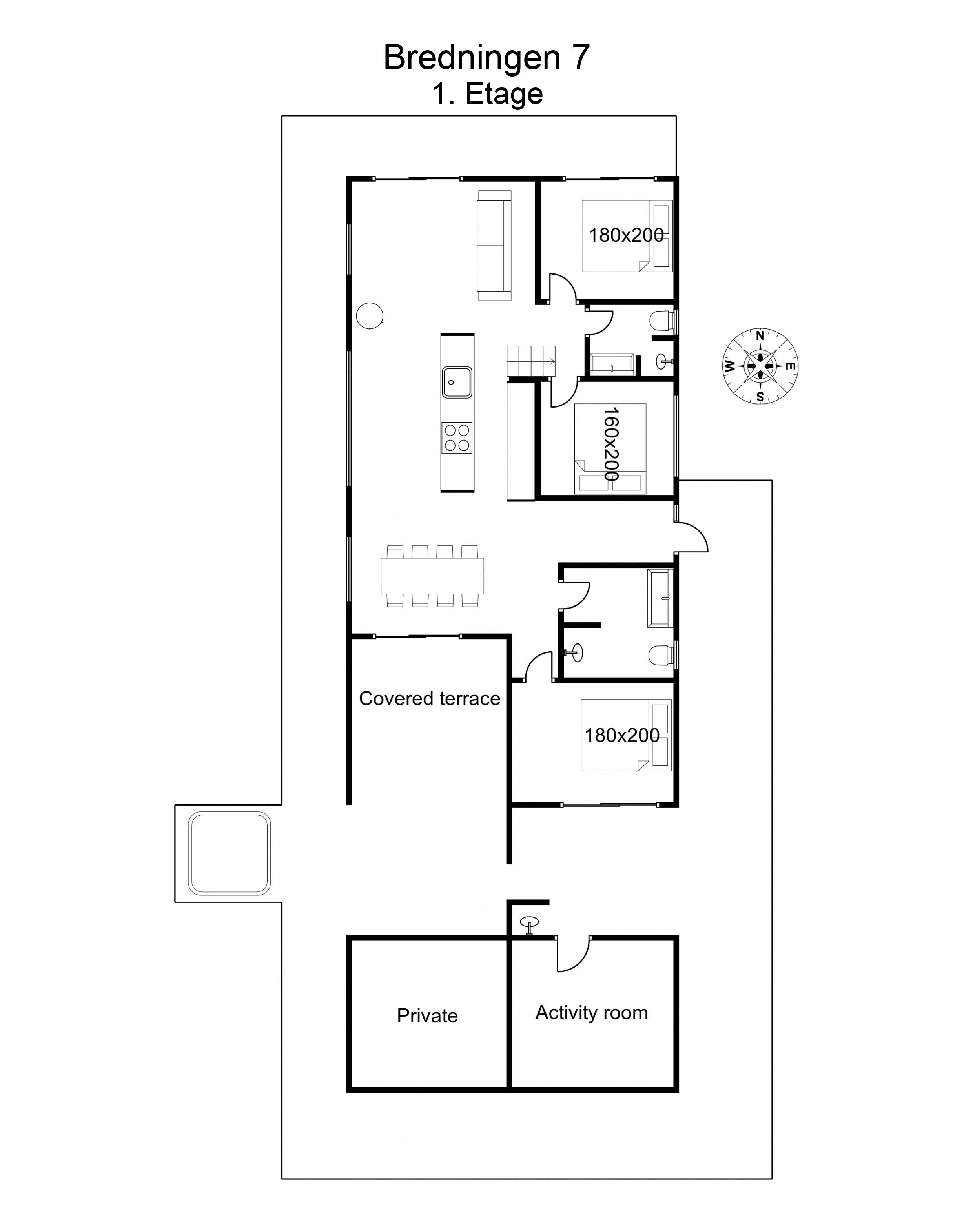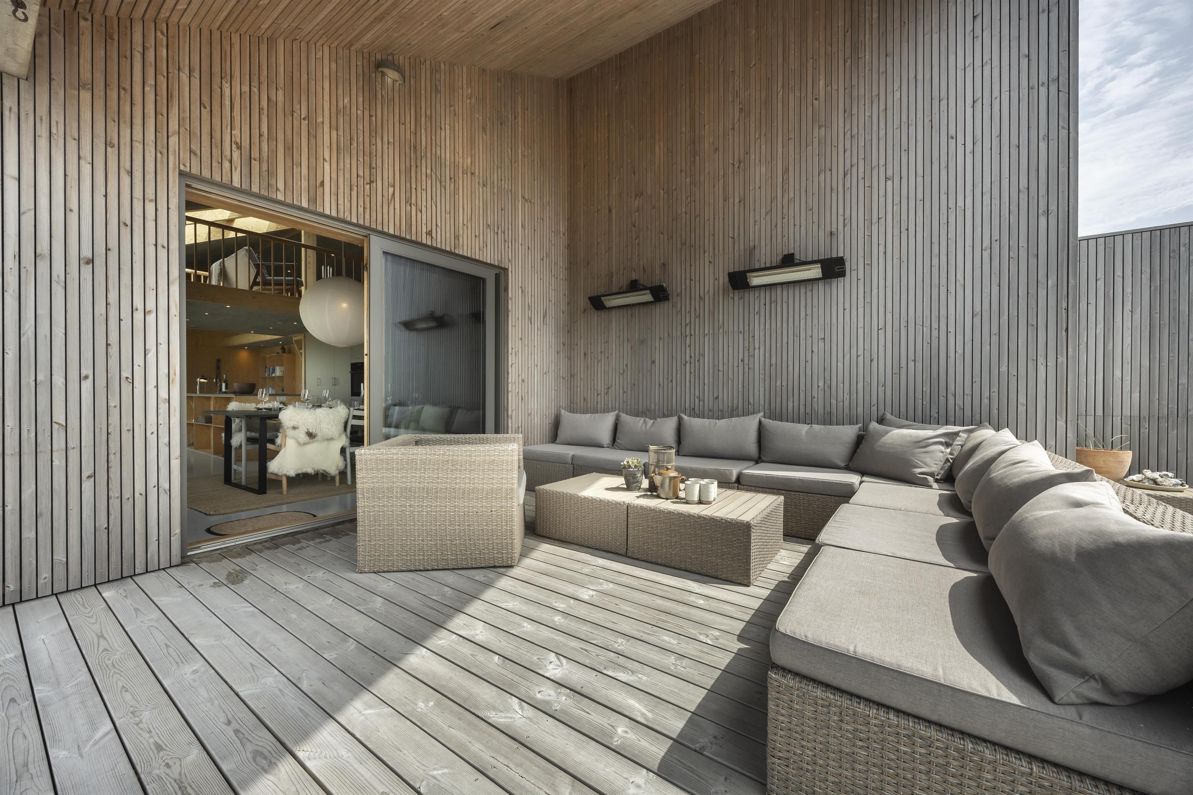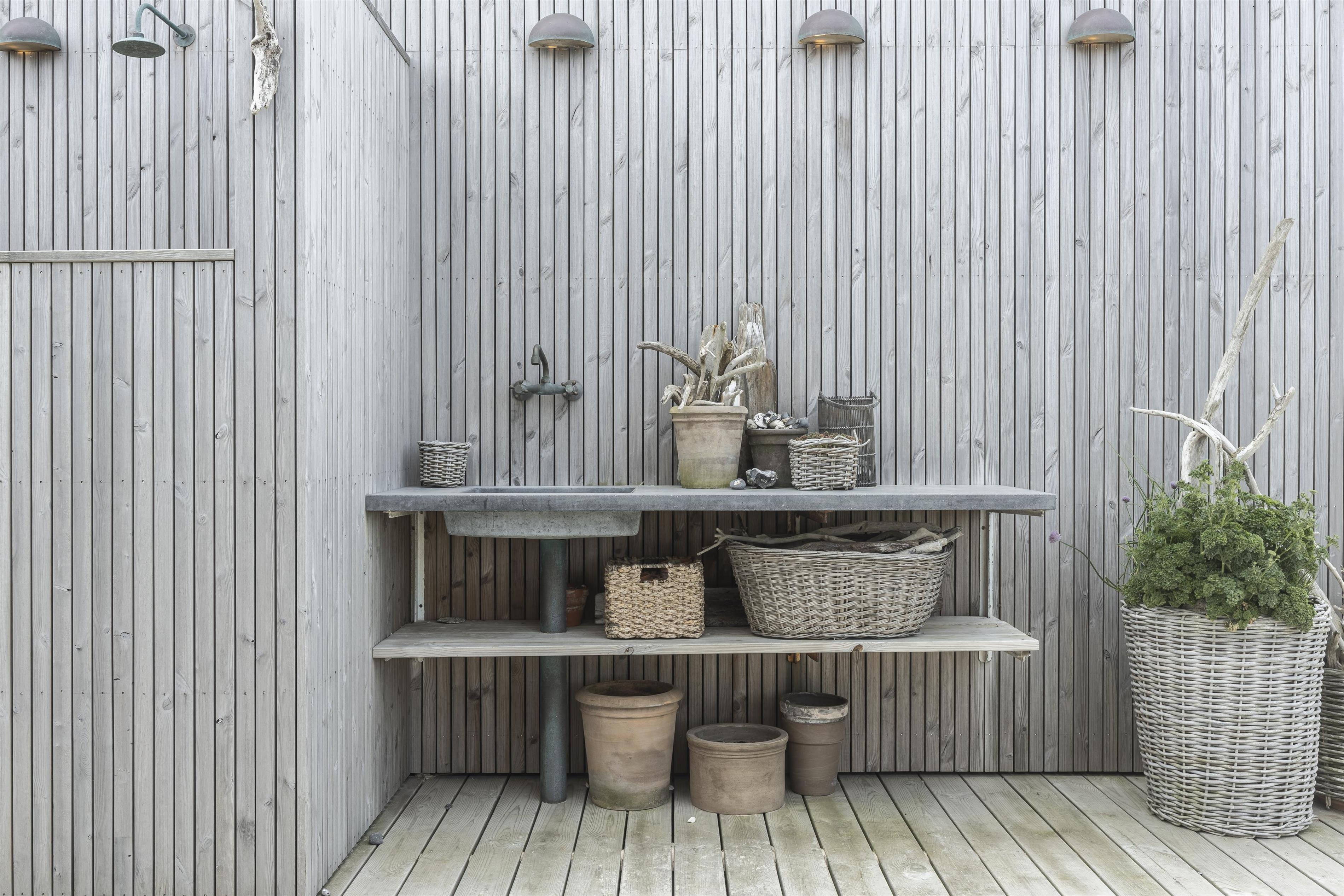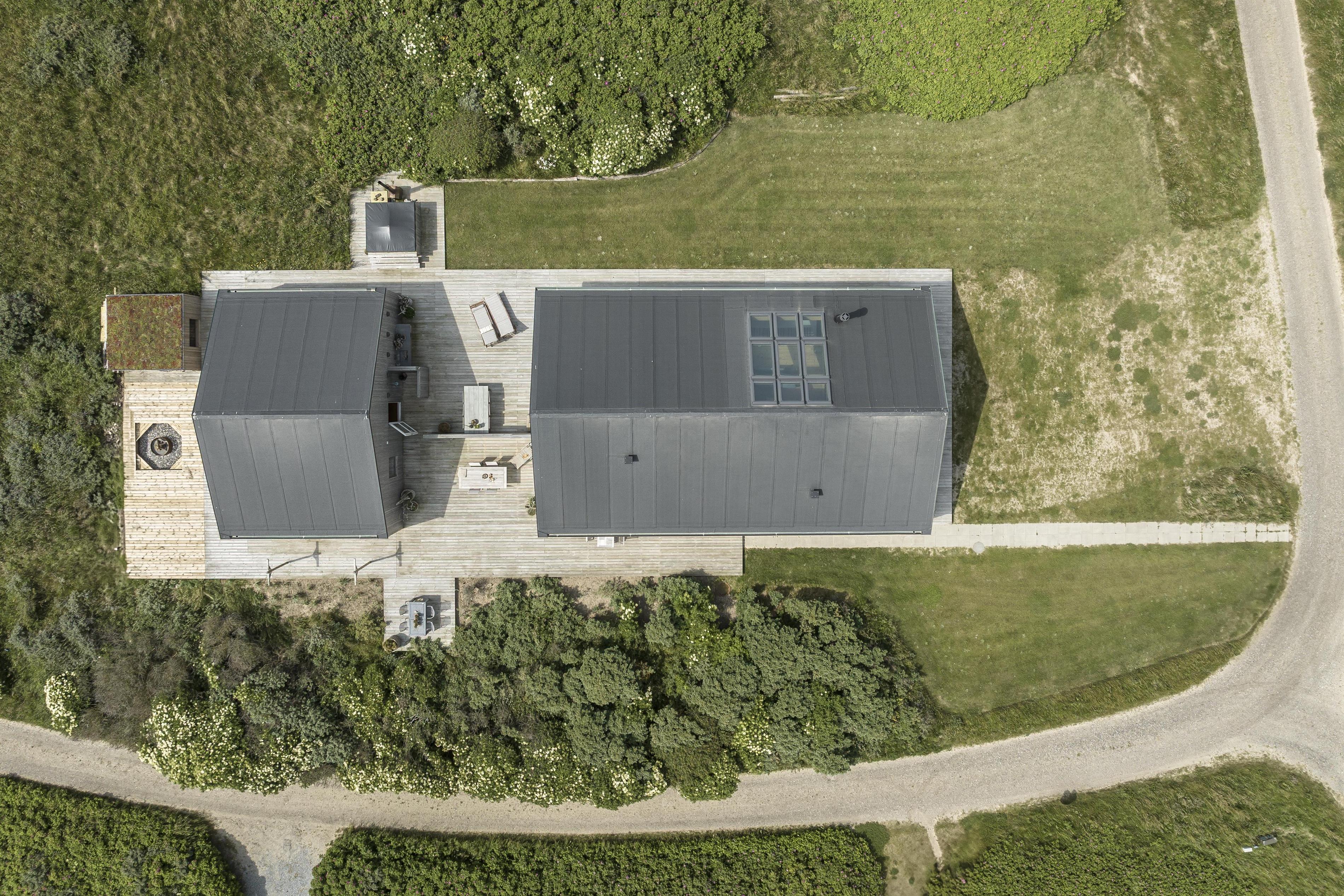 Udenfor er ferieoplevelsen mindst lige så gennemført. Huset er omgivet af store, indbydende terrasser – nogle overdækkede, andre i læ med sol det meste af dagen. Her er plads til både fælles måltider, stille læsestunder og hyggelige aftener med varme tæpper og terrassevarmere. Indretningen af de udendørs områder er inspireret af den omkringliggende natur og giver rig mulighed for både samvær og fordybelse. Lyt til bølgernes rytme og lad tankerne vandre. Tænd også gerne op i bålstedet bag feriehuset og grill skumfiduser, mens ilden knitrer i tusmørket.
