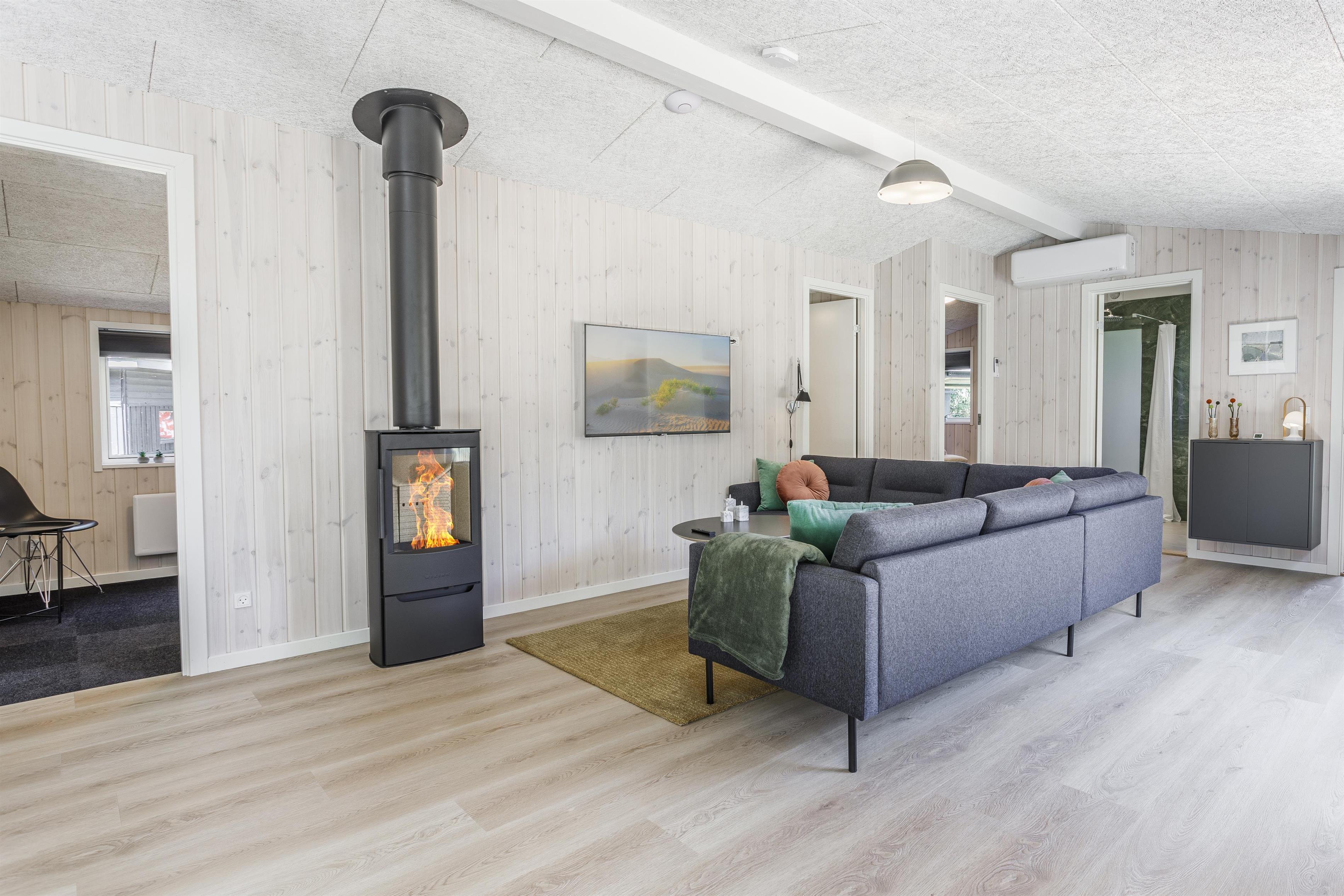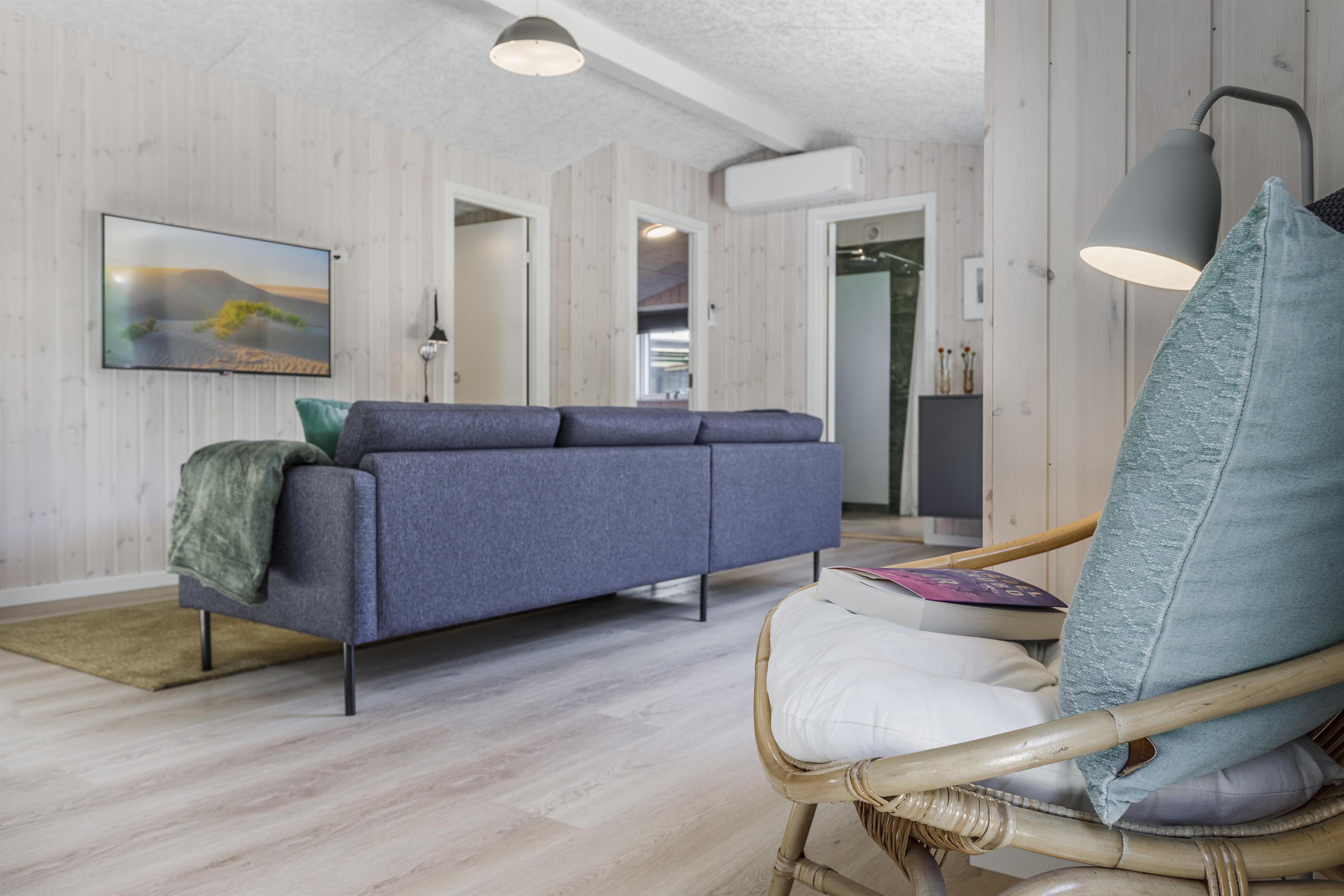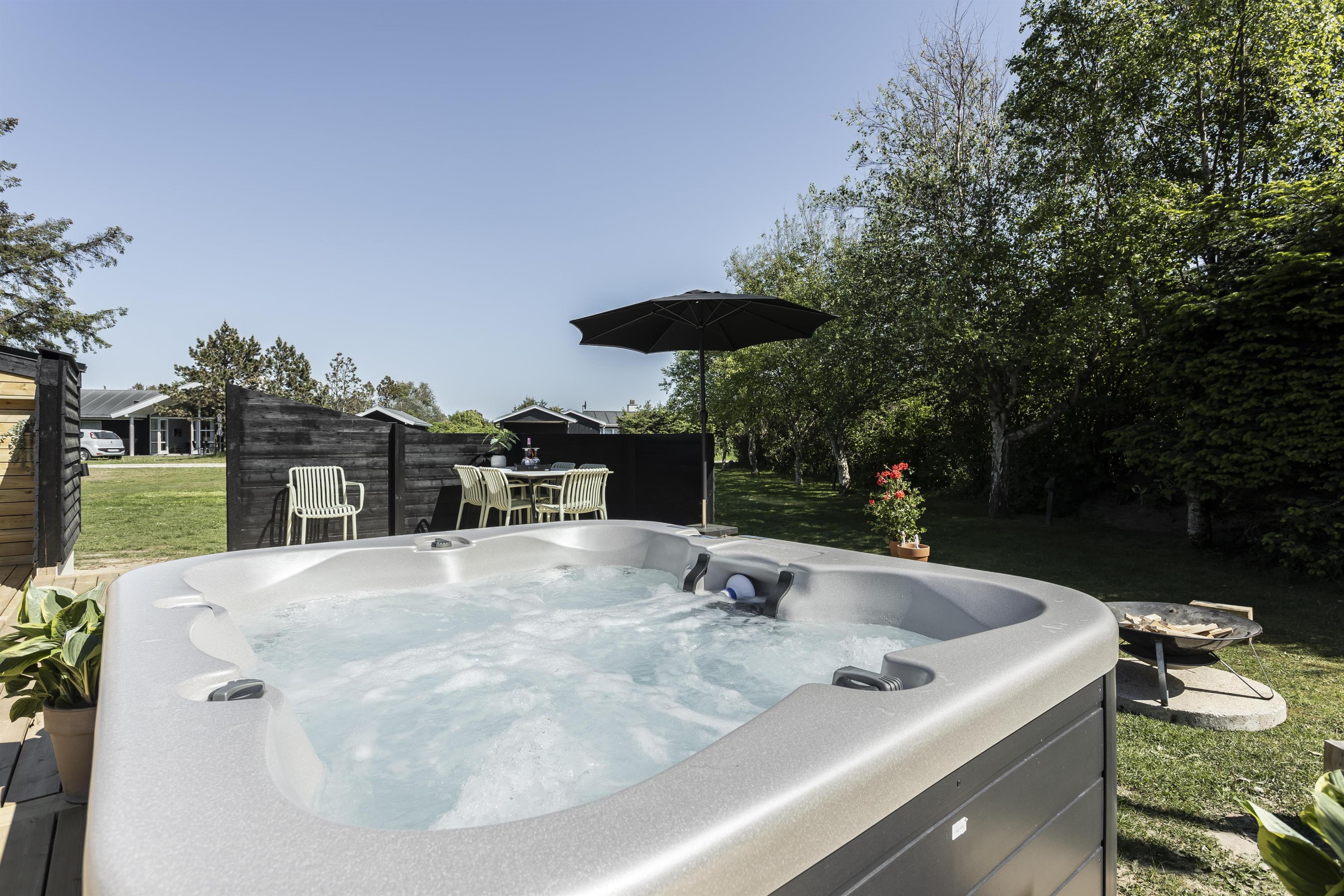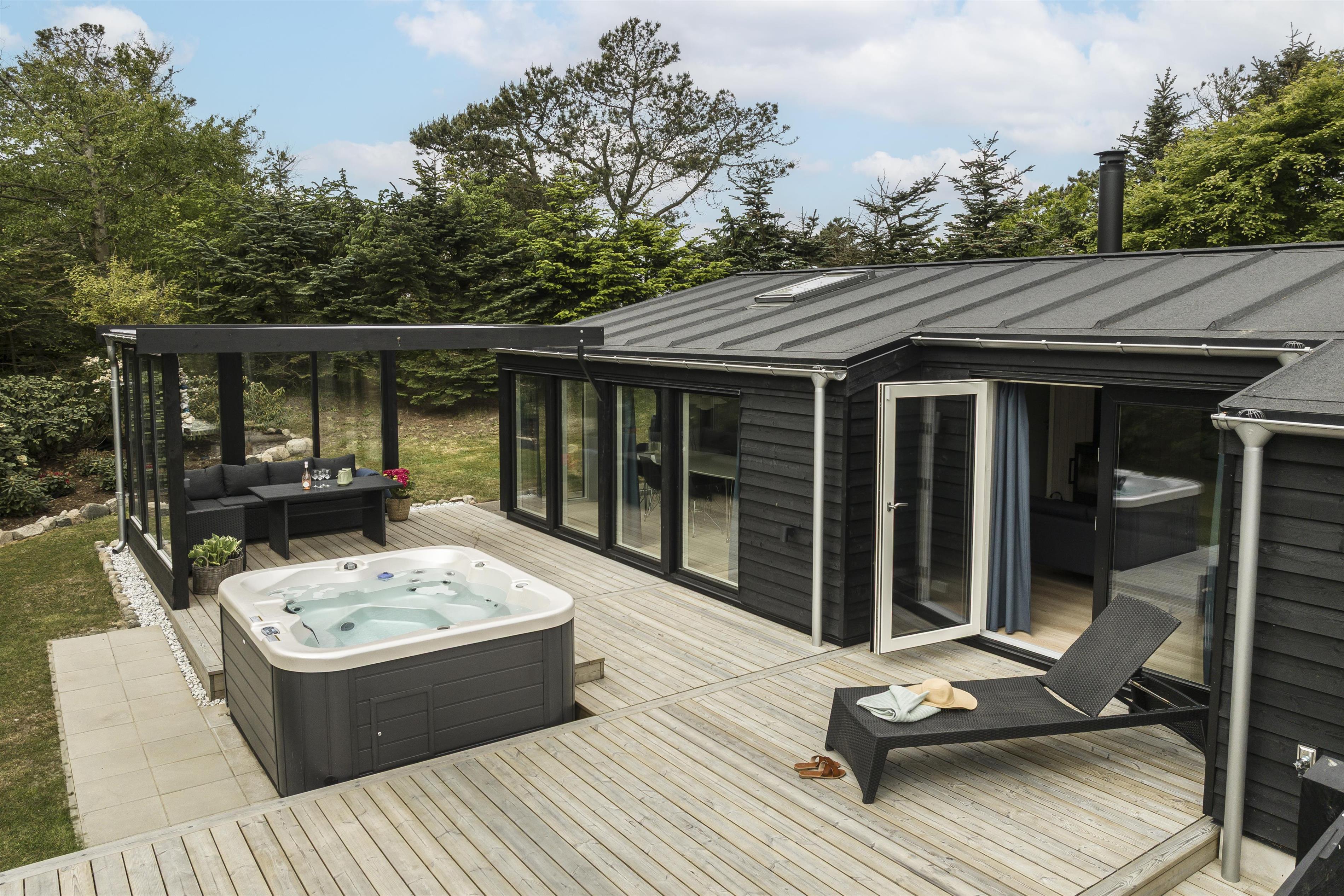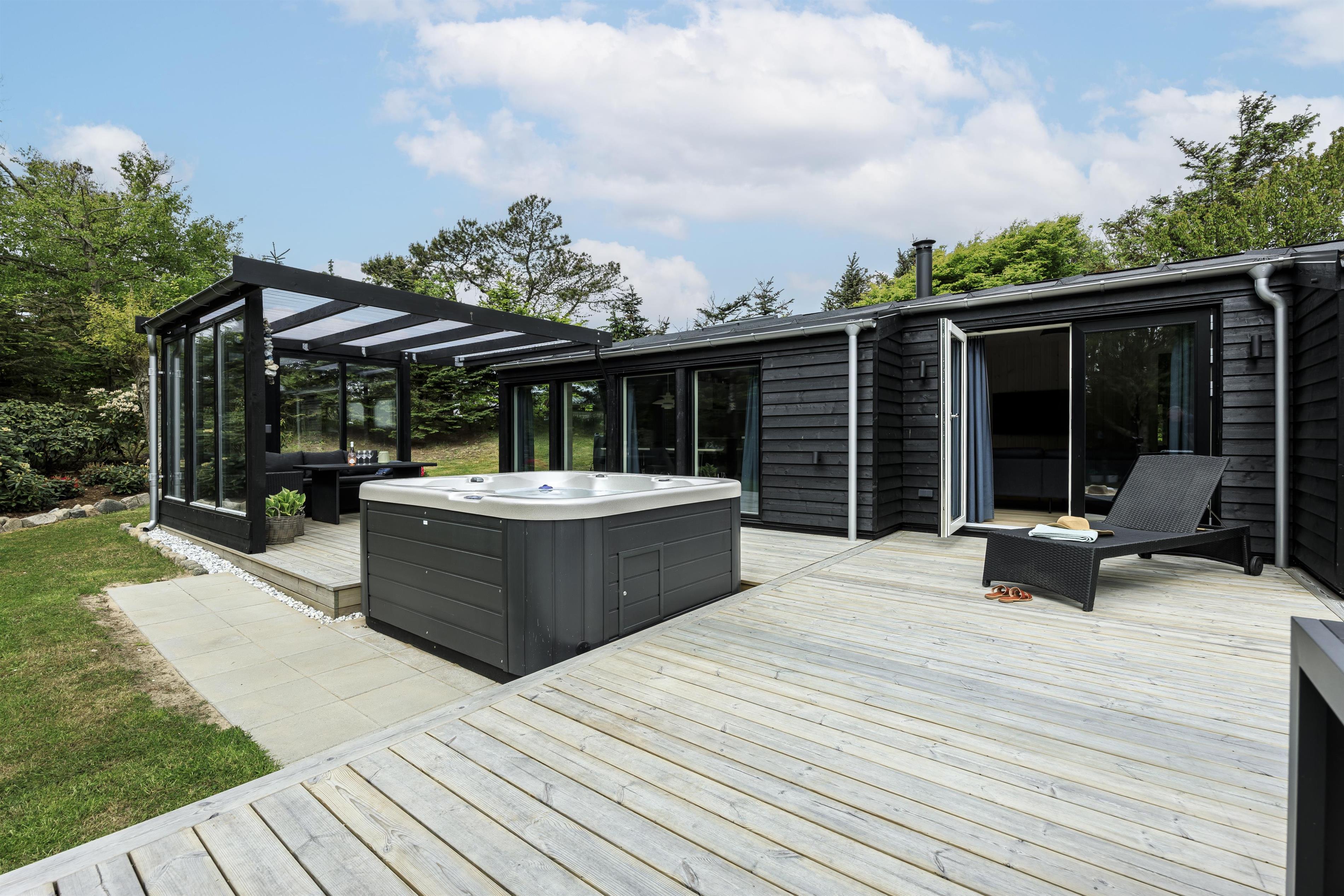 Prioriterer I frisk luft, luksus og komfort i jeres ferie, er dette helt nye feriehus det oplagte valg. Huset er yderst velindrettet både inde og ude. Her er højt til loftet og store gulv-til-loft-vinduespartier, som byder lyset ind i rummet. Feriehuset er indrettet med tre gode soveværelser samt et skønt badeværelse med gulvvarme. Dertil kommer et dejligt og rummeligt opholdsrum i åben forbindelse med køkkenet. Her er alt, hvad der skal bruges for en vellykket ferie. Der er rig mulighed for at samles omkring spisebordet til en spilaften eller sætte en god film på tv'et, hvis ikke vejret tillader, at man nyder de skønne terrasser, der omkranser huset. Fra opholdsrummet er der adgang til flere skønne terrasseområder, så der er rig mulighed for at følge solens stråler hele dagen lang eller søge læ for den til tider barske vestenvind. Tag en pause på solsengen med en god bog, eller hop i boblerne i det udendørs spabad og nyd vandmassagen og varmen herfra.