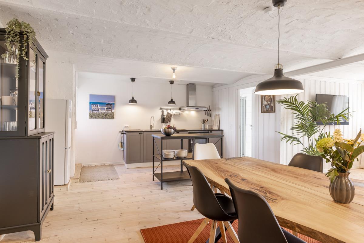 Træd ind i Kostalden og oplev en indbydende atmosfære, hvor de gamle buede loftshvælvinger er bevaret. I det store køkken-alrum kan måltiderne nydes ved det lange, håndlavede spisebord, og stuen er designet til at skabe hyggelige stunder.