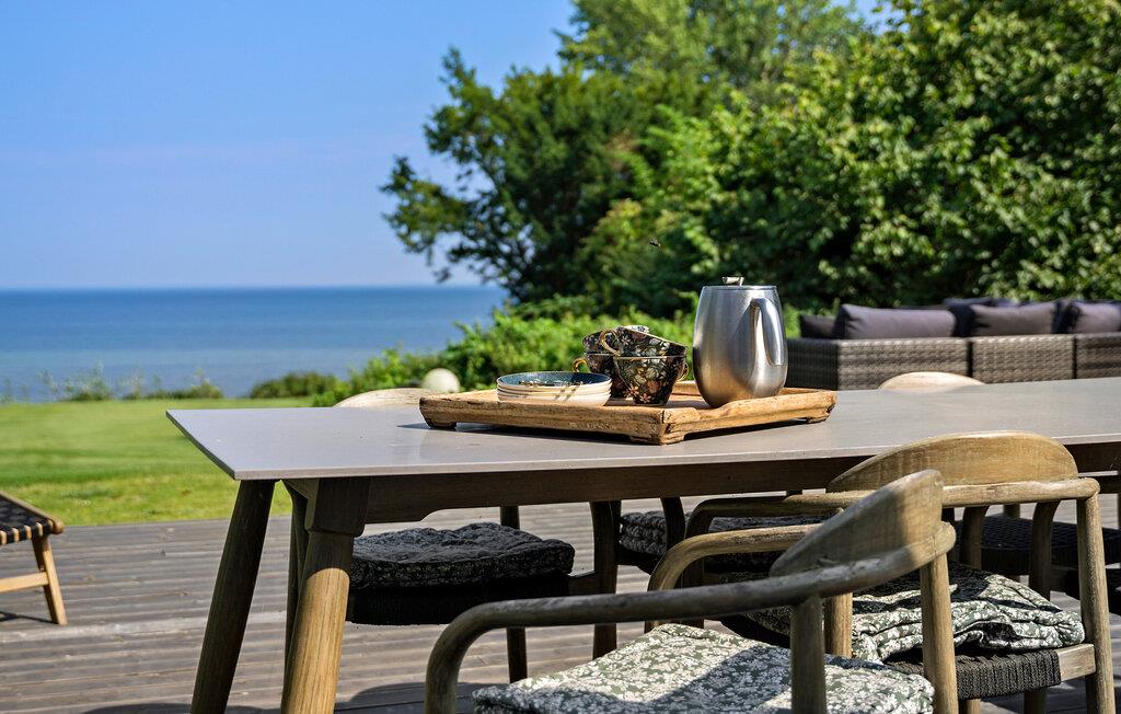 Feriehus ved Løserup Strand med panoramaudsigt og stor terrasse tæt på vandet.