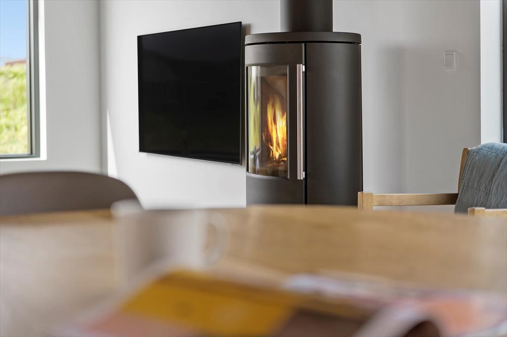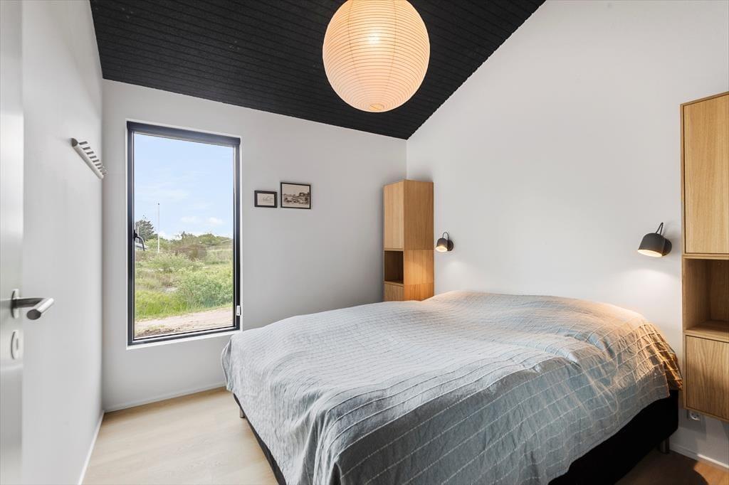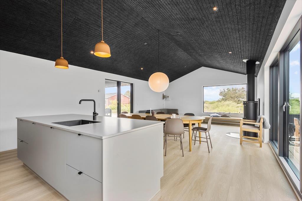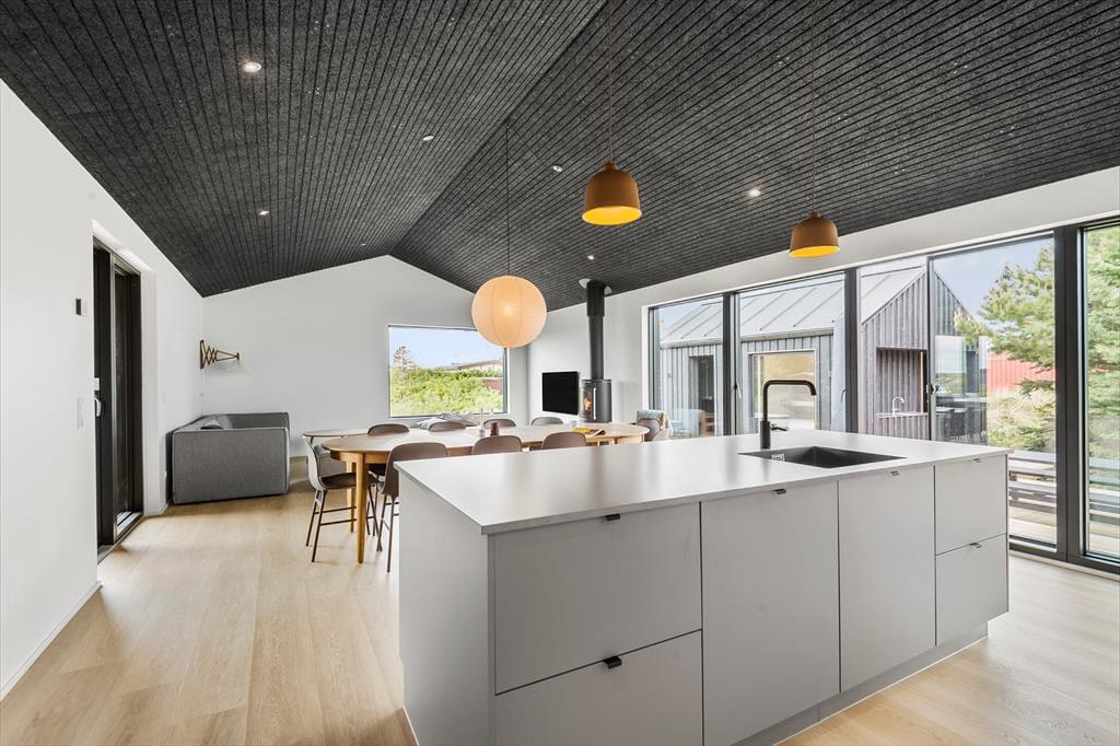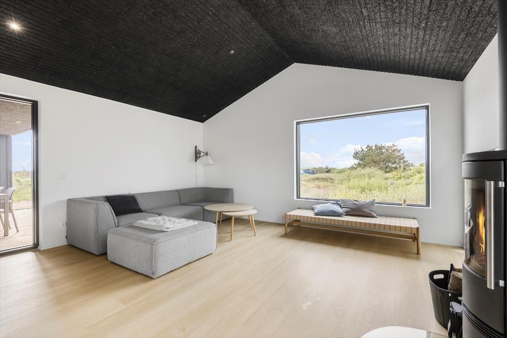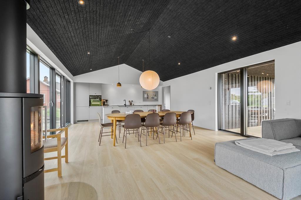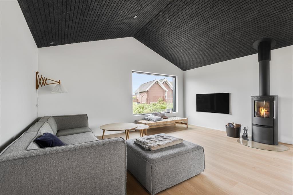 Det 135 m2 store sommerhus har en dejlig atmosfære med smukke, neddæmpede farvetoner, store vinduer og akustiklofter – og så er det helt op til dig og dine kære, om I vil slappe helt af i de rolige rammer, eller om I vil fylde rummene med grin, leg og glade dage. Et lækkert køkken er integreret med stuen, der har både brændeovn og fladskærms-tv placeret tæt på sofaafdelingen. Badeværelser er der to af, og når det er tid til at sove, har I fire soveværelser at vælge imellem. Det ene værelse er for øvrigt udstyret med en god alkove, så i alt er der sengepladser til 10 personer.