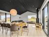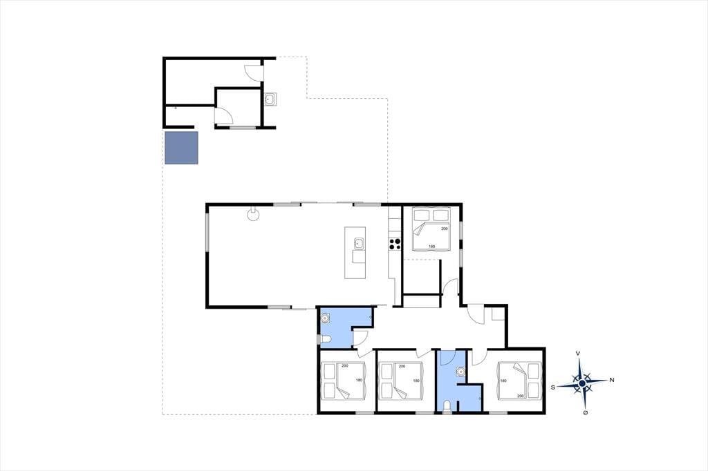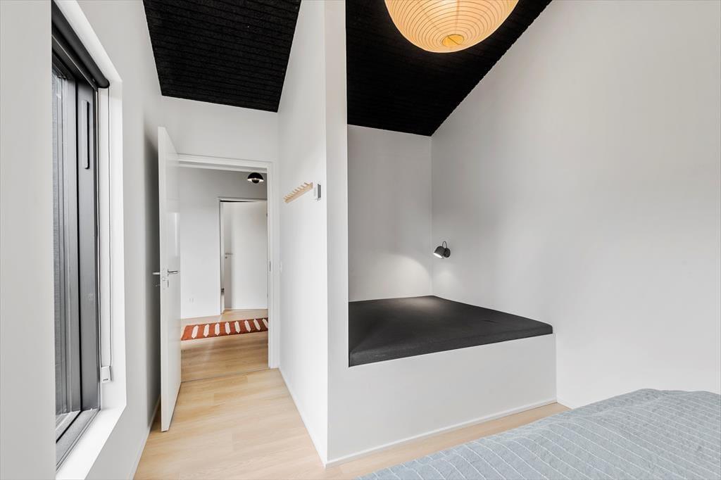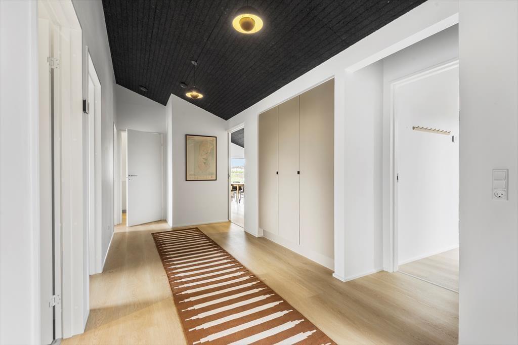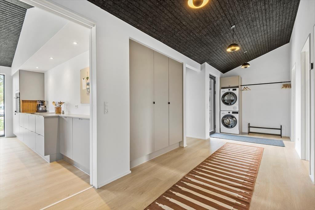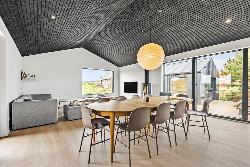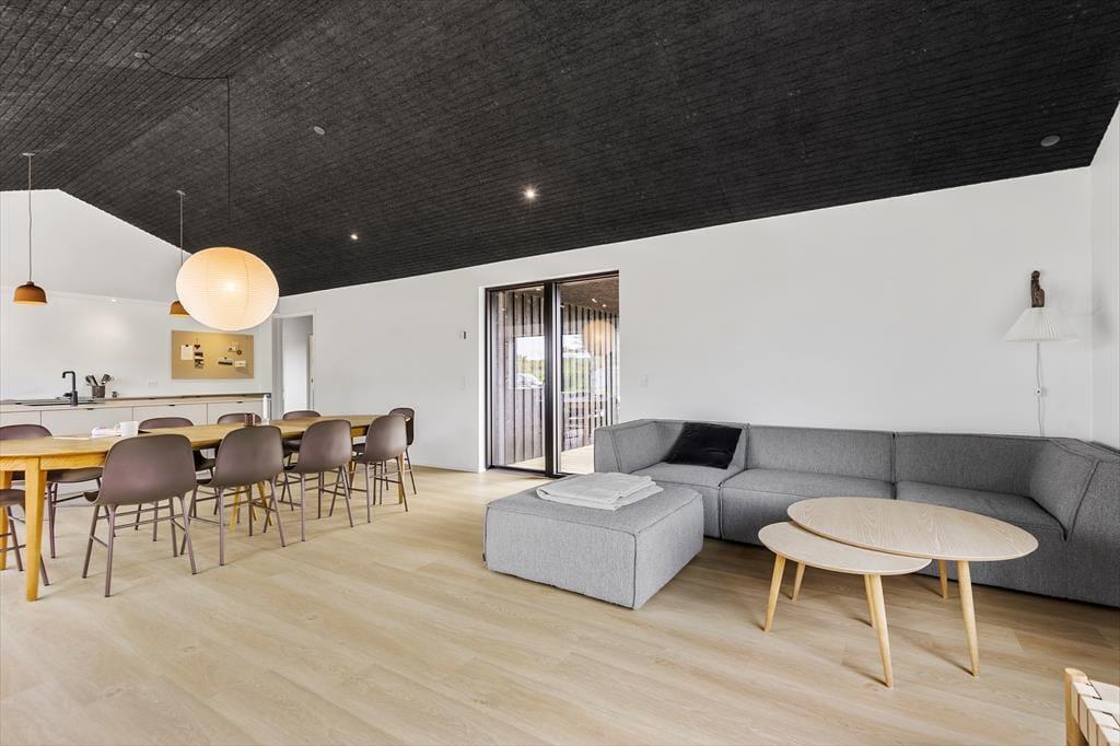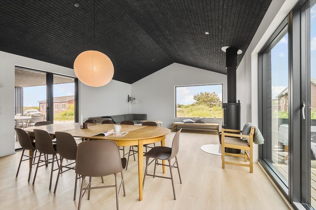 Det 135 m2 store sommerhus har en dejlig atmosfære med smukke, neddæmpede farvetoner, store vinduer og akustiklofter – og så er det helt op til dig og dine kære, om I vil slappe helt af i de rolige rammer, eller om I vil fylde rummene med grin, leg og glade dage. Et lækkert køkken er integreret med stuen, der har både brændeovn og fladskærms-tv placeret tæt på sofaafdelingen. Badeværelser er der to af, og når det er tid til at sove, har I fire soveværelser at vælge imellem. Det ene værelse er for øvrigt udstyret med en god alkove, så i alt er der sengepladser til 10 personer.