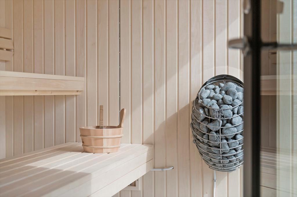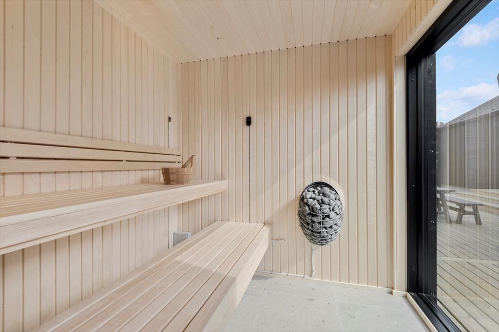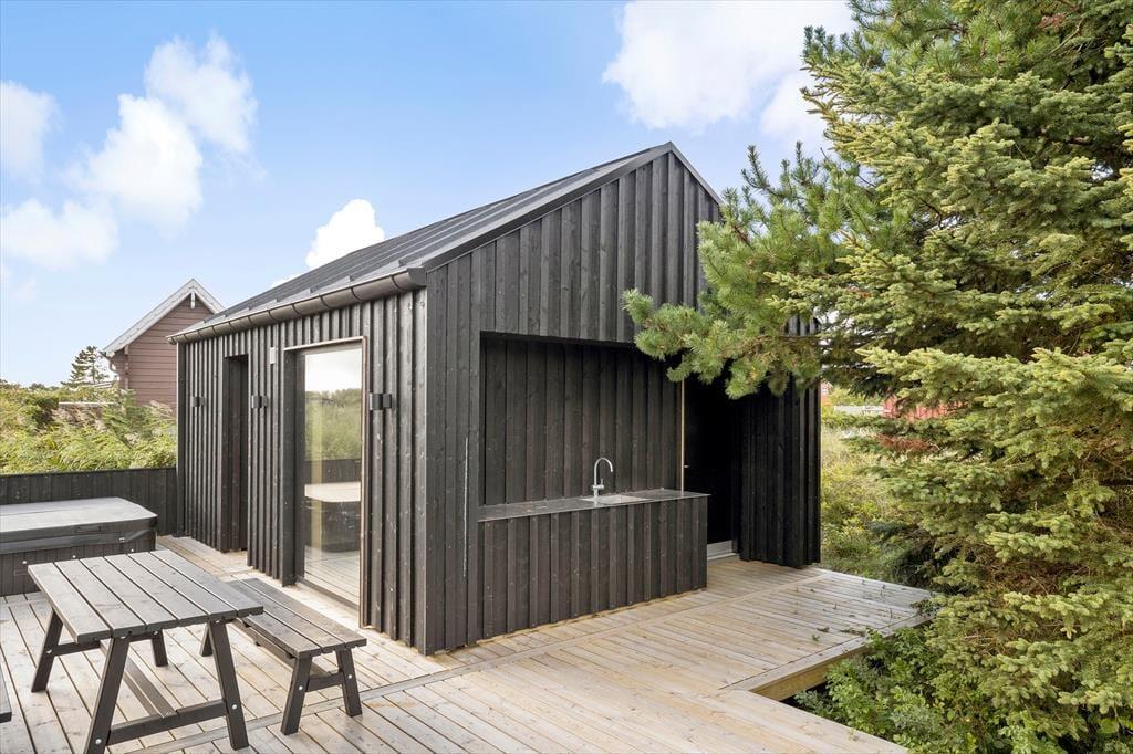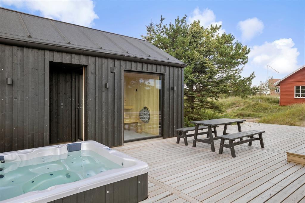 Når vejret er lunt og sommerligt, er det selvfølgelig fristende at tilbringe det meste af dagen på stranden. Men du kan nu også oplagt sætte flere timer af til at nyde ferietilværelsen på sommerhusets lækre terrasse, der breder sig mod øst, syd og vest. Her er der god plads til hele selskabet – og hvis du trænger til en rolig stund for dig selv, har du rig mulighed for at finde en plet i solen, hvor du kan stille liggestolen og lukke øjnene. Der er en parasol såvel som et overdækket areal, hvis du går efter skygge eller ly for duggen. Og måske særligt på de dage eller aftener, hvor det er lidt køligere i luften, kan du benytte dig af den udendørs wellnessafdeling: Glæd dig til at slappe af med saunature og et varmt spabad i de fredelige omgivelser.