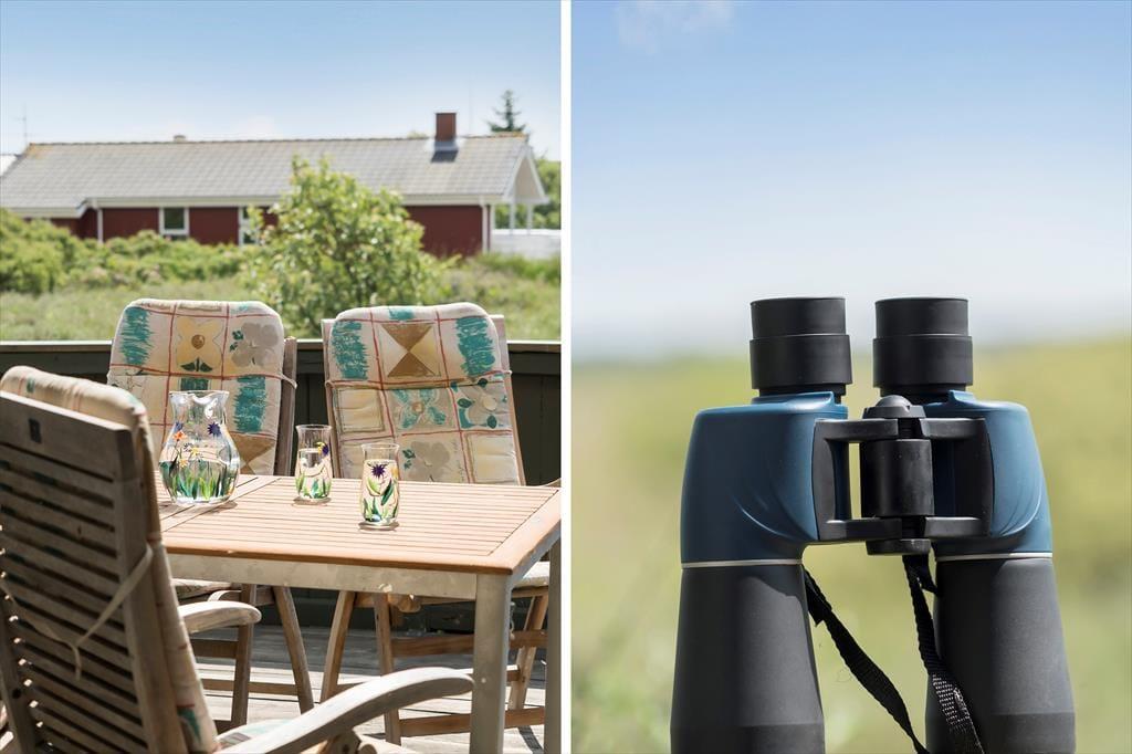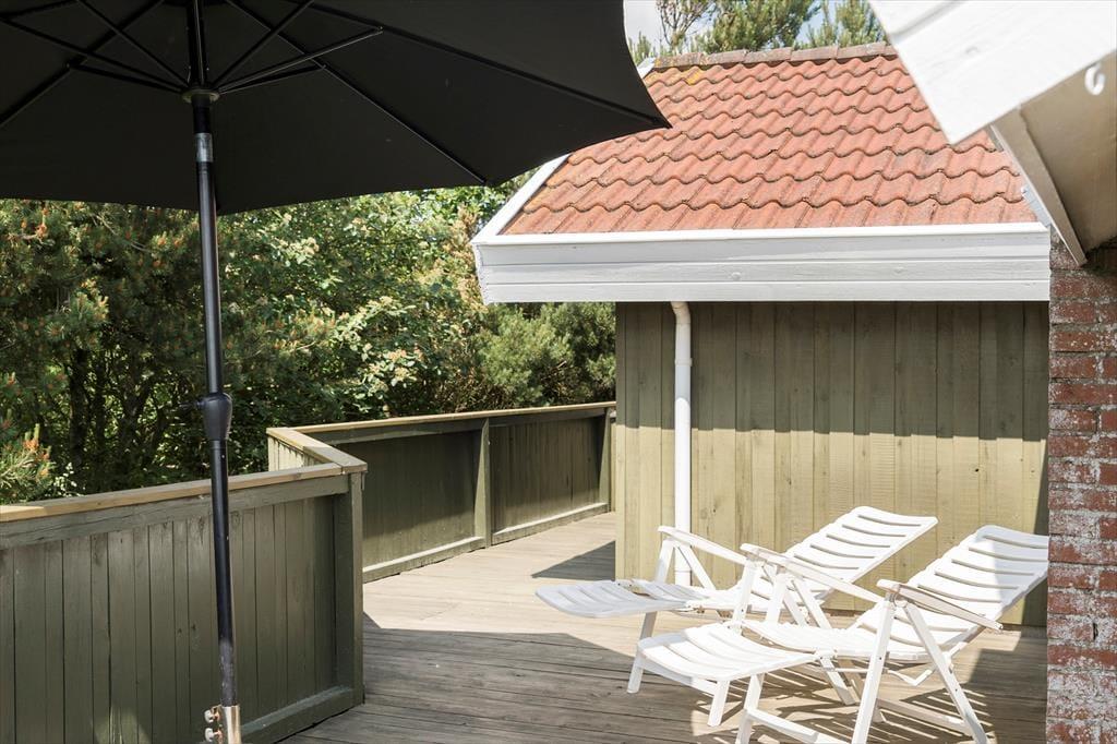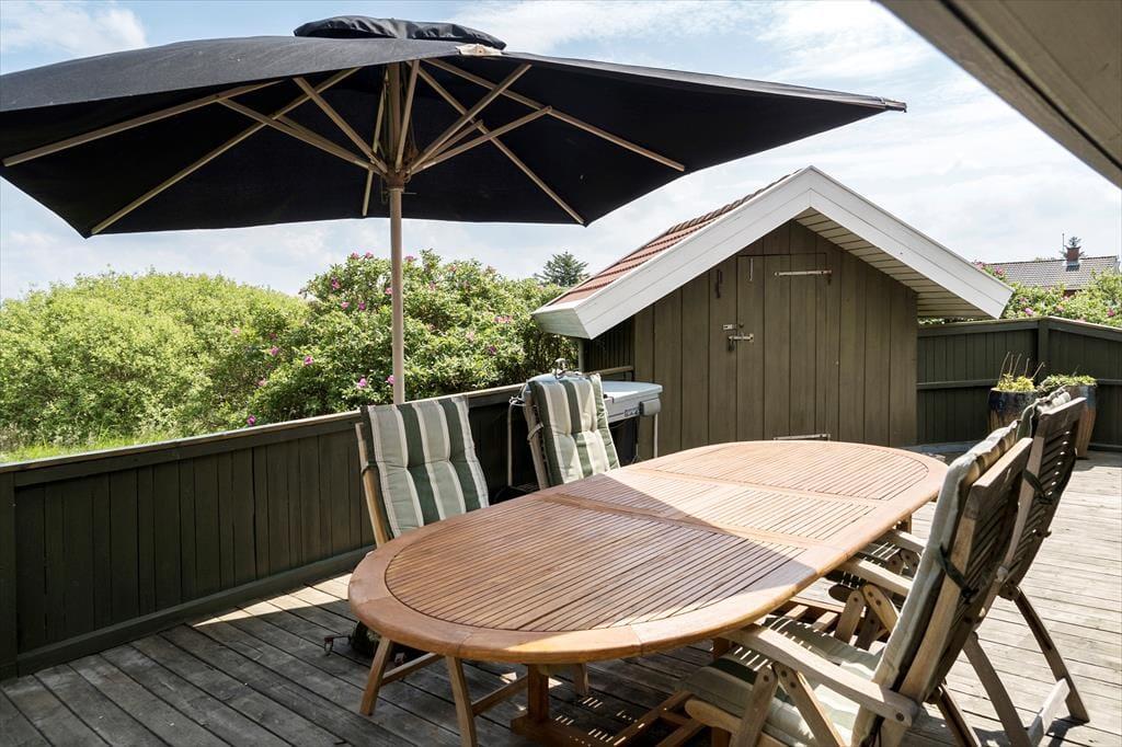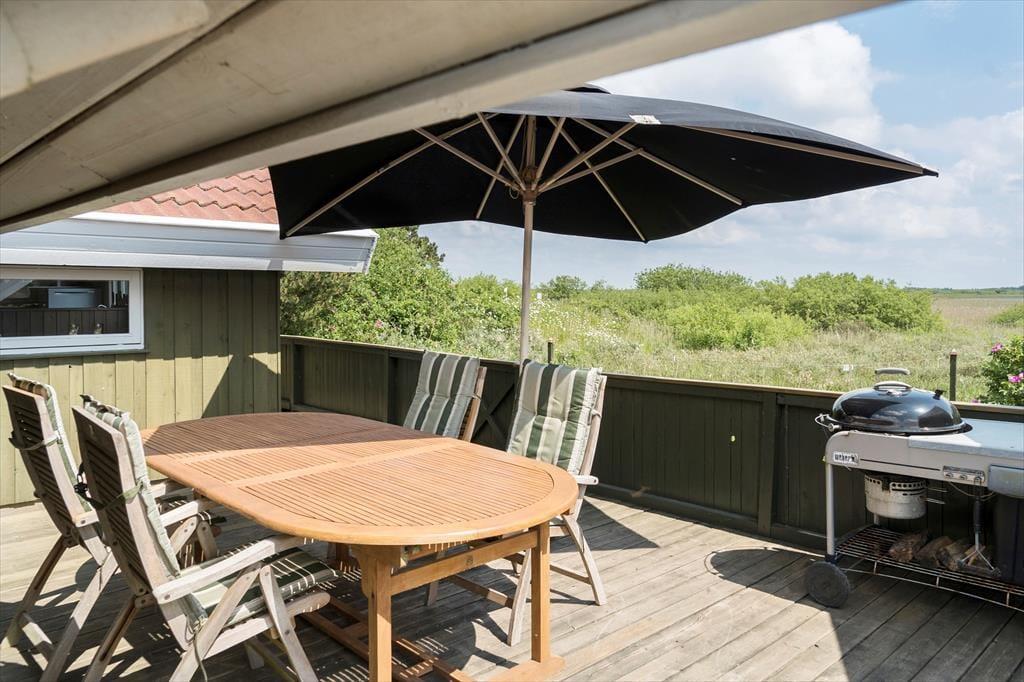 Sommerhusets terrassemiljø er opdelt i flere dejlige områder, så det er nemt at finde den helt rette solkrog eller skyggefulde opholdsplads at nyde udelivet i. Den østvendte del af terrassen har den smukkeste udsigt over det betagende landskab, og herfra går der en trappe ned til et grønt areal, hvor du kan få græs under tæerne og hænge badehåndklæderne til tørre – og lege med børnene eller hundene, hvis du har sådan nogle med på ferie. Huset er udstyret med en grill, så om aftenen kan du fylde luften med duften af frisktilberedte majskolber og andre lækkerier.