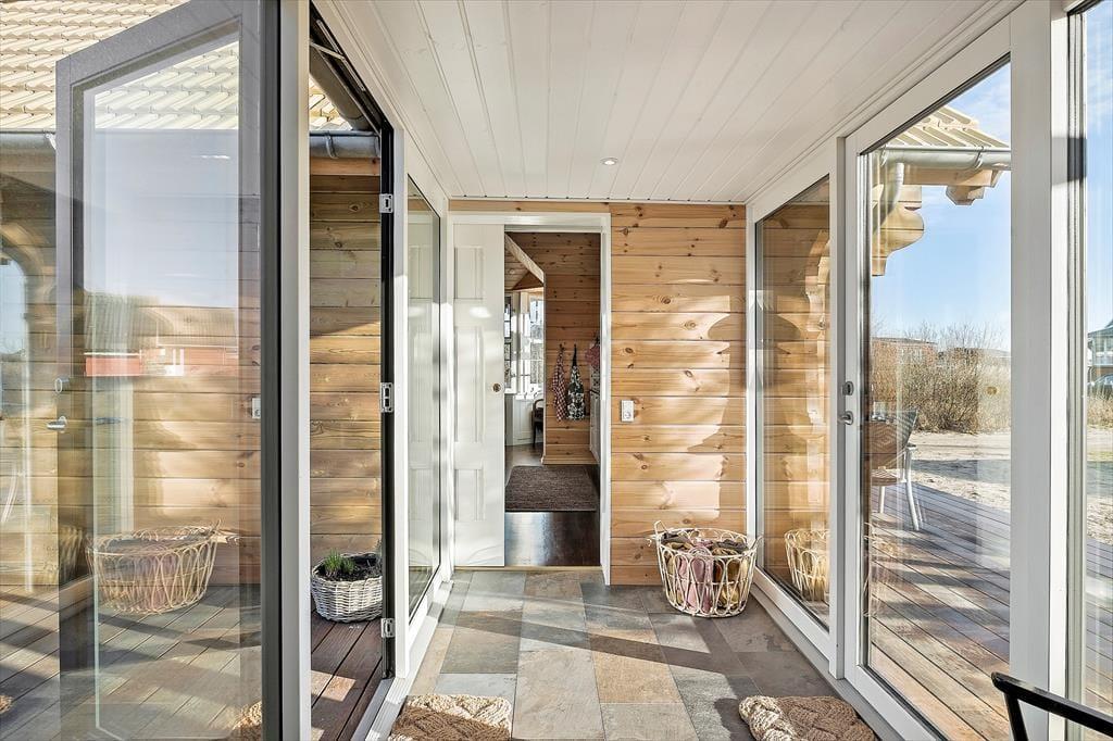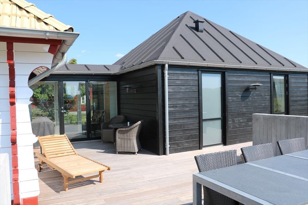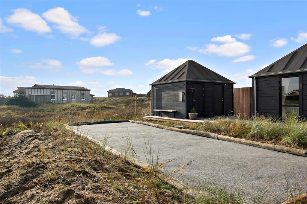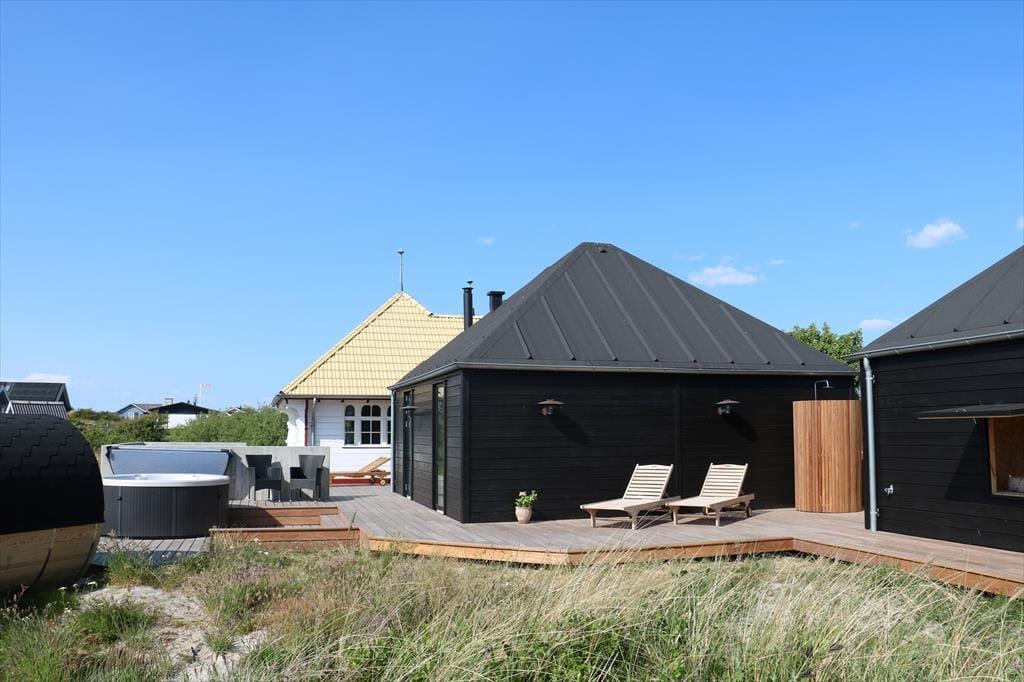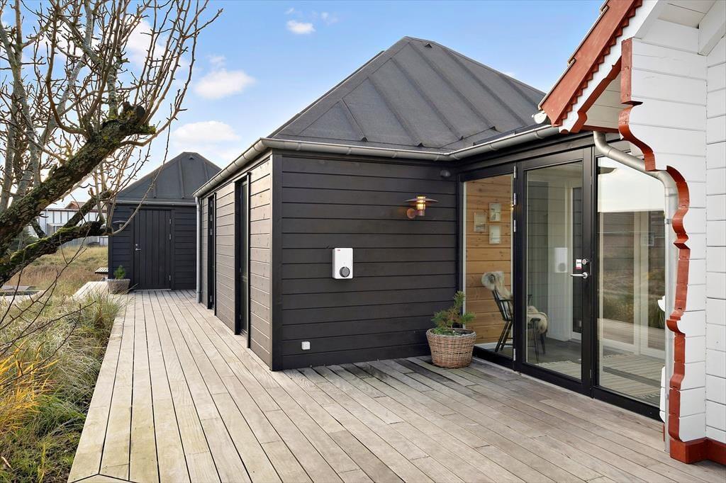 Ikke bare fra entréen, men fra alle rum i tilbygningen har I direkte adgang til det fri, så det er særdeles let at komme ud i solen. Rundt om sommerhuset breder et lækkert terrassemiljø sig med mange gode opholdspladser og lækroge. Til livsnyderne er der petanque bane, udespa, koldtvandsbadekar, saunatønde og udebruser og et shelter giver jer mulighed for at få en siesta i skyggen – eller at tilbringe natten i den friske havluft. Kommer I i elbil, er der lader ved huset.
