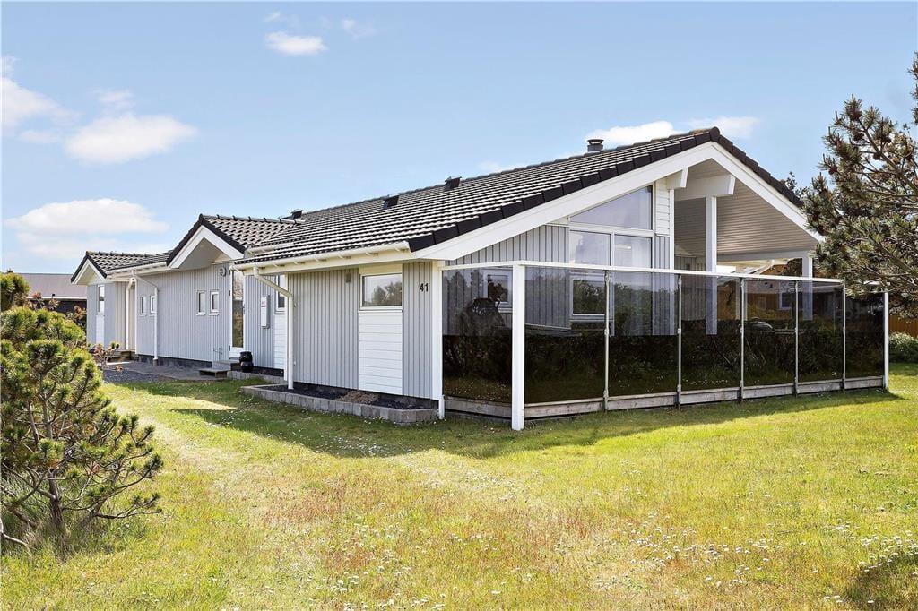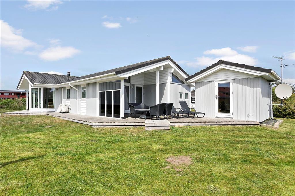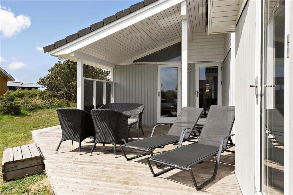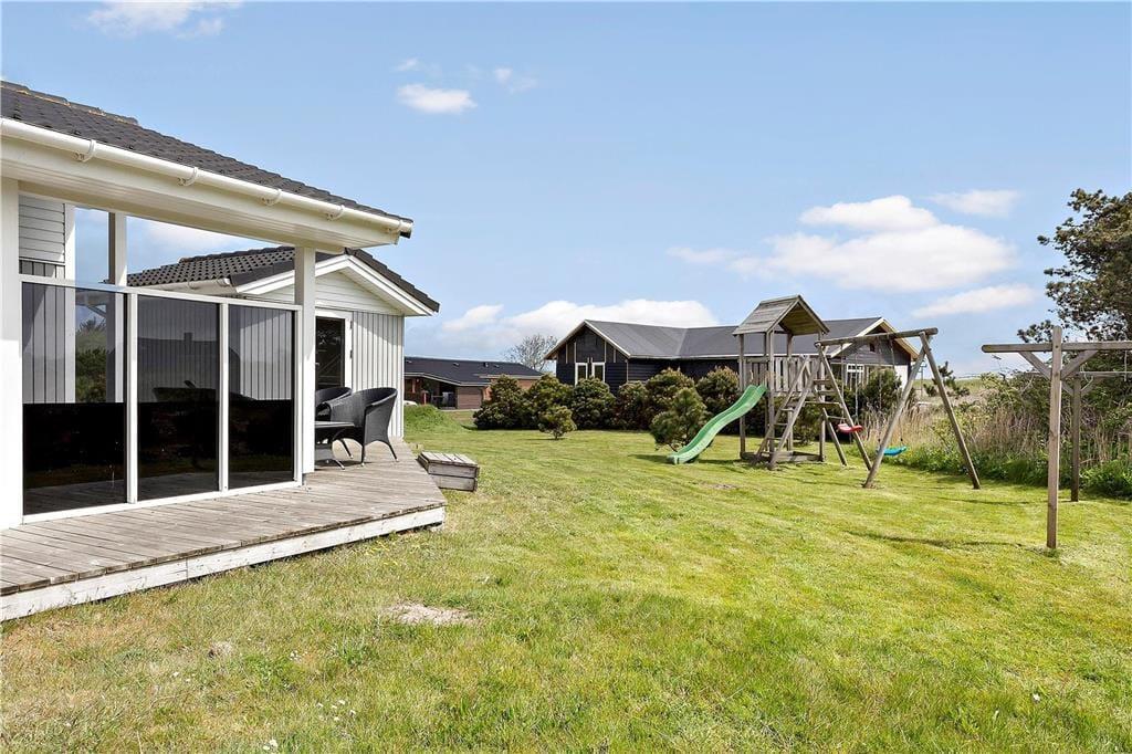På sommerhusets store grund er der god plads til at lege og spille bold på græsplænen, og til de yngste feriegæster er der både sandkasse og gyngestativ. Hele familien kan nyde godt af det dejlige terrassemiljø, der breder sig om flere sider af sommerhuset. På terrassen er der flere overdækkede områder, hvis I får brug for skygge i middagsheden – og takket være afskærmningen på den vestvendte terrasse kan I sagtens finde læ selv på en dag med vestenvind.