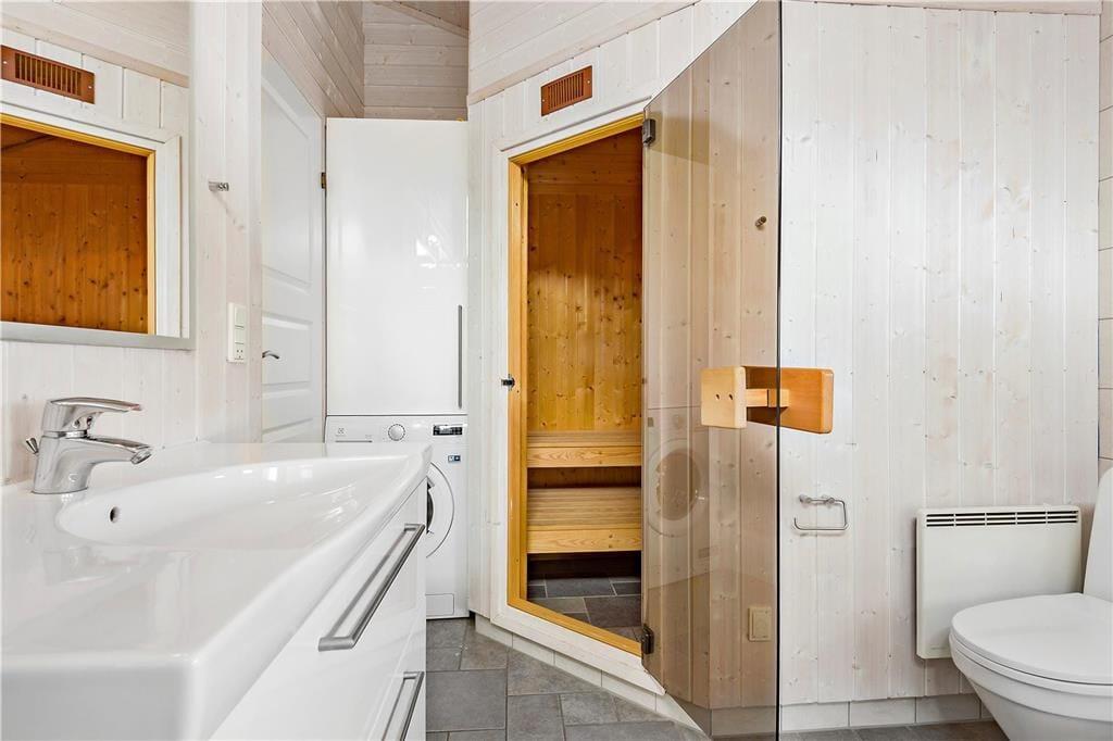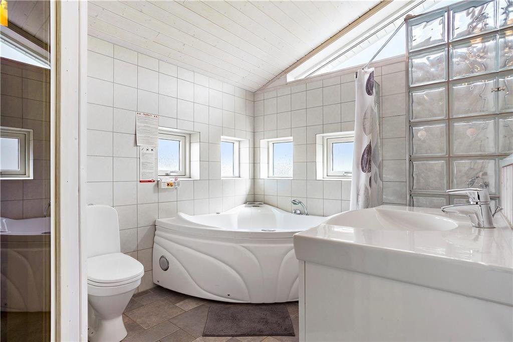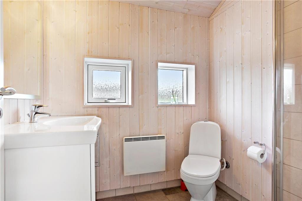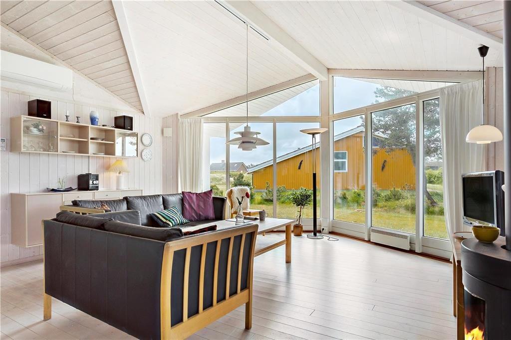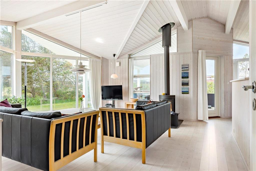 Dagslyset strømmer ind gennem sommerhusets store vinduespartier, hvilket bidrager til den behagelige atmosfære inden døre. Det gælder ikke mindst i opholdsrummet, hvor der er loft til kip, lyse trælister på væggene og pænt møblement, og midtfor står den førnævnte brændeovn, som I kan tage i brug på kølige aftener. En blæsende efterårsdag er det også skønt at tage et afslappende spabad og en tur i saunaen – for eksempel efter en lang gåtur ved Lakolk Strand. Spabadet og saunaen er installeret på det ene af husets to badeværelser, som for øvrigt begge er lyst og enkelt indrettet. Endelig består planløsningen af tre gode soveværelser, hvoraf to er udstyret med dobbeltseng og et med to enkeltsenge.