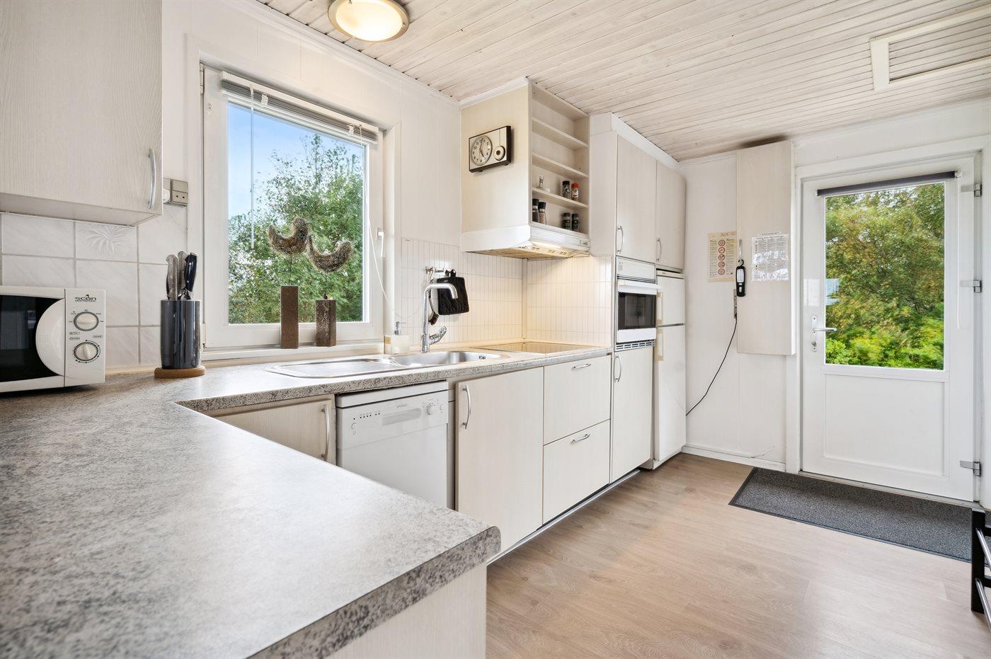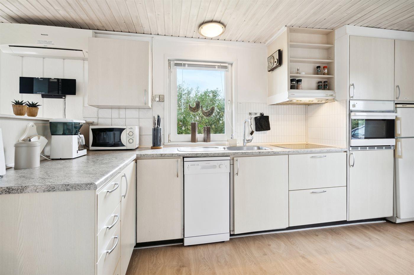 Køkkenet er udstyret med 1 køleskab, varmluftovn, mikrobølgeovn samt opvaskemaskine.