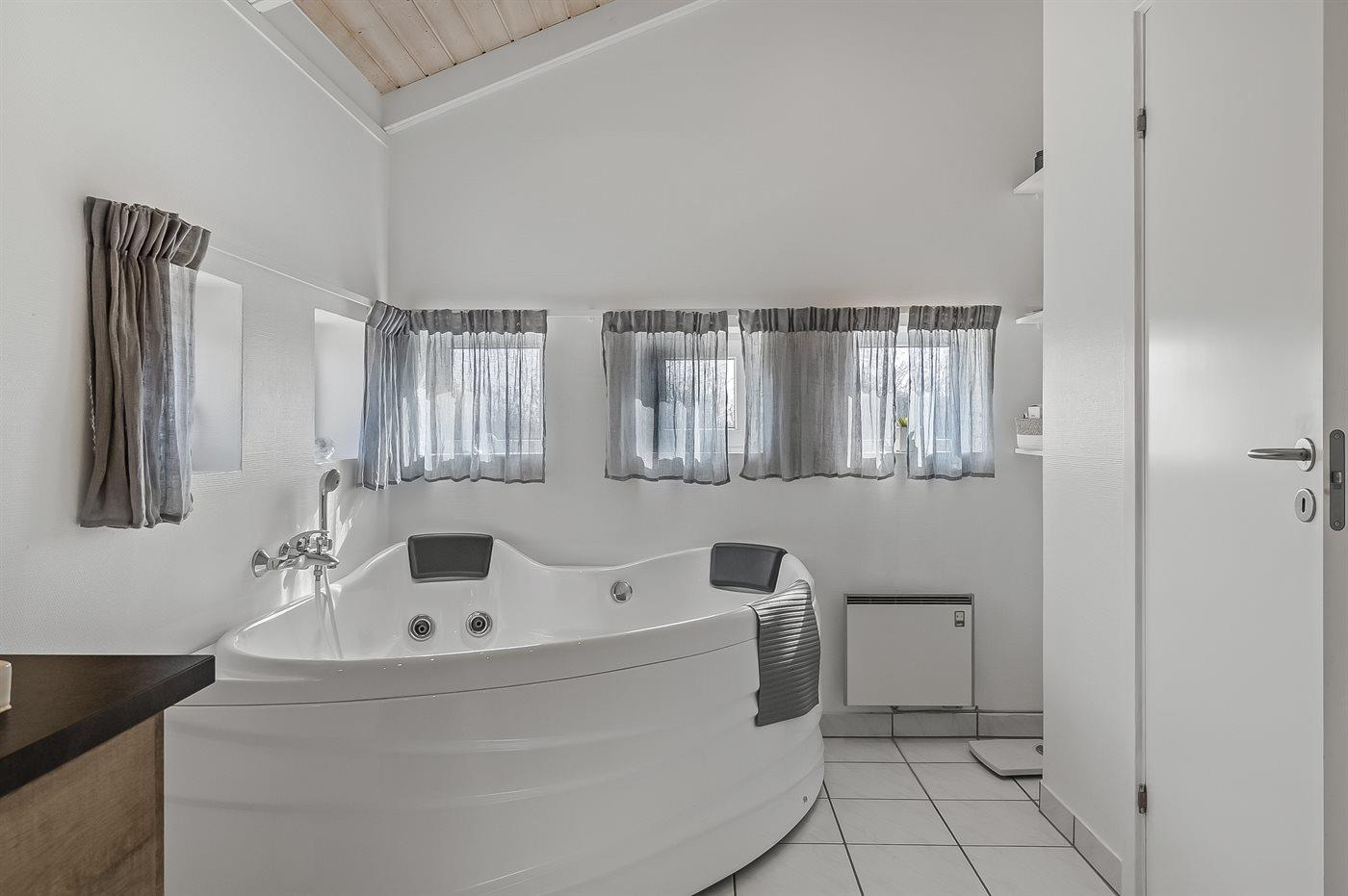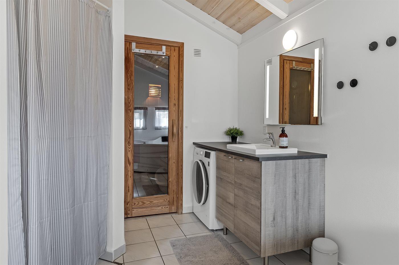 Der er 1 badeværelse med bruser og 1 toilet., heraf 1 gæstetoilet. Der er gulvvarme på 1 badeværelse. I saunaen er der mulighed for afslapning.