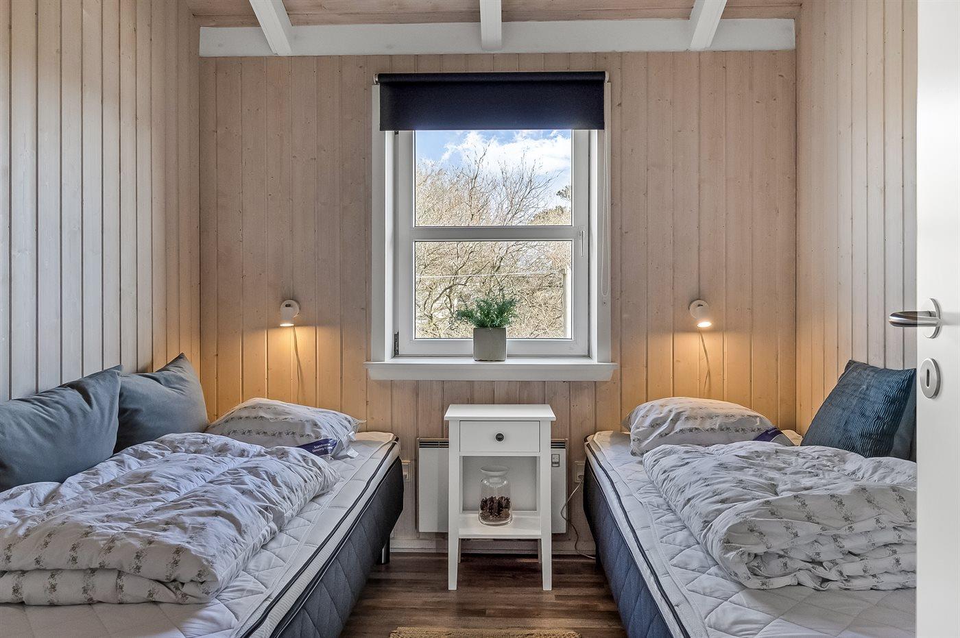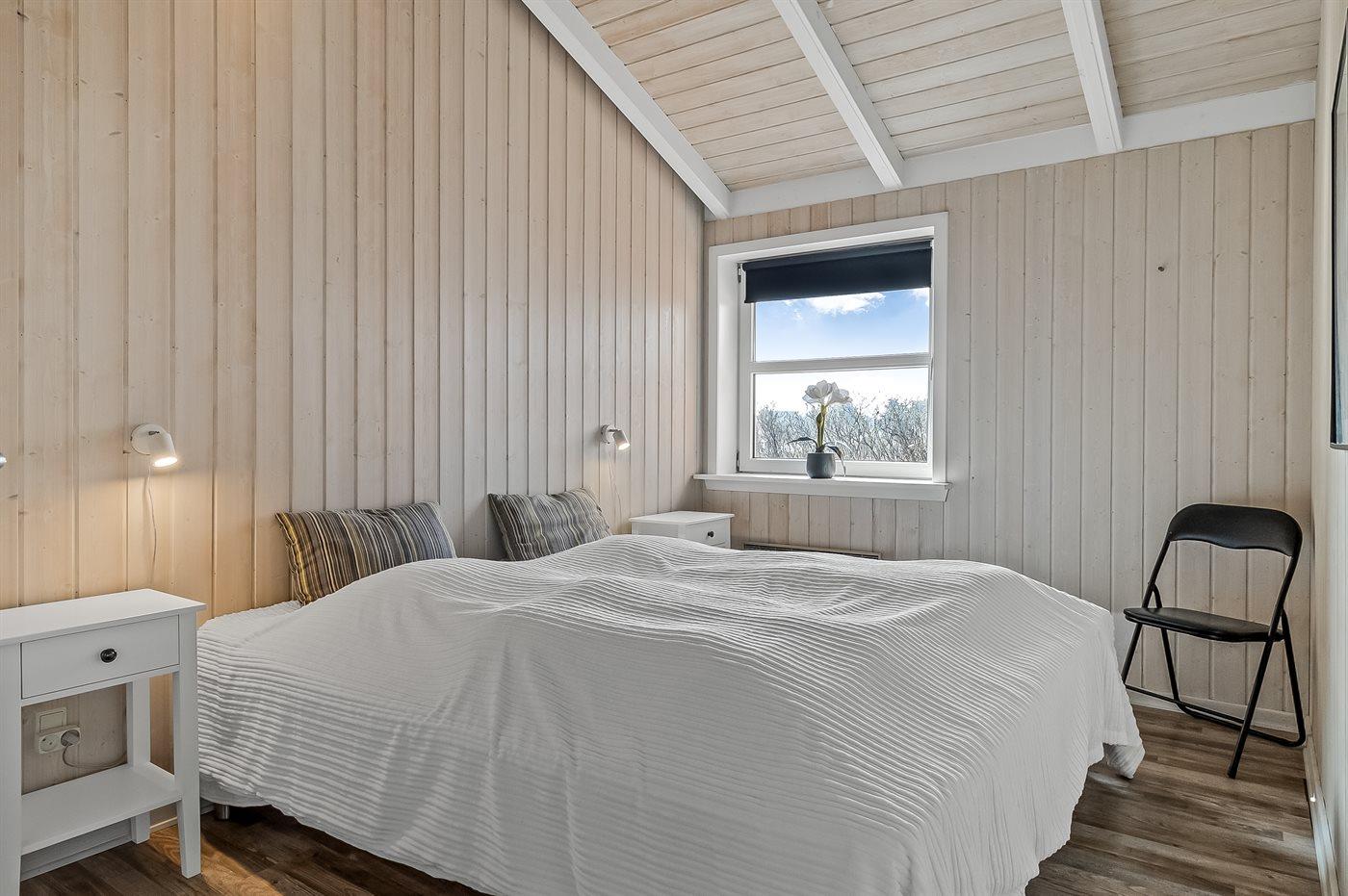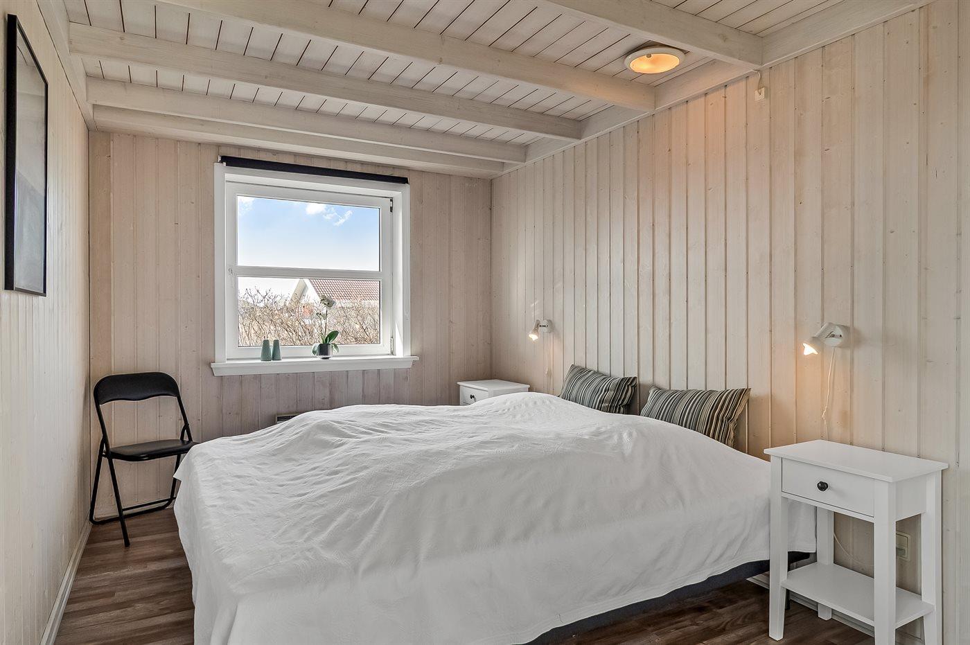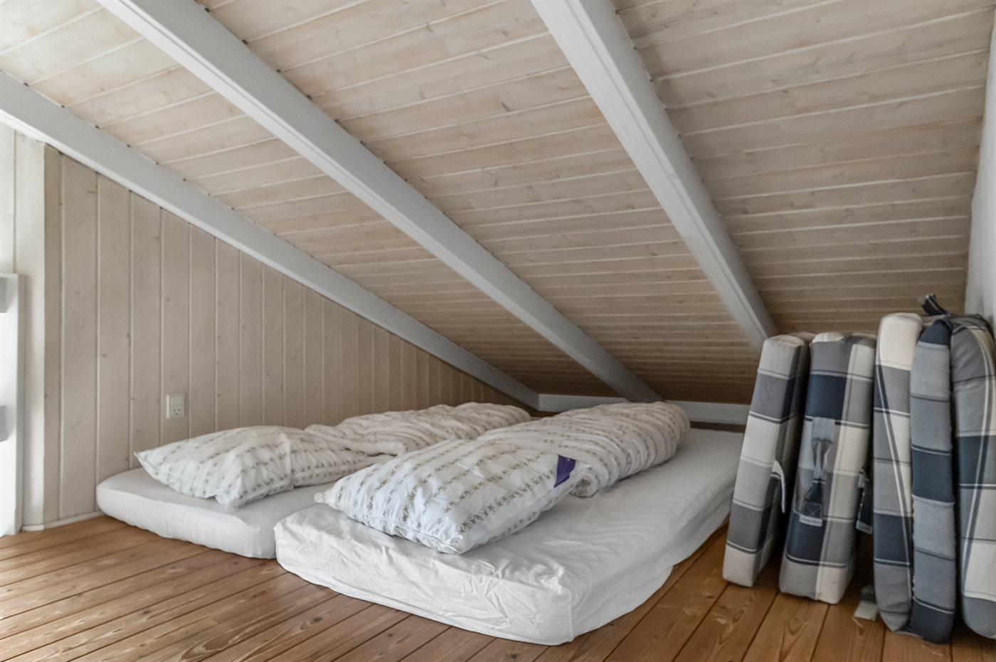 Der er i alt 3 soveværelser. Sovepladserne fordeler sig på: 4 sovepladser i dobbeltsenge. 2 sovepladser i enkeltsenge. 2 sovepladser på madrasser. 2 af disse sovepladser befinder sig på husets hems. Derudover er der 1 stk. barneseng.