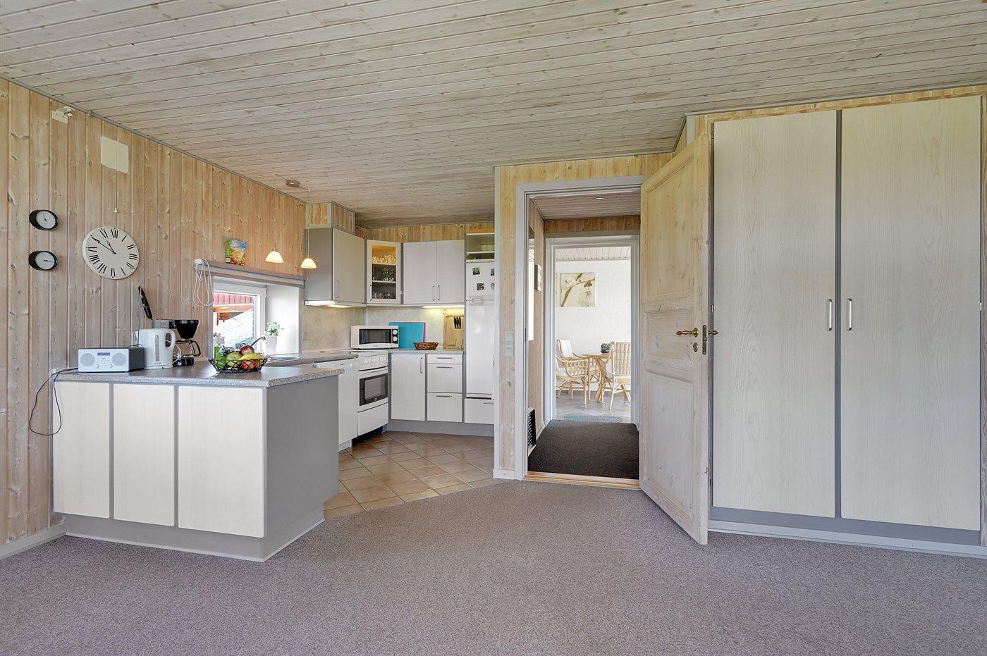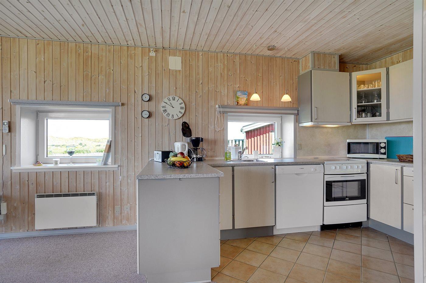 Køkkenet er udstyret med 1 køleskab. Der er 4 keramiske kogeplader, varmluftovn, mikrobølgeovn samt opvaskemaskine.