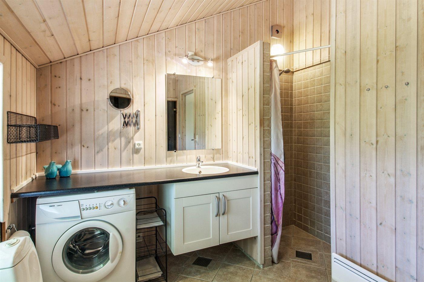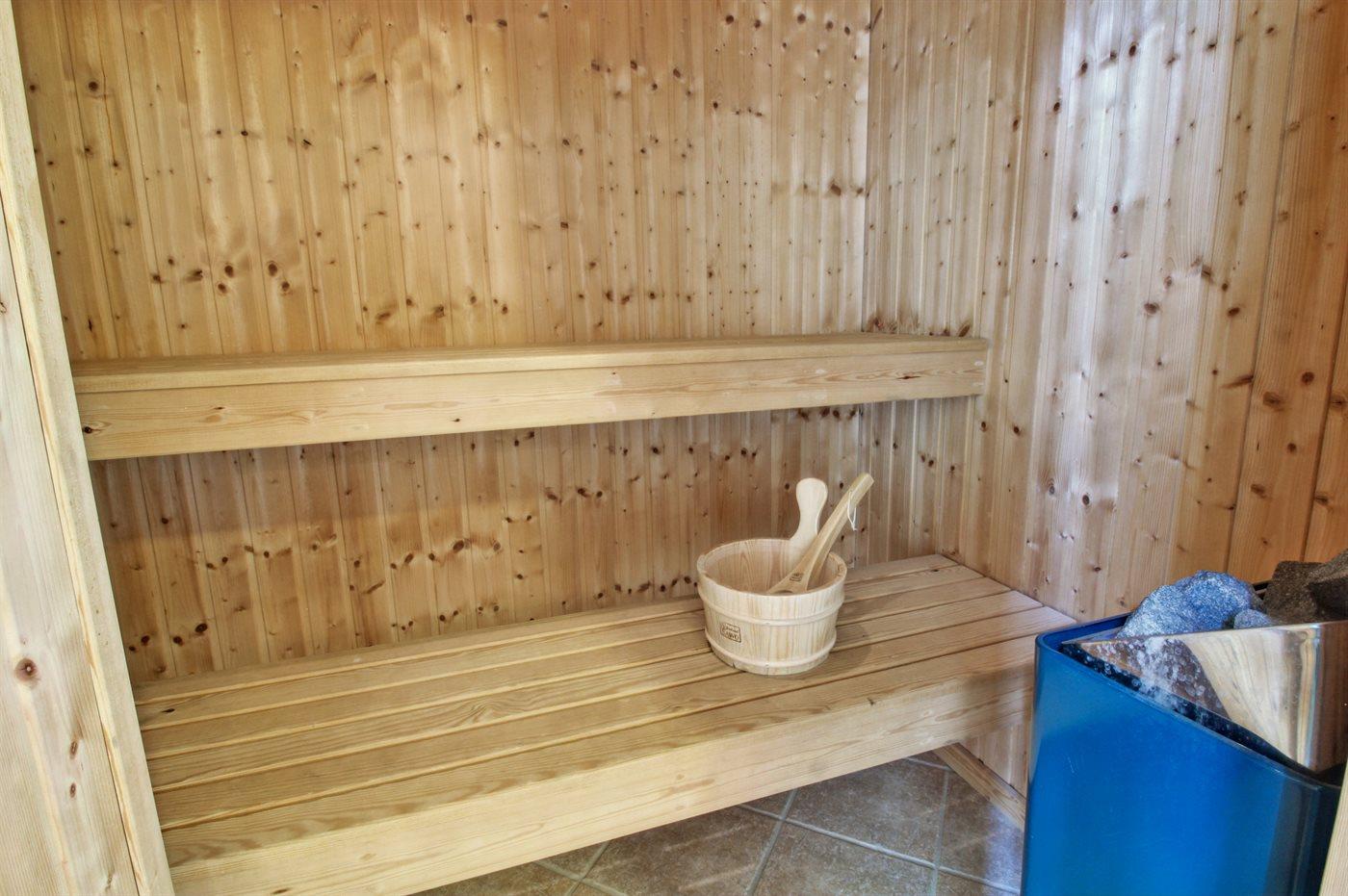 Der er 1 badeværelse med bruser og 1 toilet.. Der er gulvvarme på 1 badeværelse. I saunaen er der mulighed for afslapning.