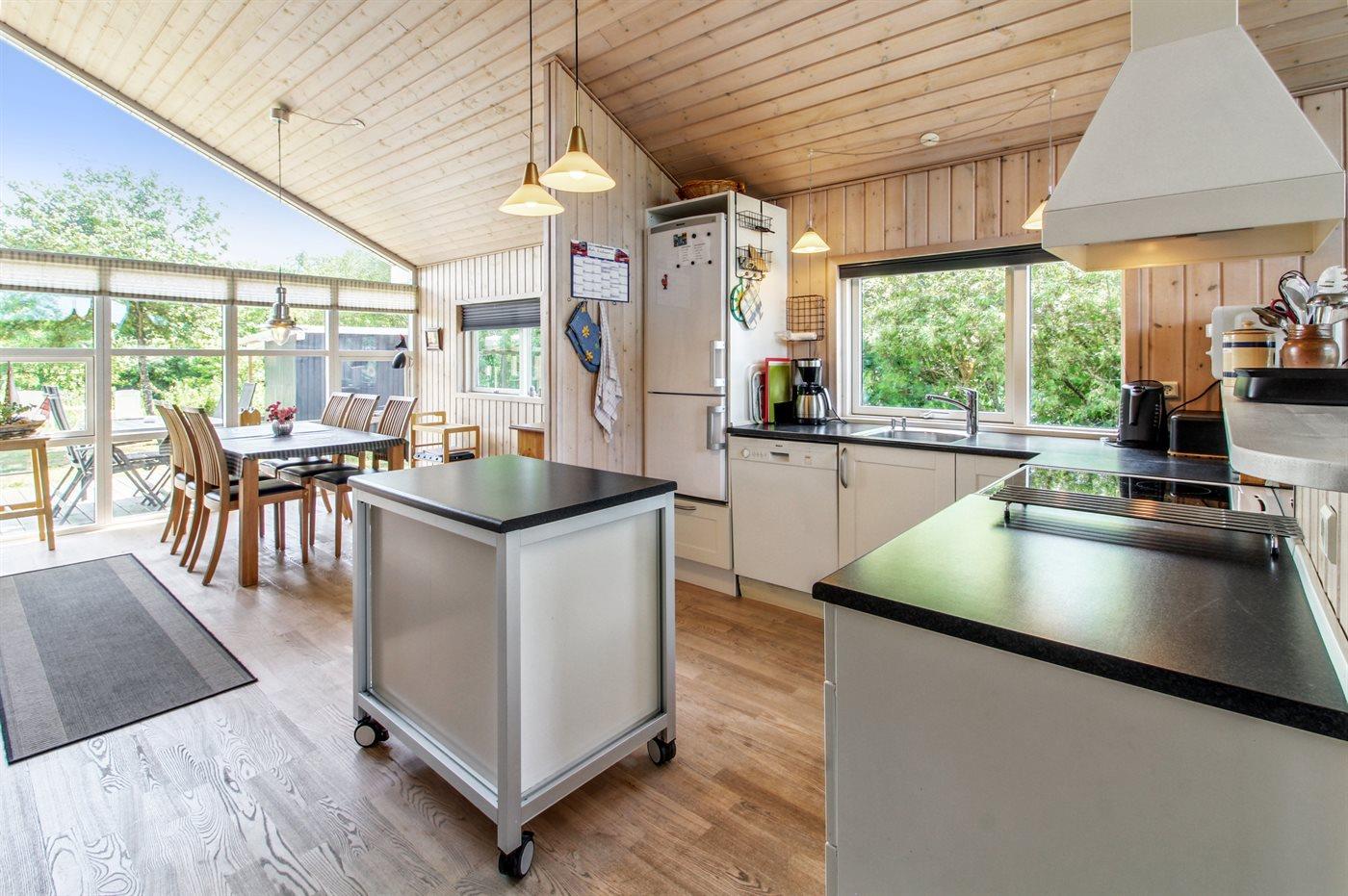 Køkkenet er udstyret med 1 køleskab. Der er 4 elkogeplader, bageovn, mikrobølgeovn samt opvaskemaskine.
