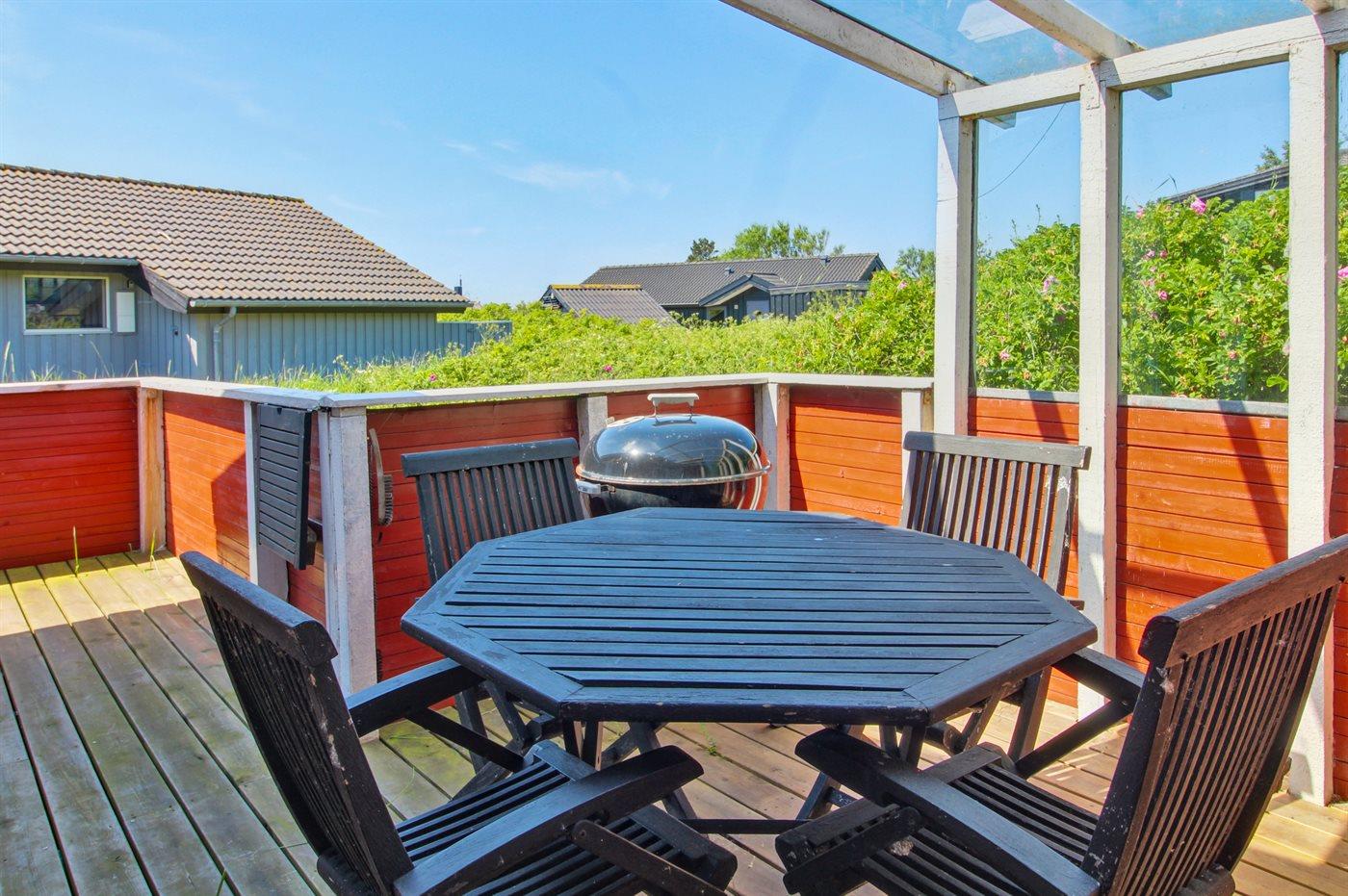 Ferieboligen er beliggende på en 210 m² stor naturgrund. Der er 800 m til havet. Nærmeste forretning er beliggende i en afstand af 500 m. Til ferieboligen hører åbent terrasseareal. Desuden er der overdækket terrasse. Der er installeret stik til opladning af elbil. Parkering ved ferieboligen.