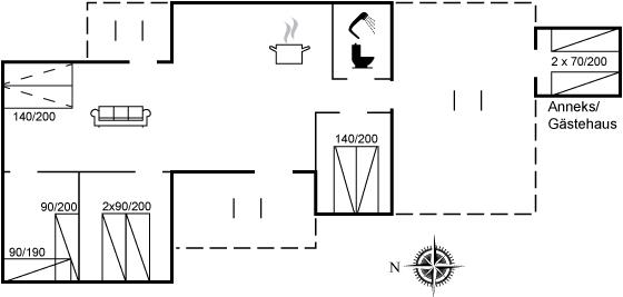 Der er i alt 4 soveværelser. Sovepladserne fordeler sig på: 4 sovepladser i dobbeltsenge. 4 sovepladser i enkeltsenge. 2 sovepladser i sovesofa (dobbelt). 2 af disse sovepladser befinder sig i et anneks og 2 af dem befinder sig i opholdsstuen.