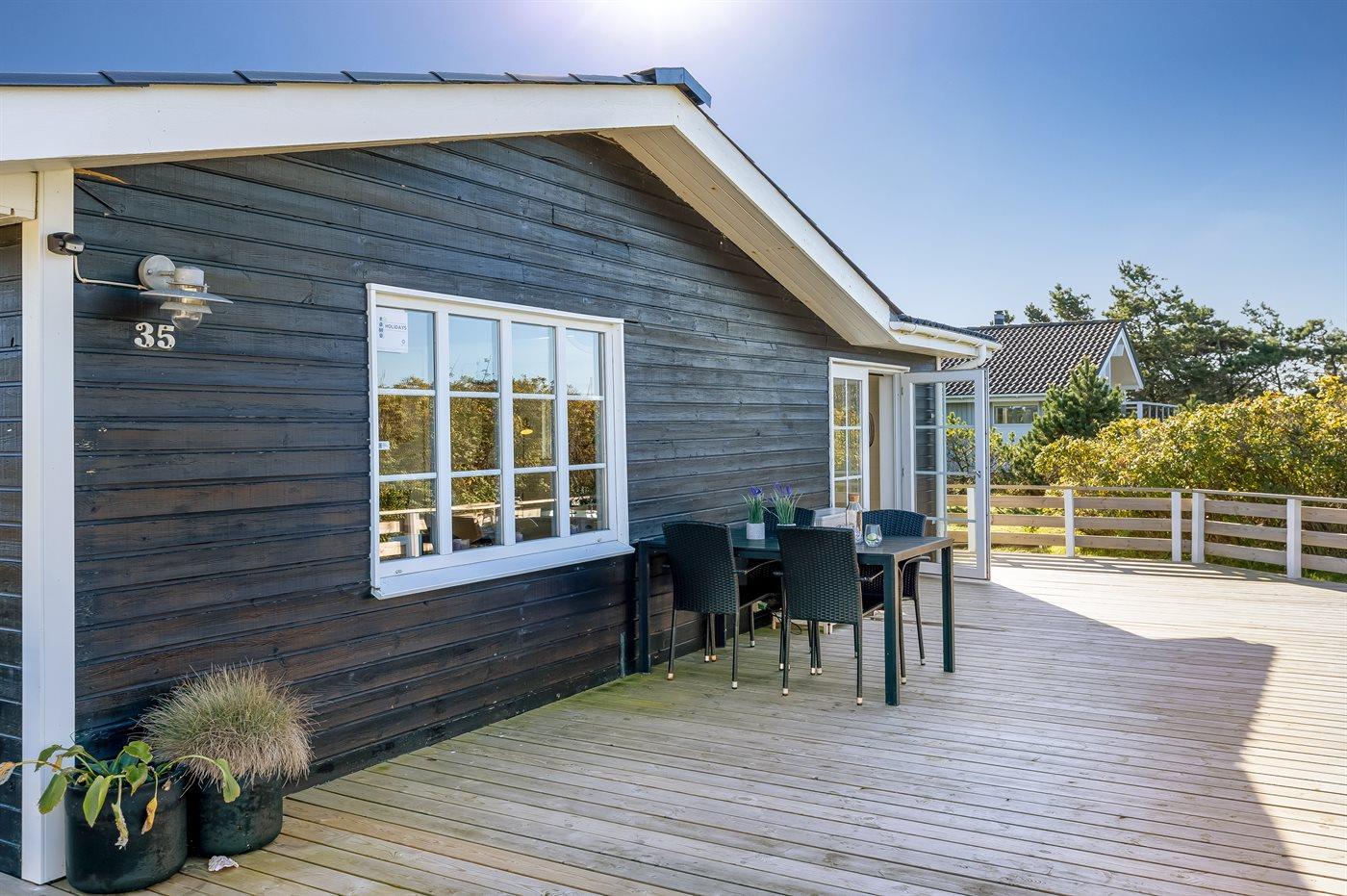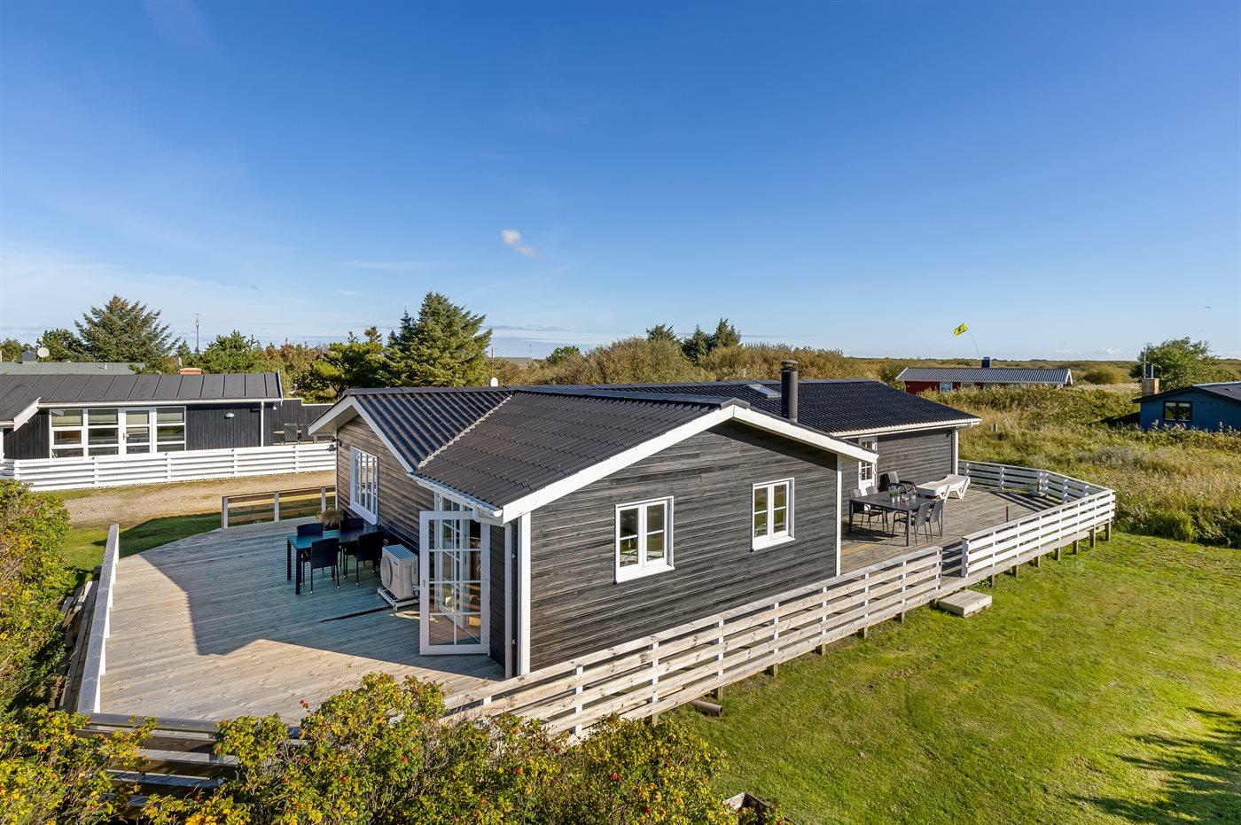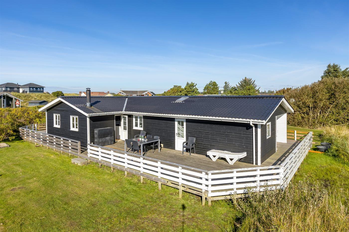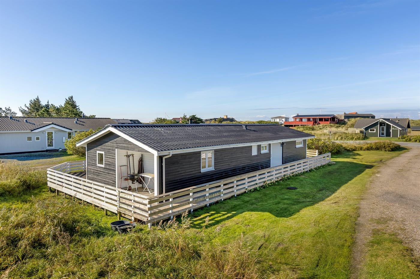 Kun 500 m fra den dejlige strand finder I dette flotte sommerhus. Huset er omgivet af et dejligt, stort og delvist overdækket terrasseareal med havemøbler.