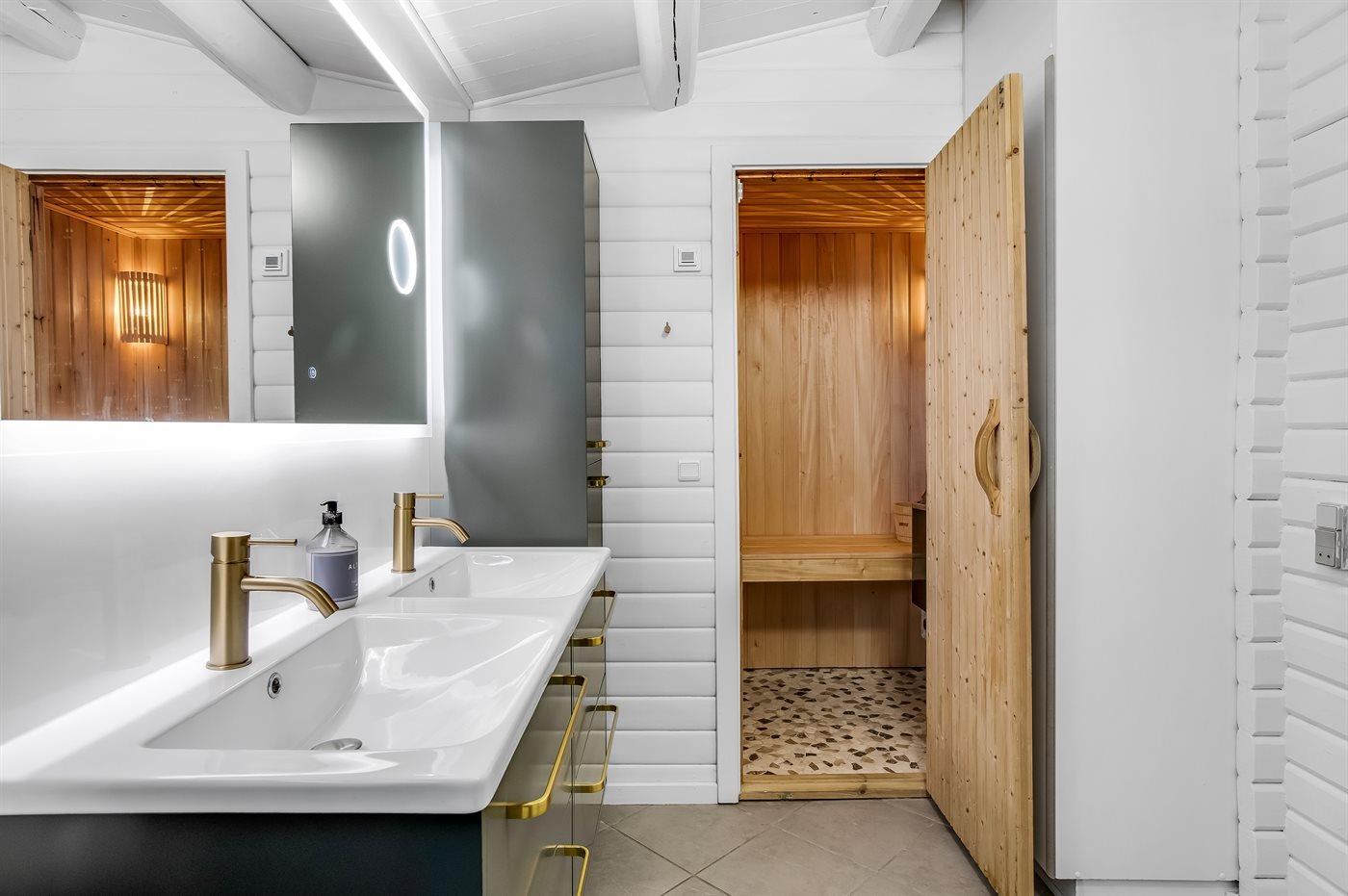 Der er 1 badeværelse med bruseniche med bruser og 1 toilet.. Der er gulvvarme på 1 badeværelse. I saunaen er der mulighed for afslapning.