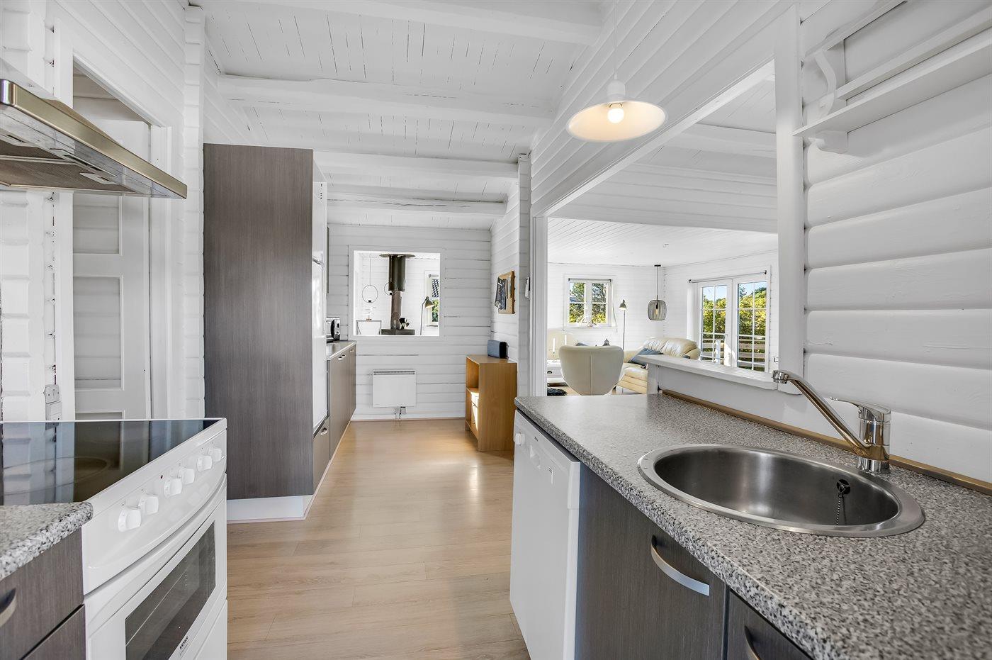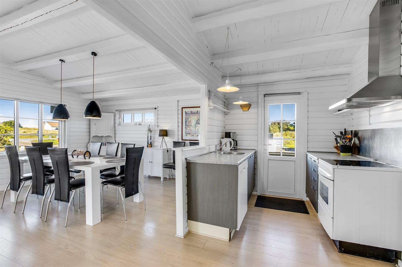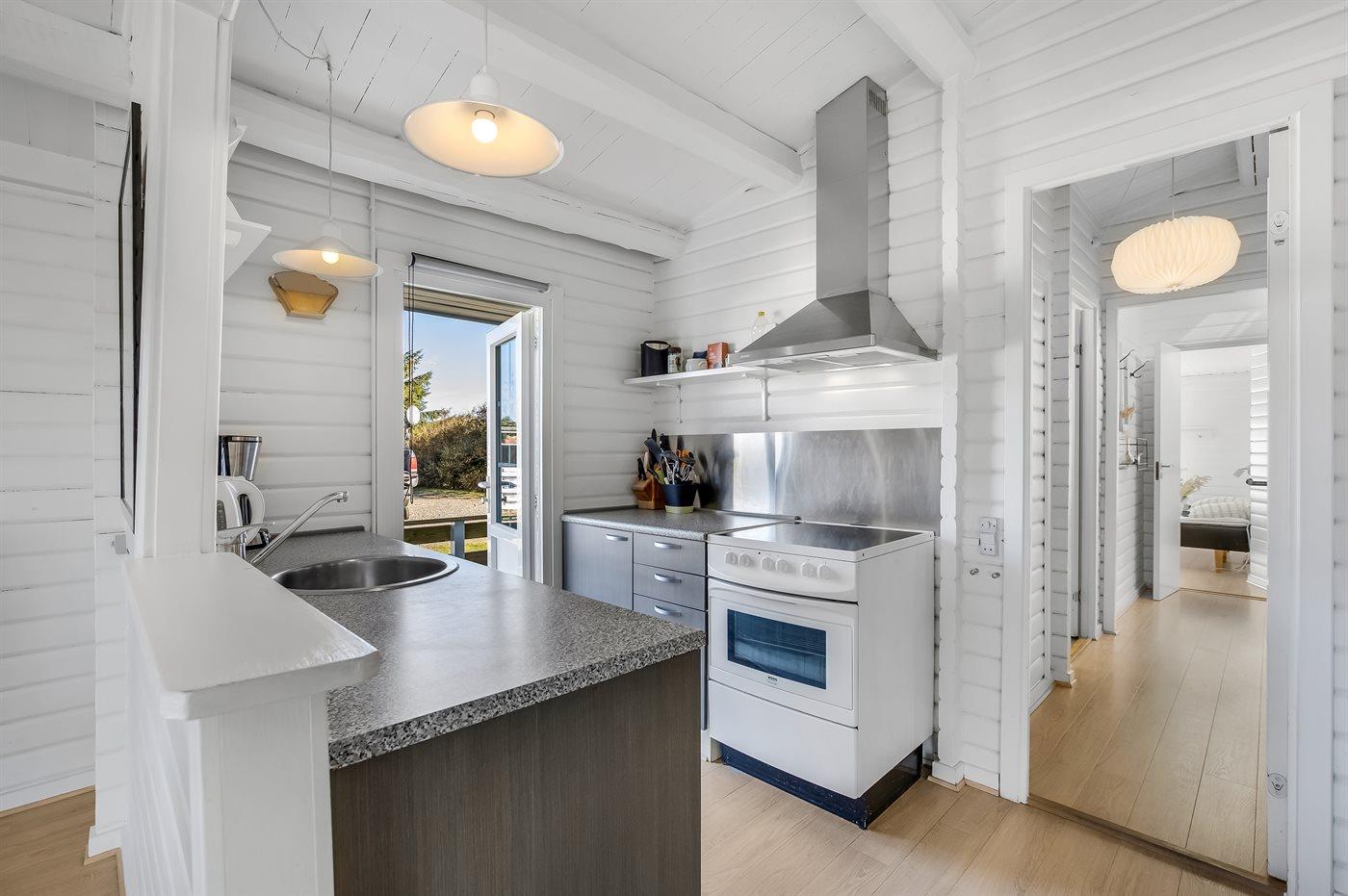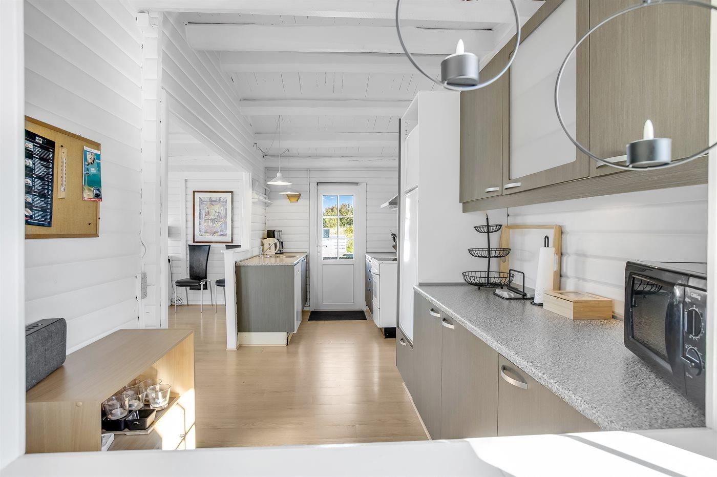 Køkkenet er udstyret med 1 køleskab. Der er 4 elkogeplader, bageovn, mikrobølgeovn samt opvaskemaskine.