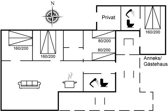 Et godt sommerhus, som er indrettet med åbent køkken-alrum, 4 soveværelser, hvoraf 1 befinder sig i et anneks samt 2 badeværelser.