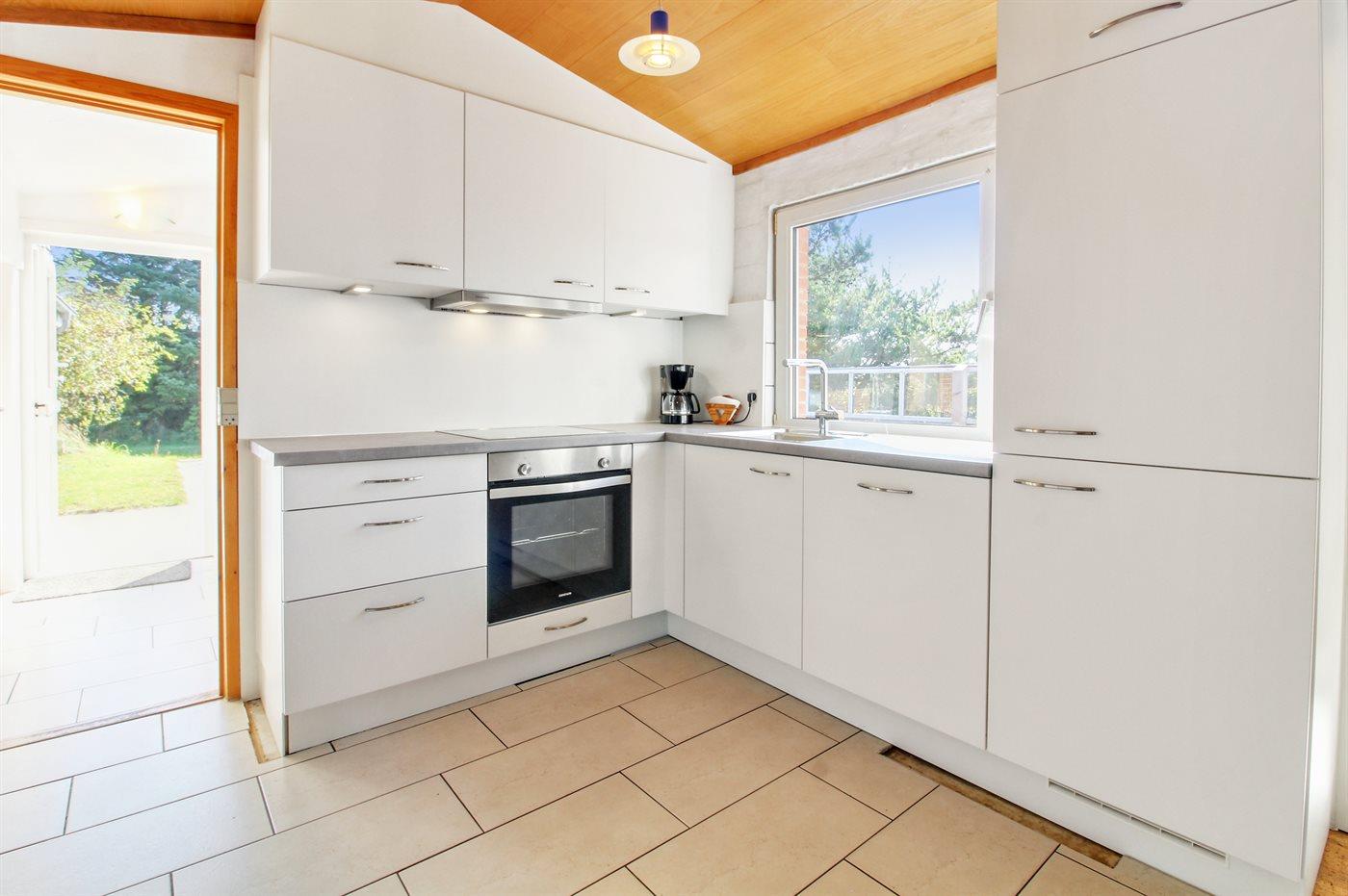 Køkkenet er udstyret med 1 køleskab. Der er 4 keramiske kogeplader, varmluftovn samt opvaskemaskine.